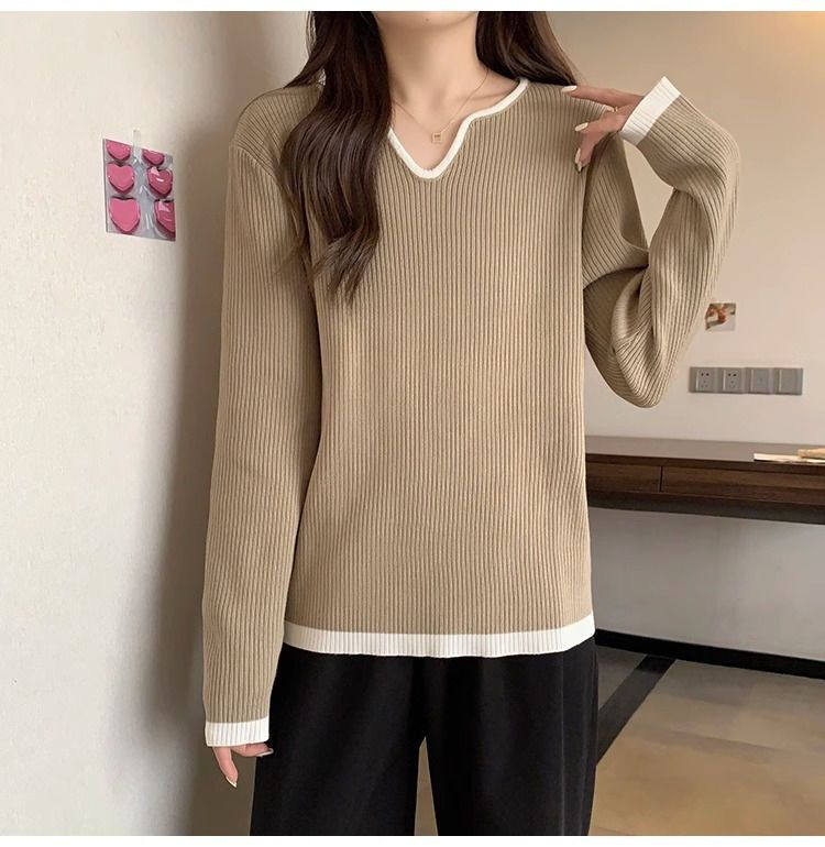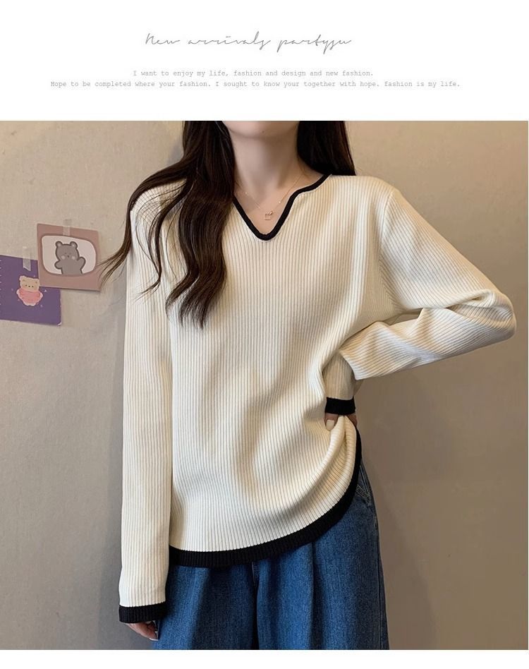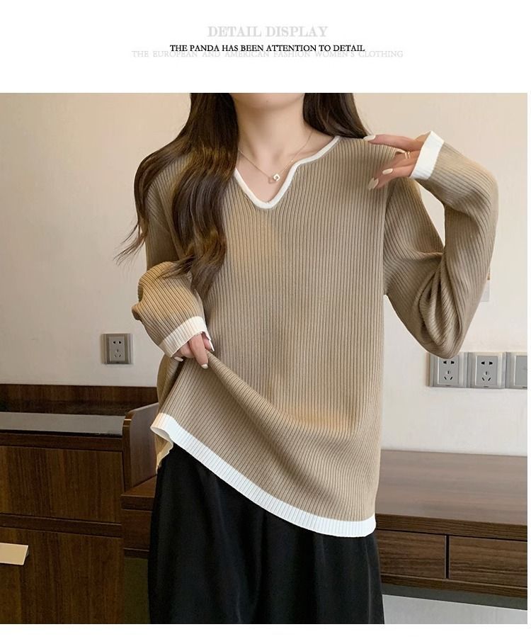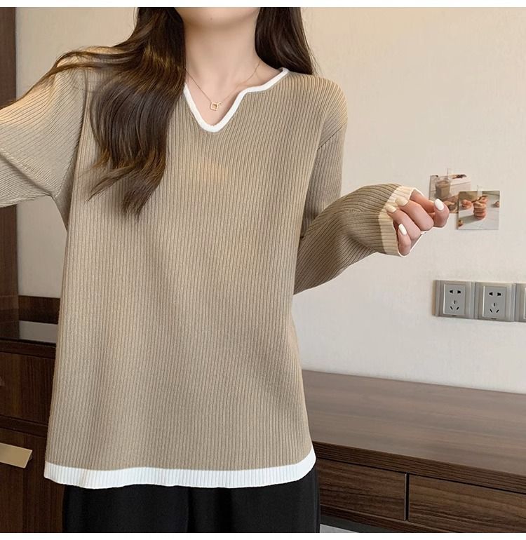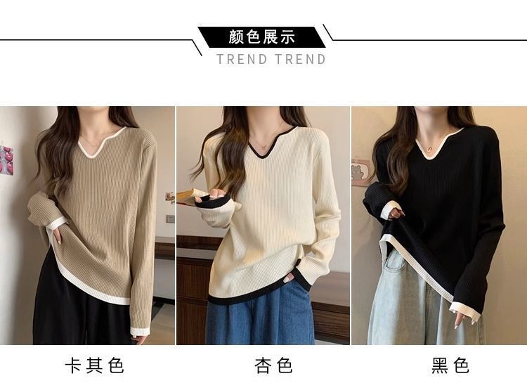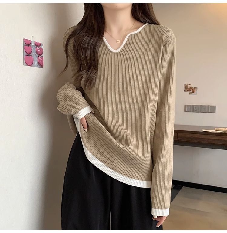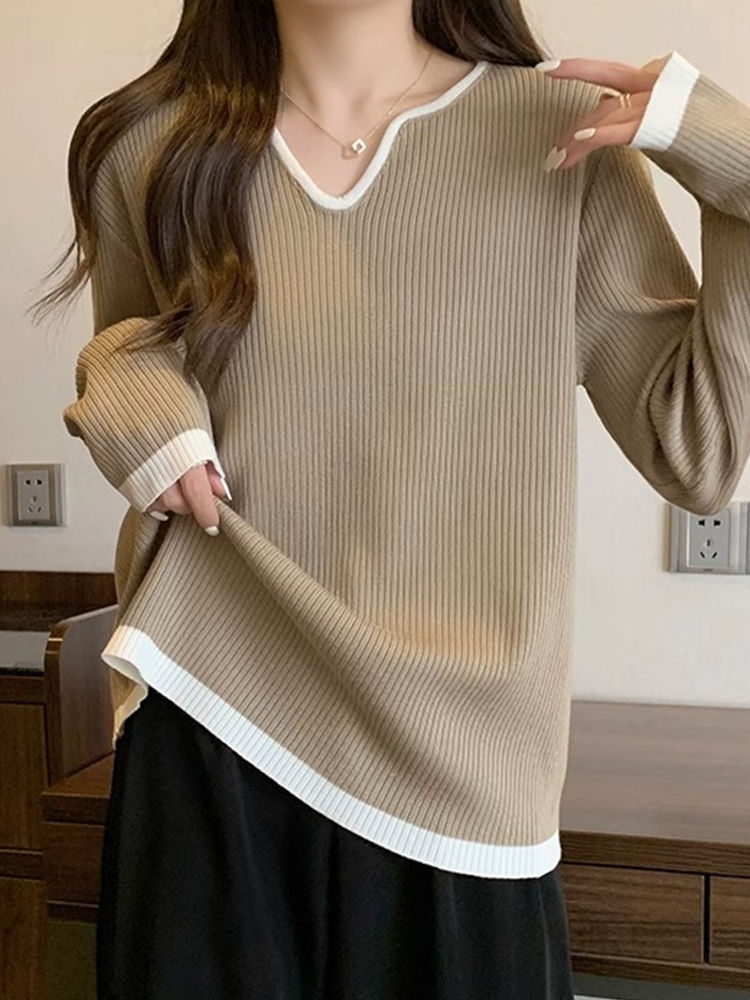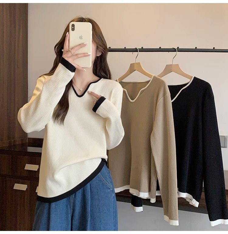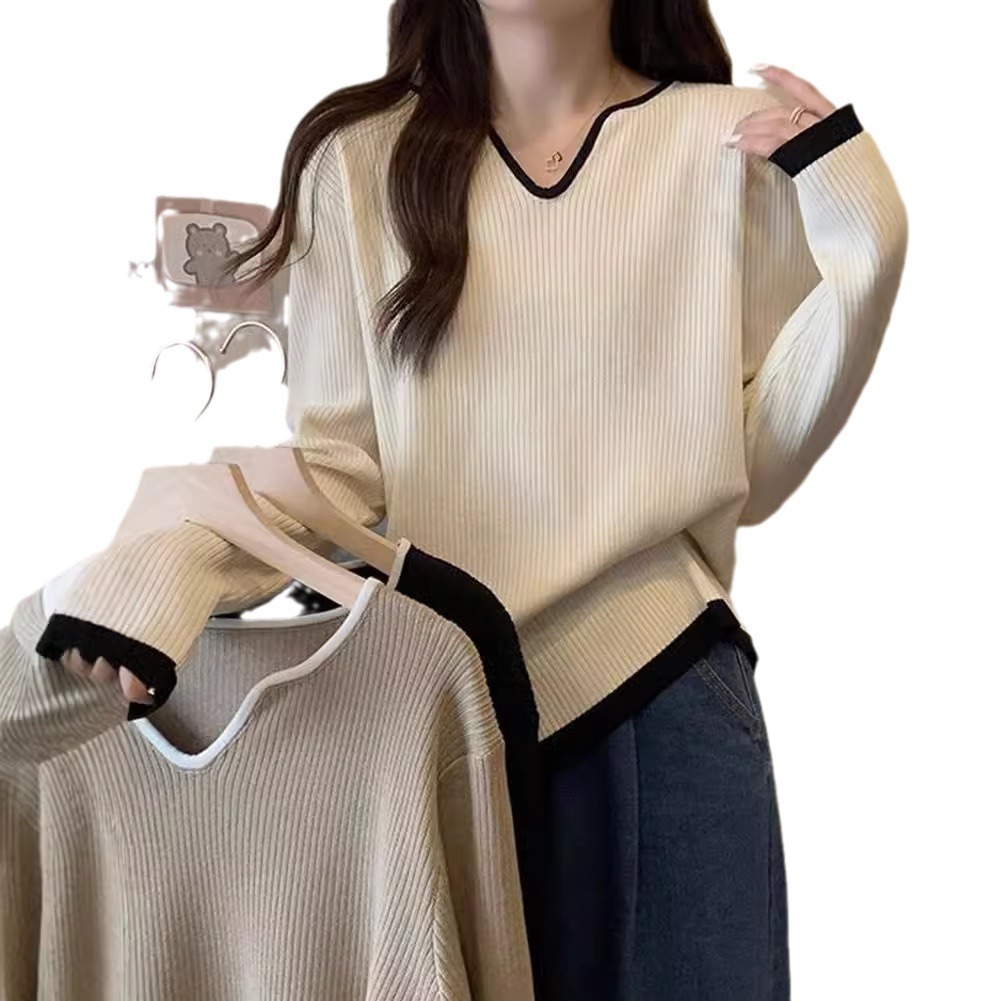 Женская футболка больших размеров с уникальным V-образным вырезом и длинными рукавами, новая коллекция весна-осень 2026, свободная, стройнящая, универсальная.