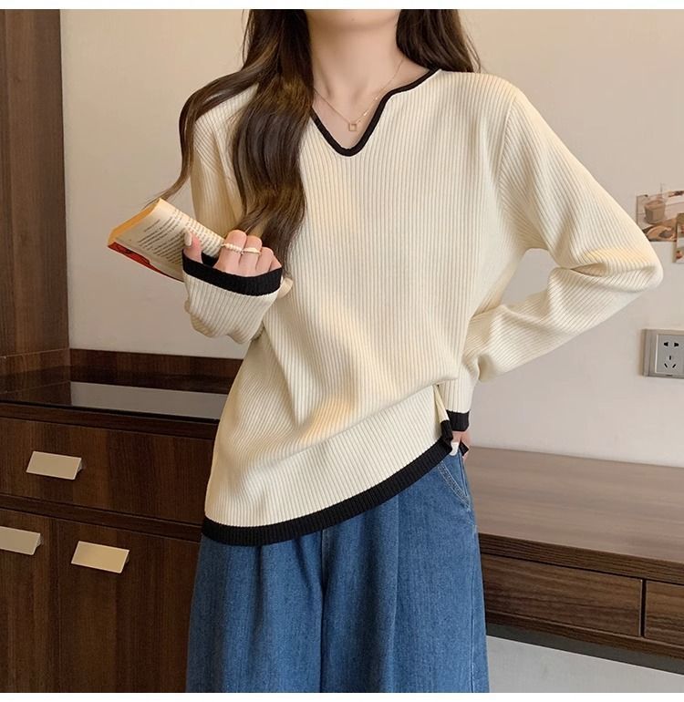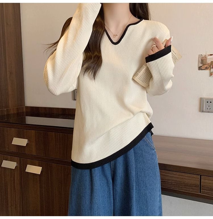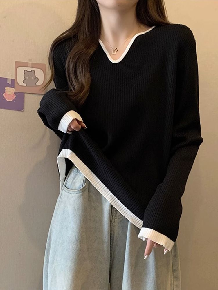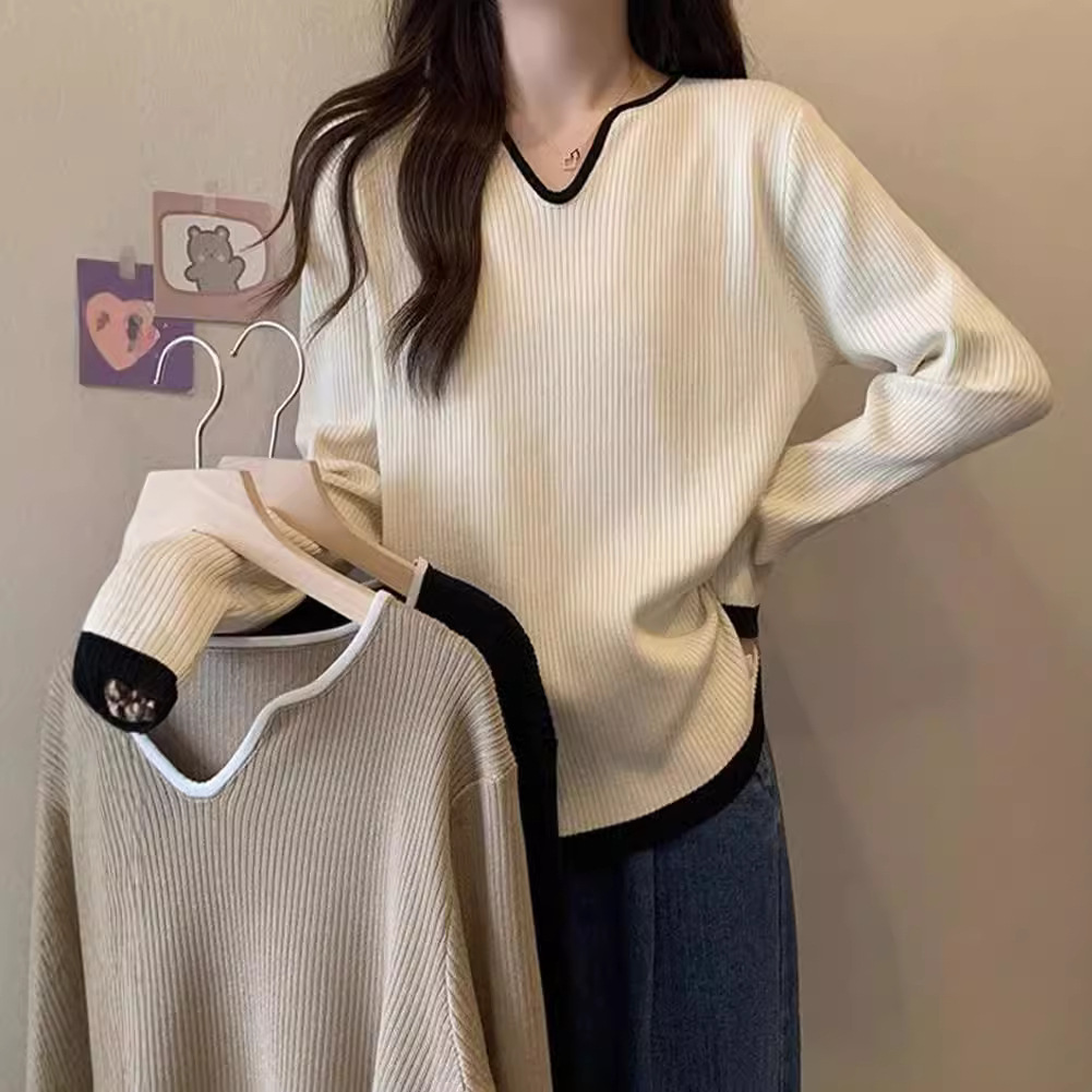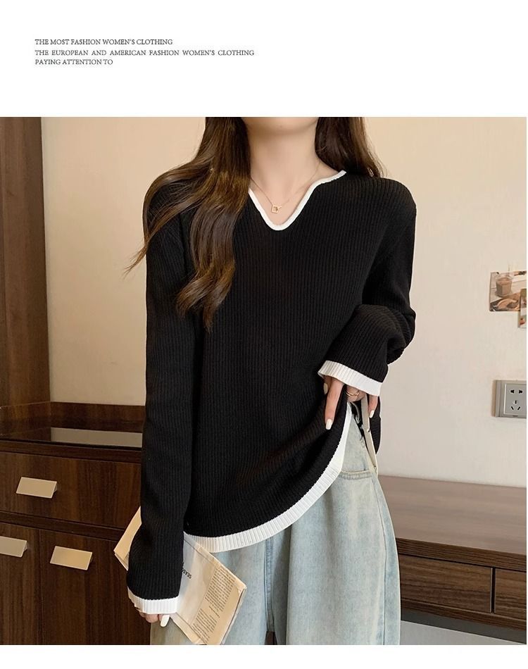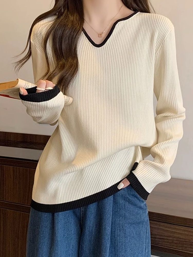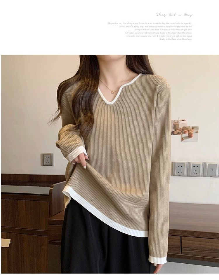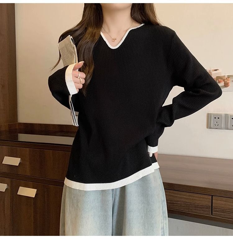 Женская футболка больших размеров с уникальным V-образным вырезом и длинными рукавами, новая коллекция весна-осень 2026, свободная, стройнящая, универсальная.