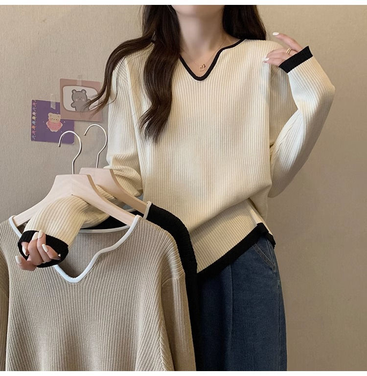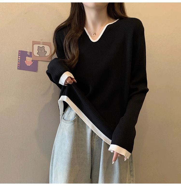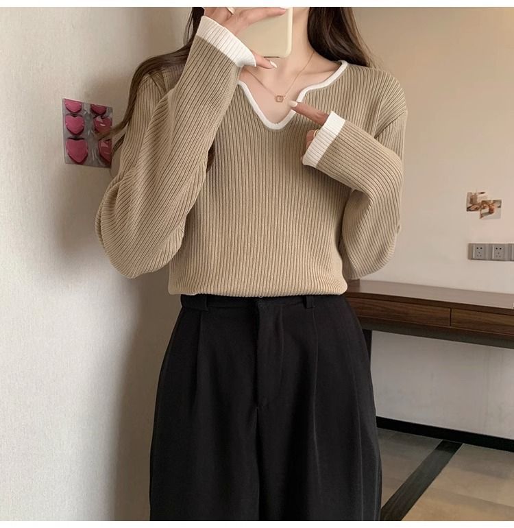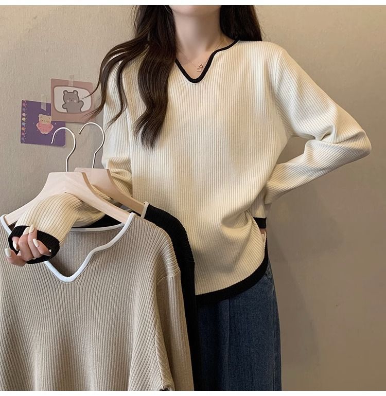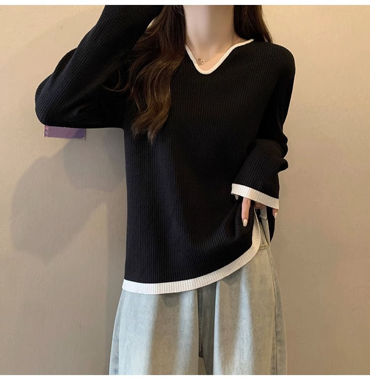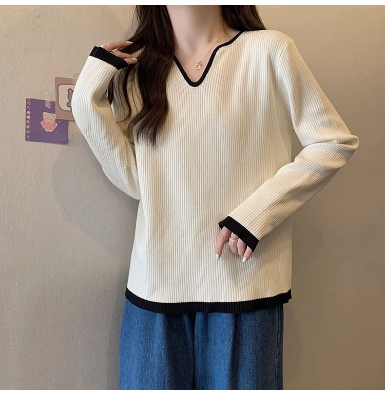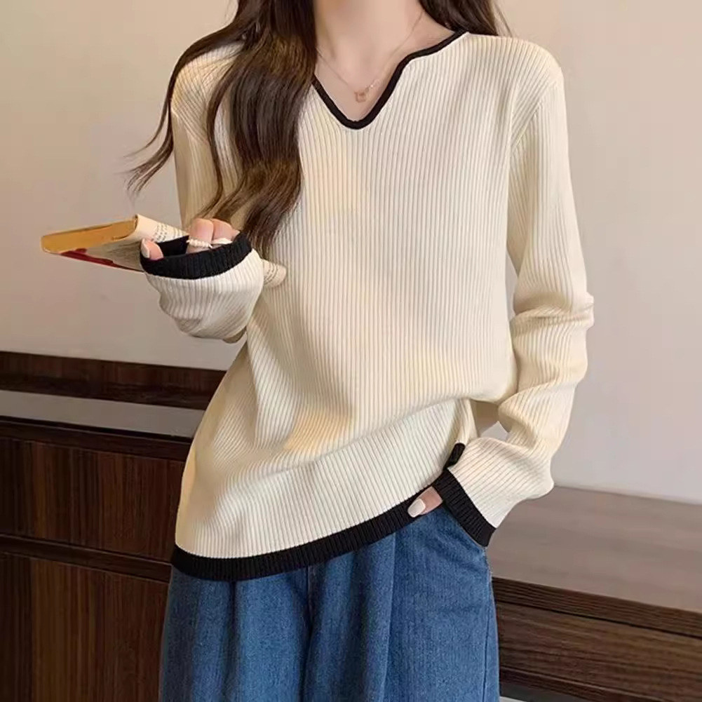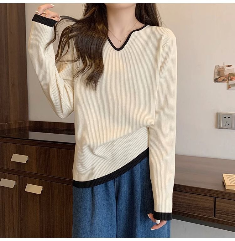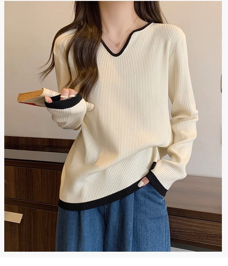 Женская футболка больших размеров с уникальным V-образным вырезом и длинными рукавами, новая коллекция весна-осень 2026, свободная, стройнящая, универсальная.