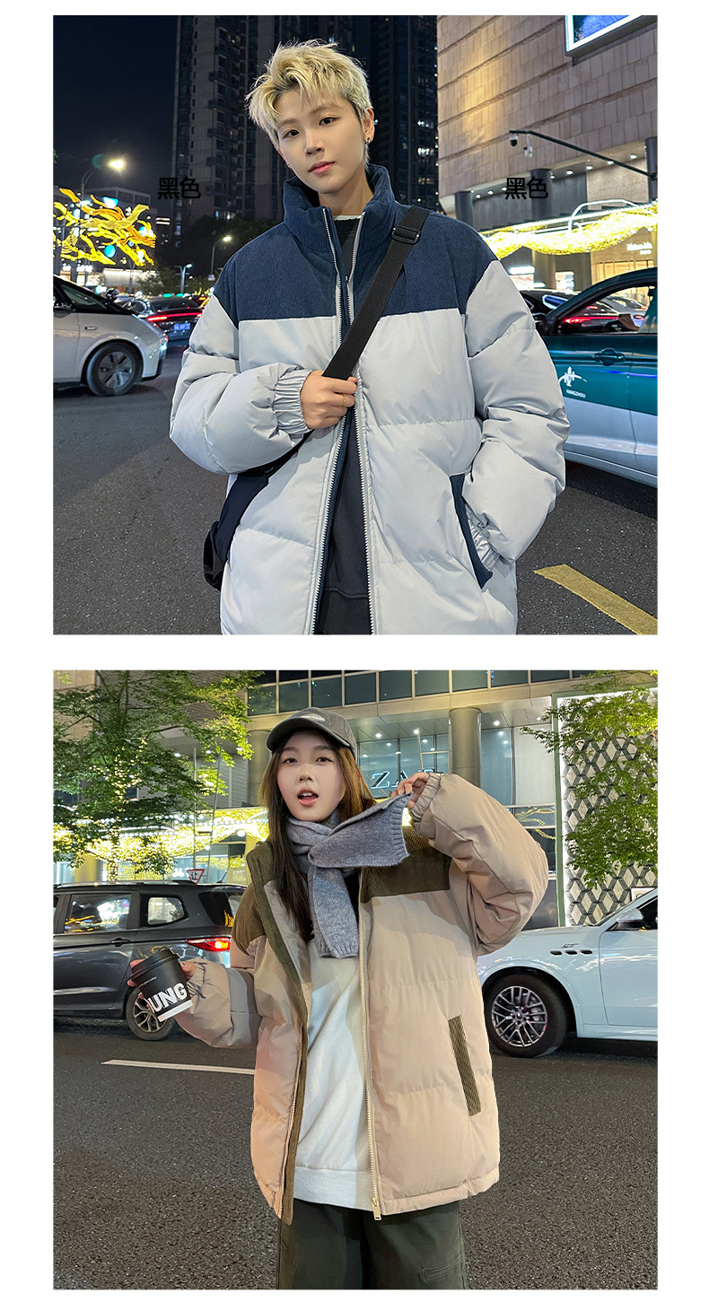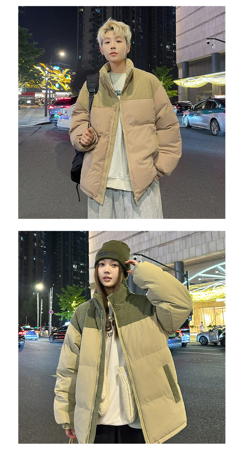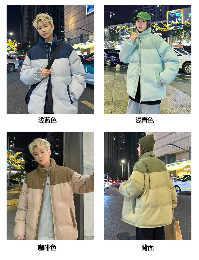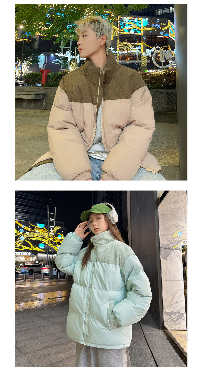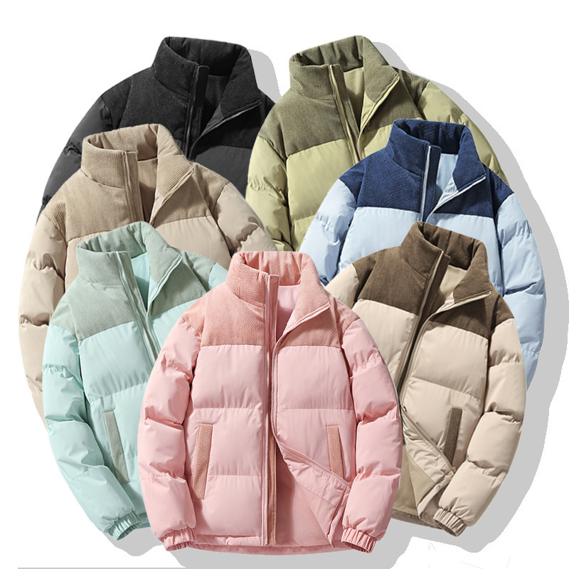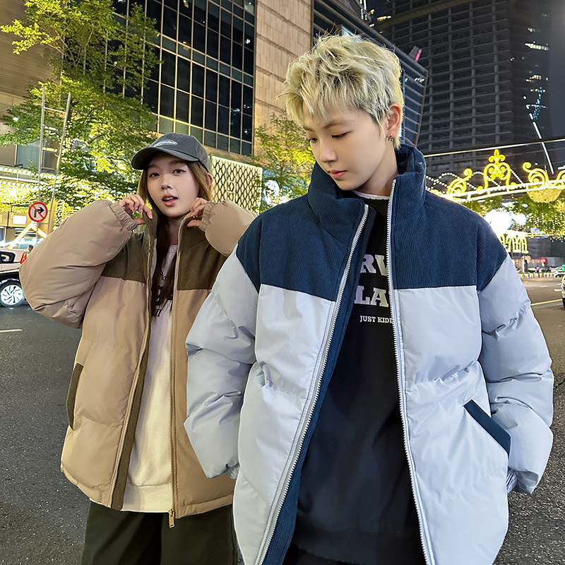 Модная куртка-пуховик унисекс из вельвета с цветовыми блоками и воротником-стойкой, осенне-зимняя мужская хлопковая одежда, трендовый корейский стиль