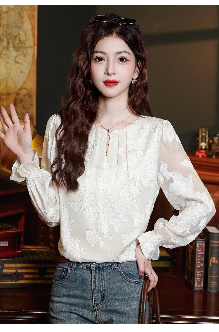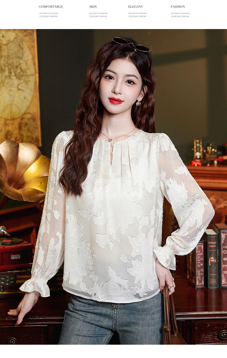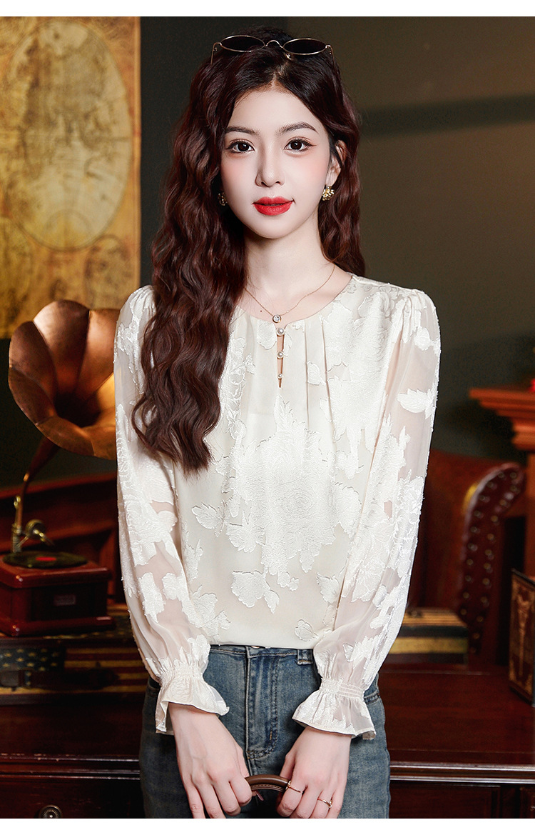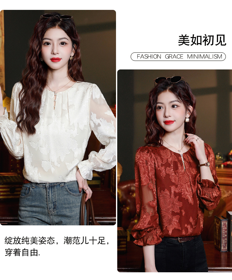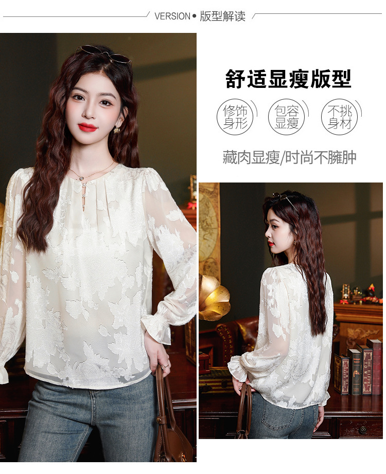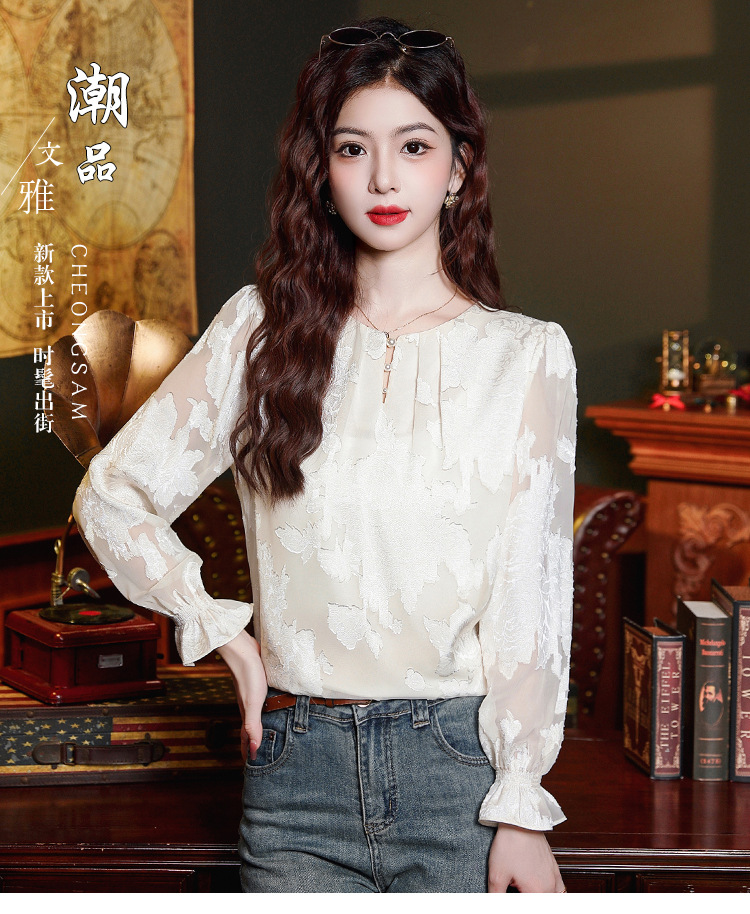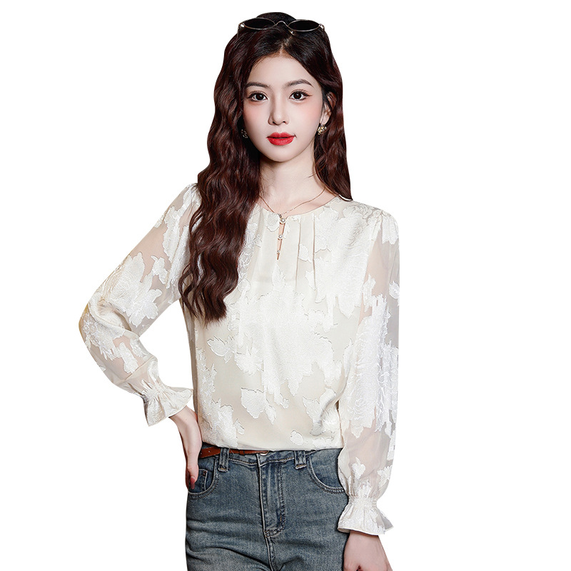 Рубашка с круглым вырезом из жаккарда шифоновая блузка 2025 осенний костюм новый свободный живот