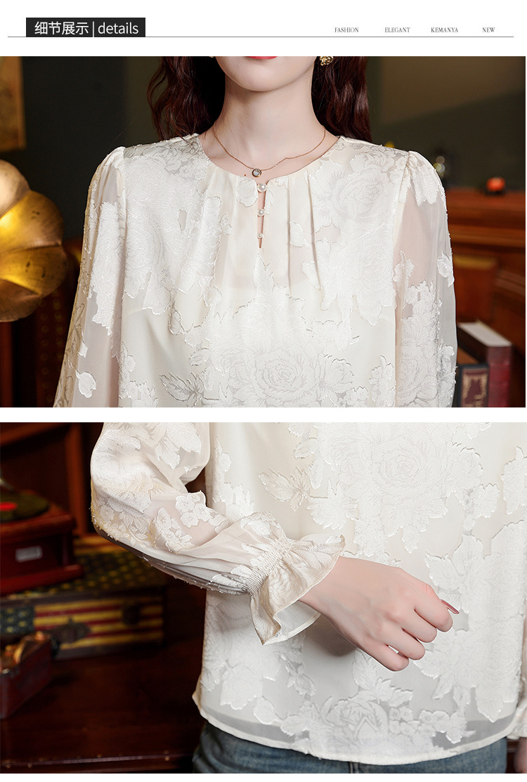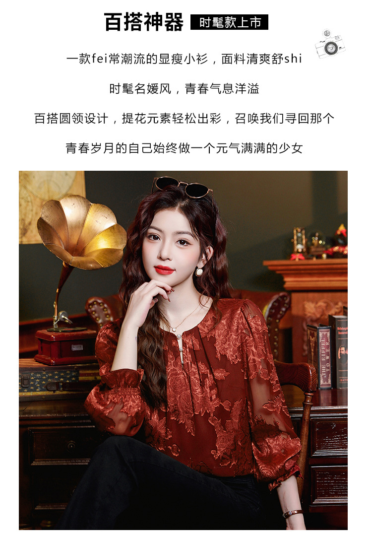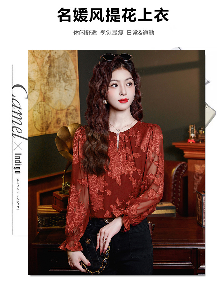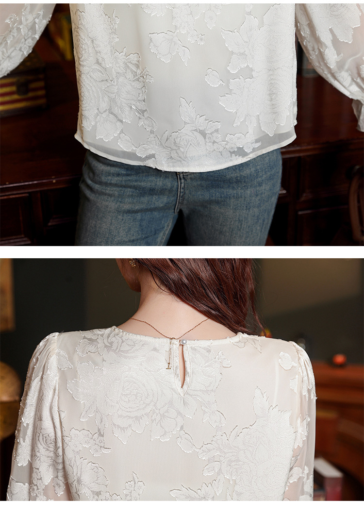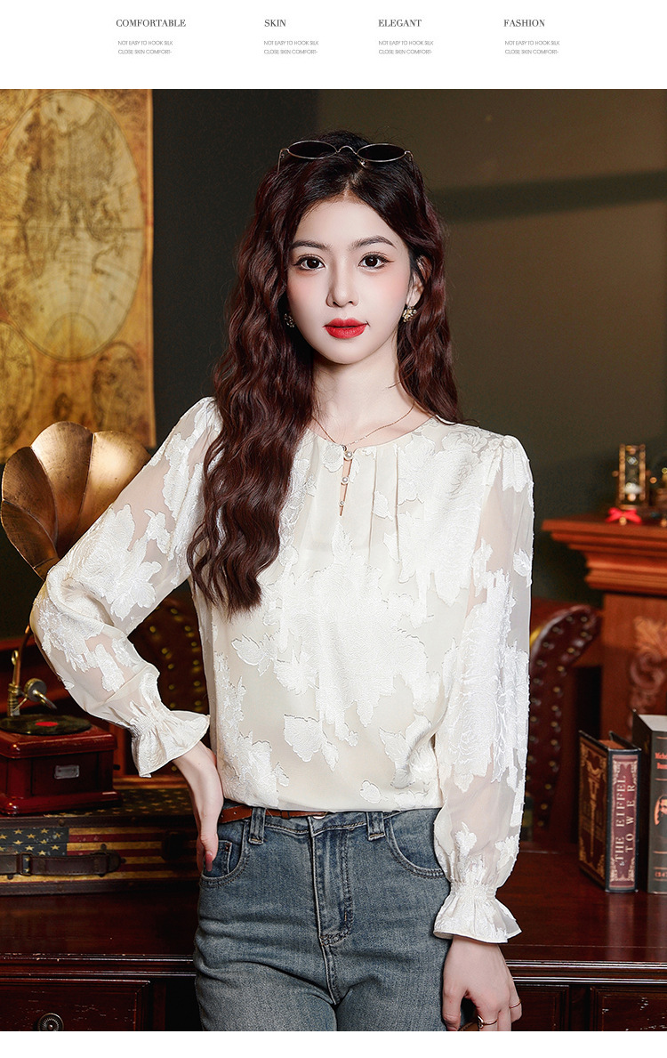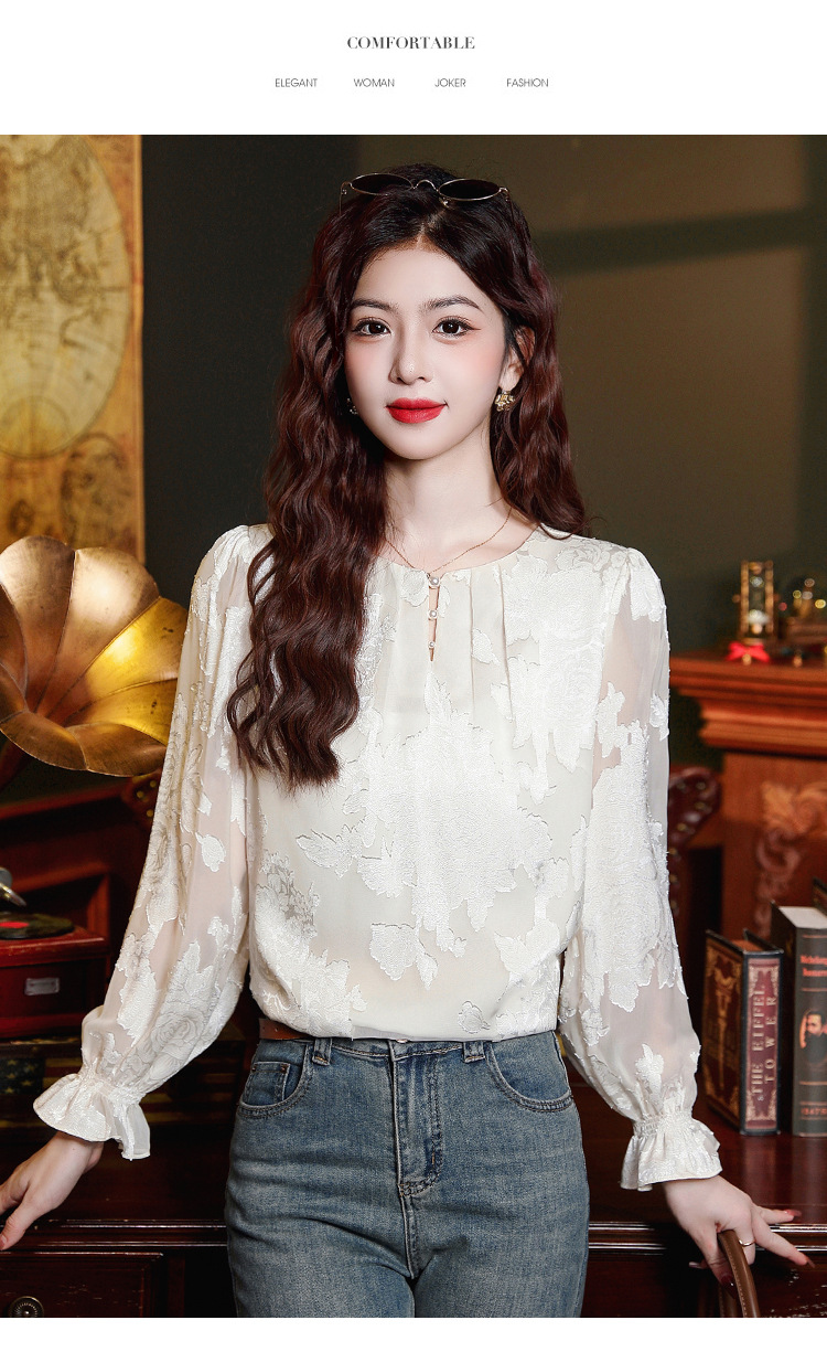 Рубашка с круглым вырезом из жаккарда шифоновая блузка 2025 осенний костюм новый свободный живот