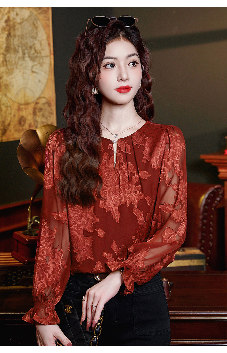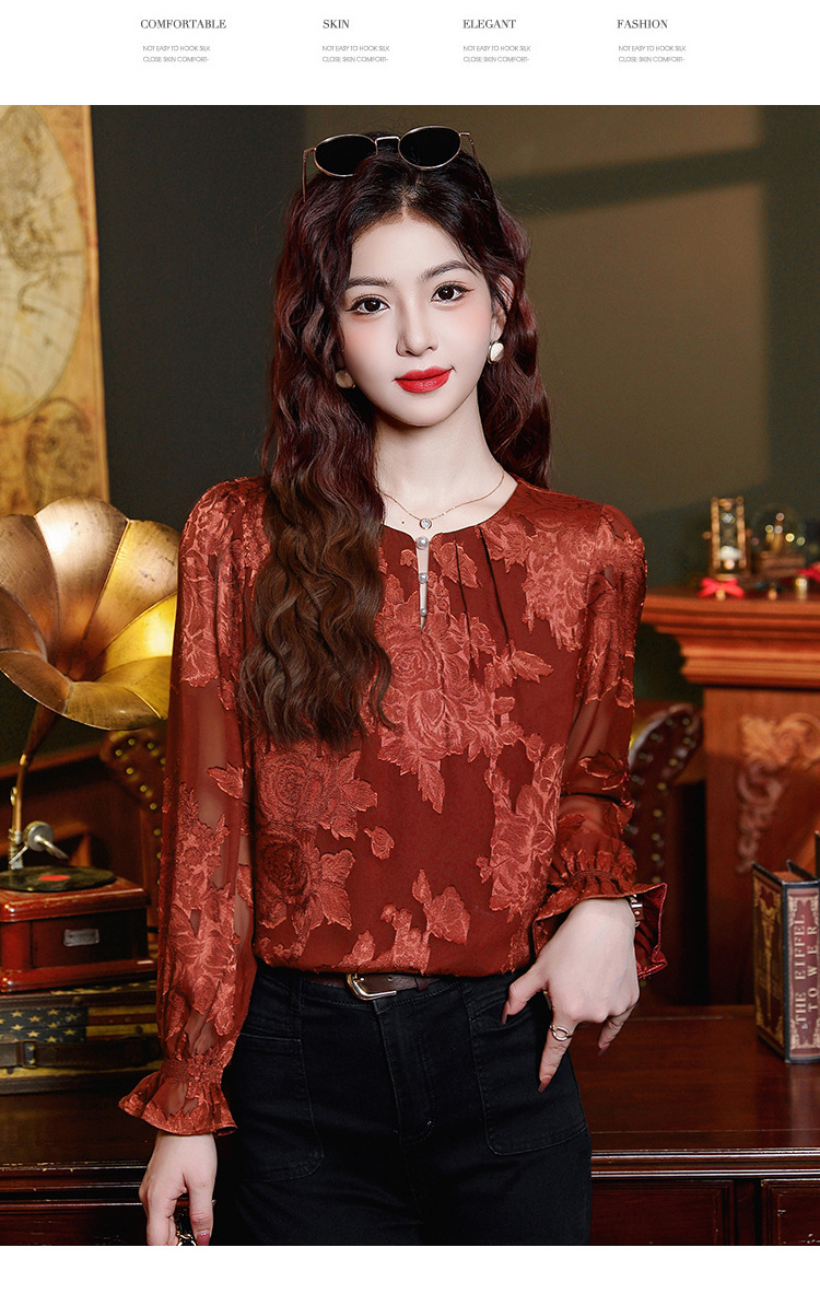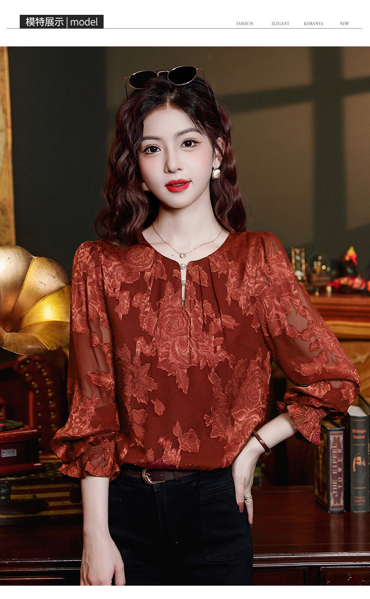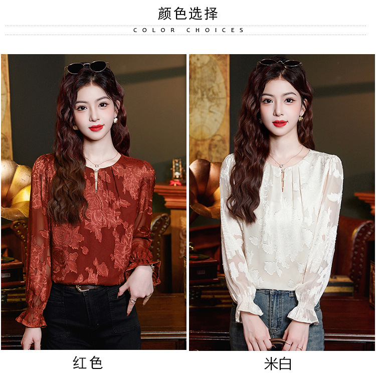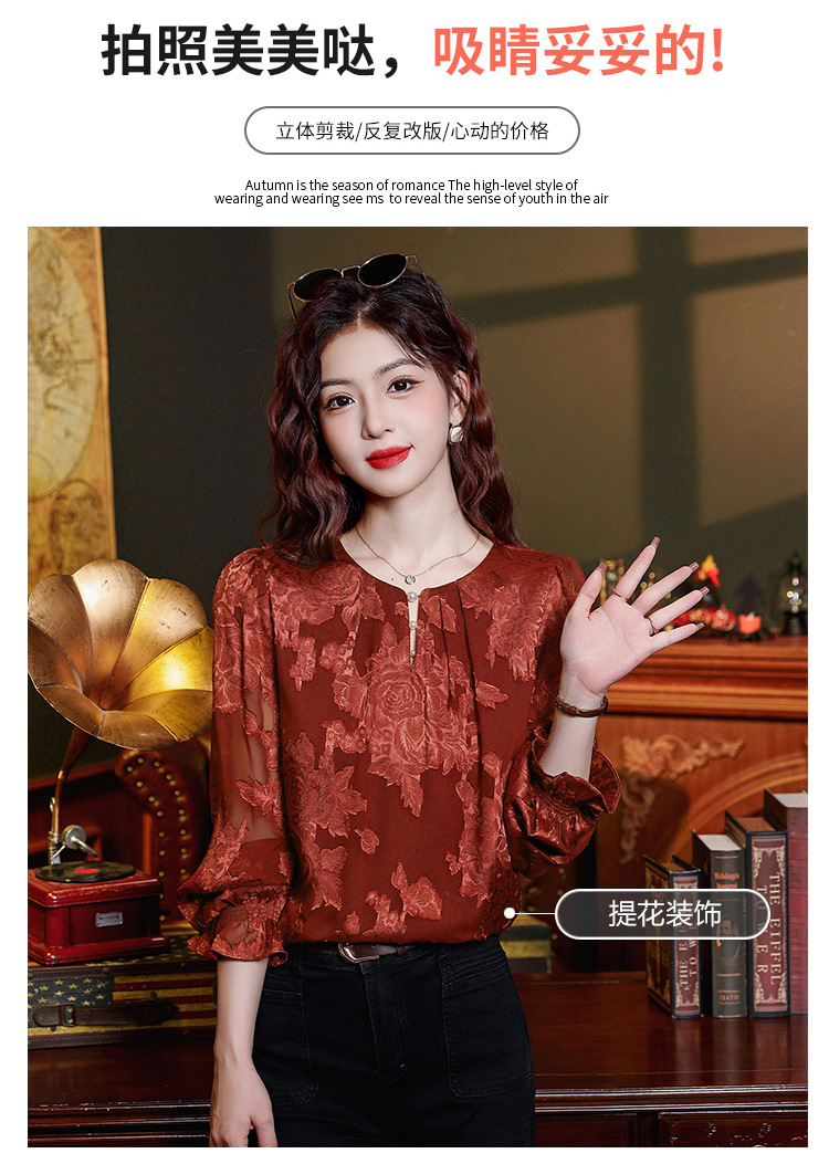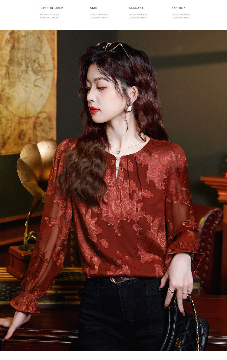 Рубашка с круглым вырезом из жаккарда шифоновая блузка 2025 осенний костюм новый свободный живот