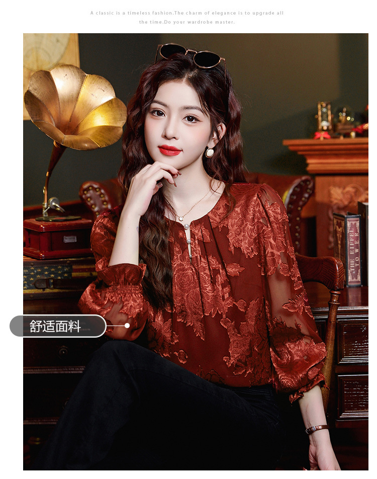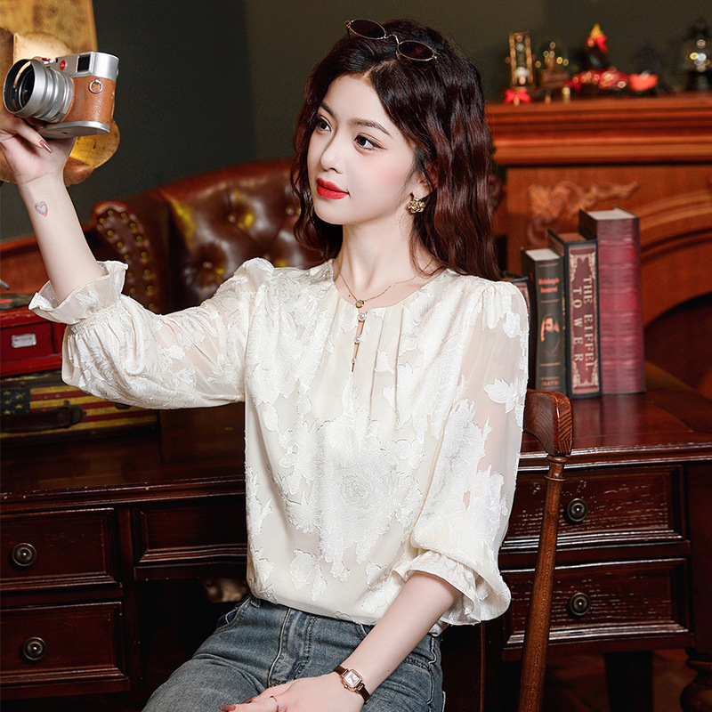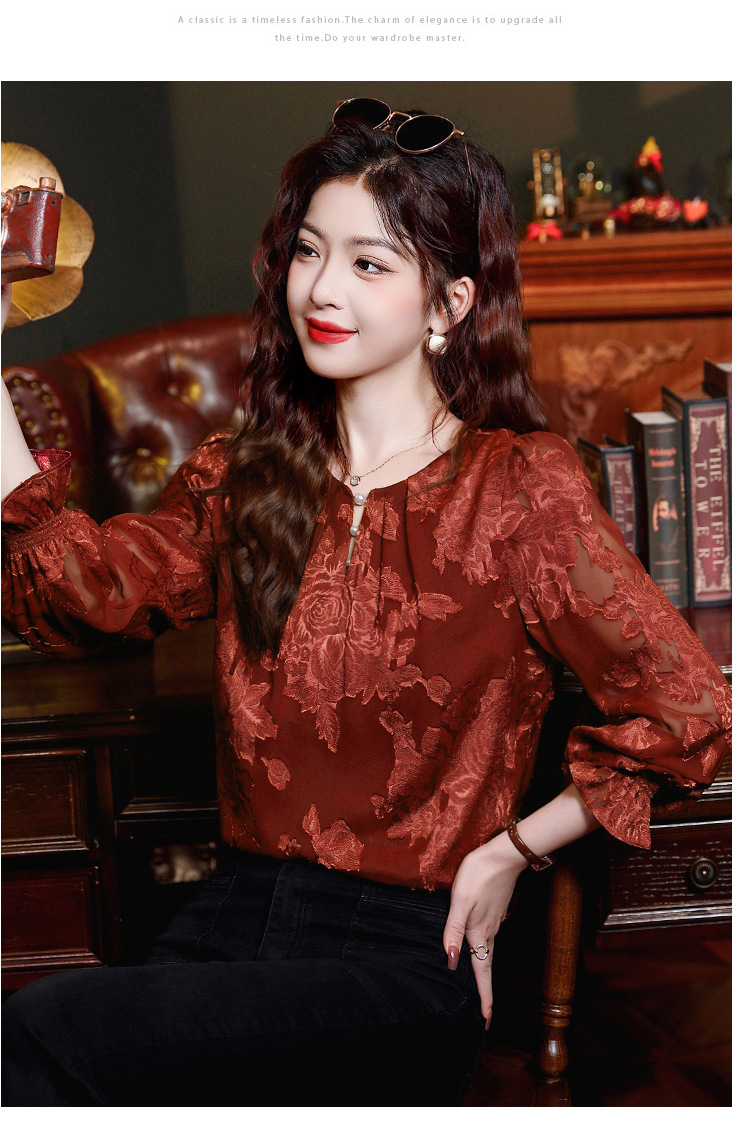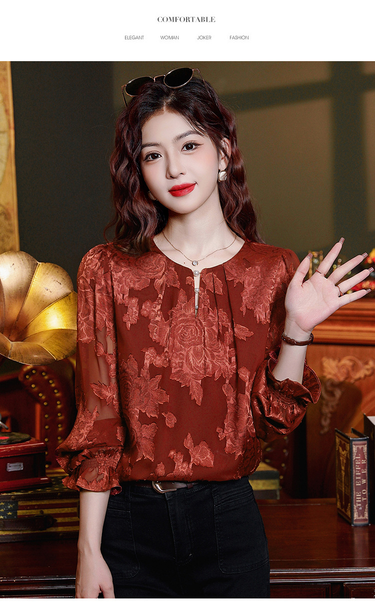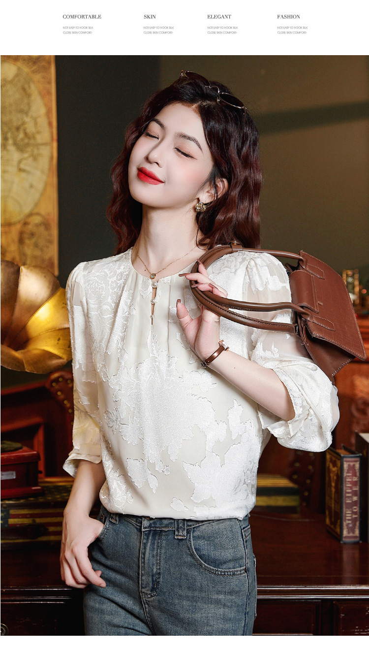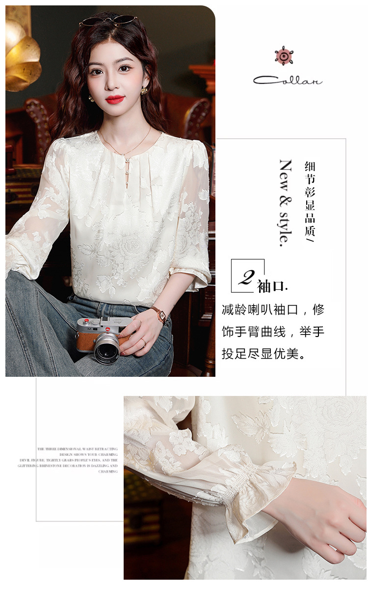 Рубашка с круглым вырезом из жаккарда шифоновая блузка 2025 осенний костюм новый свободный живот