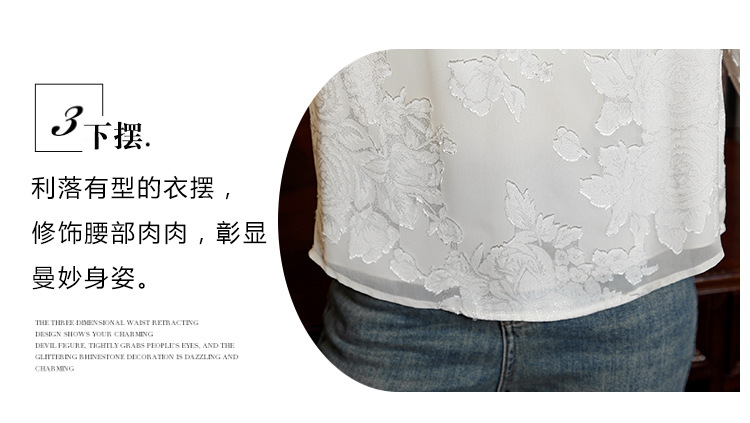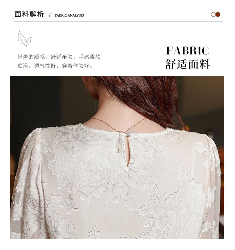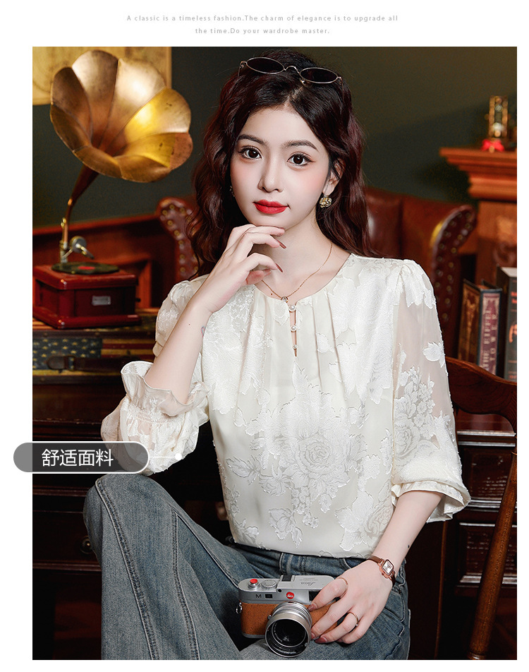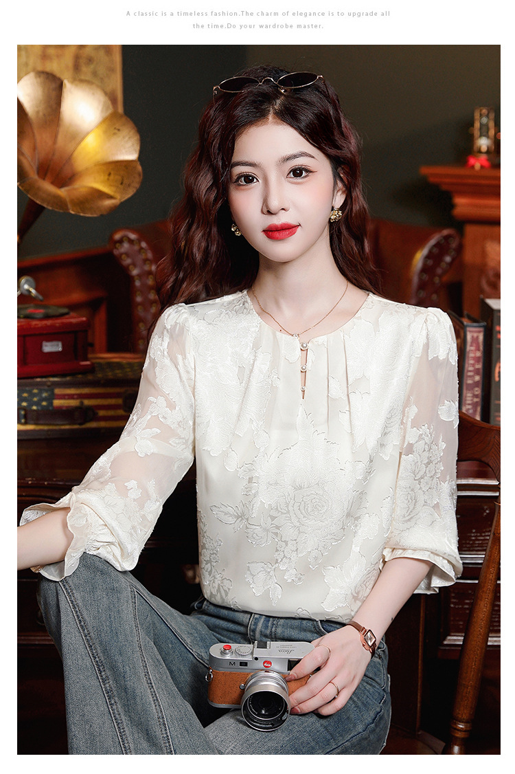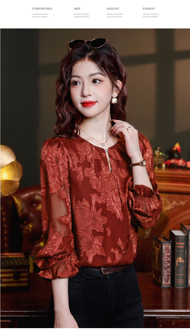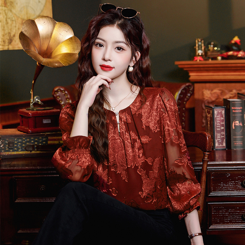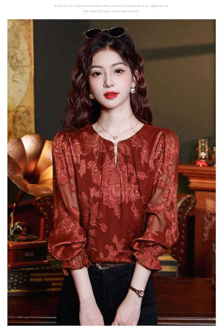 Рубашка с круглым вырезом из жаккарда шифоновая блузка 2025 осенний костюм новый свободный живот