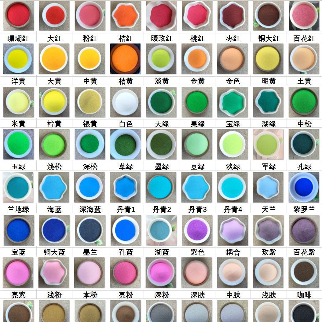 коралловый красный; ярко-красный; розовый; розовый; теплая роза красная; бордовый; медно-красный; оранжевый; цветок красный; большой зеленый; фруктово-зеленый; королевский зеленый; Нефритовый зеленый; Бобовая зеленая; светло-зеленый; озер зеленый; глубокая сосна; сосна средняя; неглубокая сосна; военный зеленый; синий зеленый; темно-зеленый; отверстие зеленое; Тяньлан; морской синий; глубокий морской синий; королевский синий; Голубое озеро; отверстие синее; Медь большой синий; Даньцин 1; Даньцин 2; Даньцин 3; Даньцин 4; Моланский; большой желтый; лимонно-желтый; Ярко-желтый; желтый; светло-желтый; оранжевый; золотой; серебристо-желтый; земляно-желтый; Бежевый; фиолетовый; ярко-фиолетовый; розово-фиолетовый; фиолетовый; Голова лотоса; Сто цветов и фиолетовый; темный порошок; светло-розовый; Этот порошок; блестки; Глубокая кожа; средняя кожа; светлая кожа; желто-коричневый; основной цвет; Венеры; кофе; верблюд; белый; черный; темно-серый; светло-серый; серебристо-серый; средний желтый; светло-оранжевый; цвет; трава зеленая; золото; светлый кофе