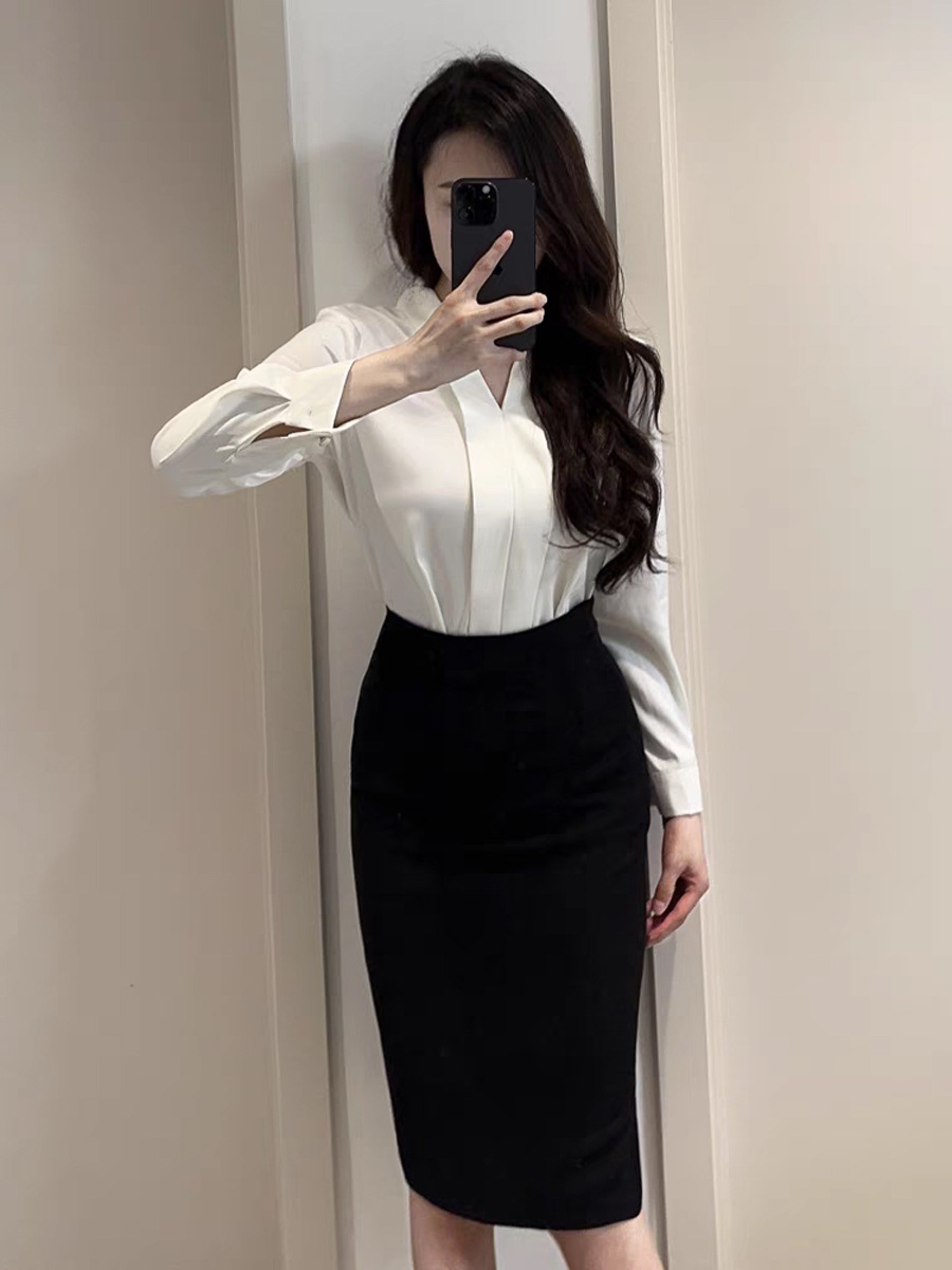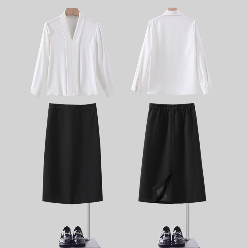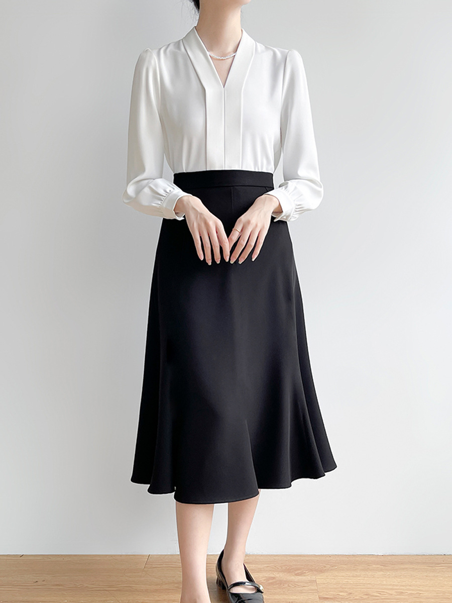 Белая большая рубашка с V-образным вырезом.; Черная маленькая юбка А; Черная большая юбка