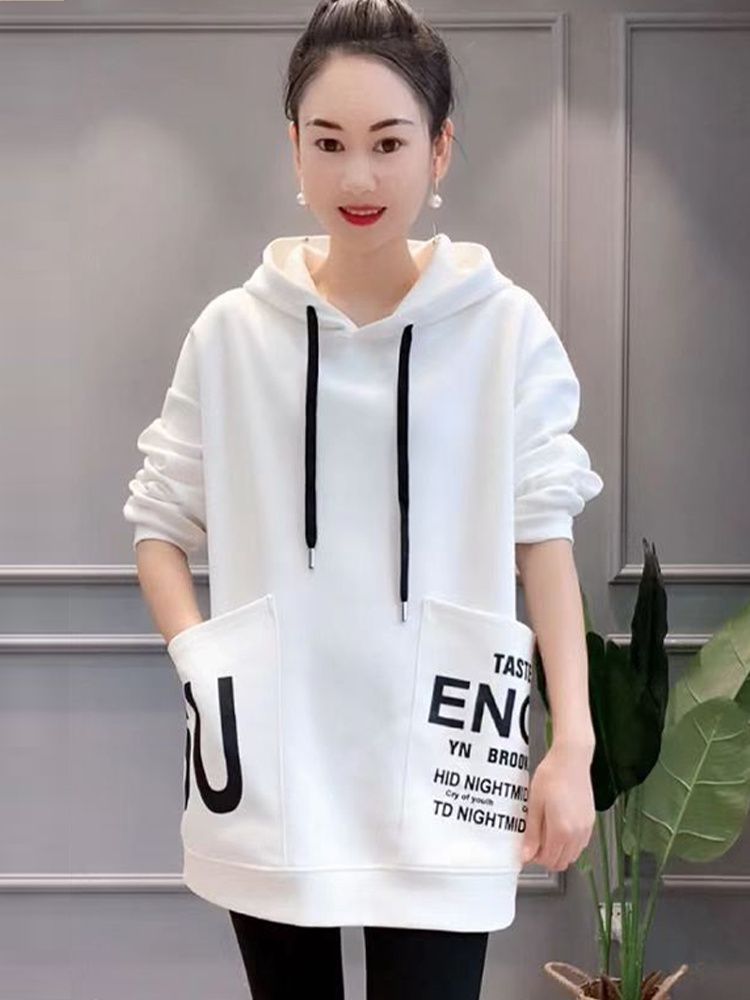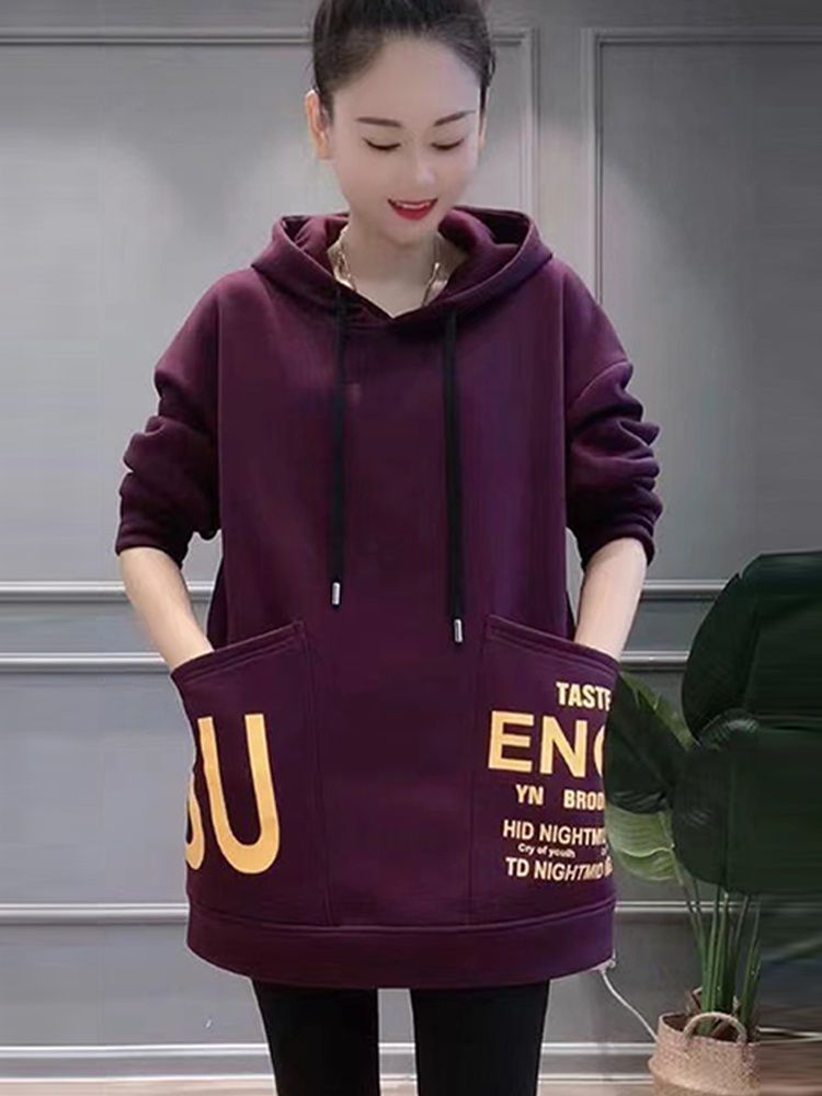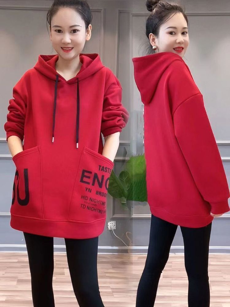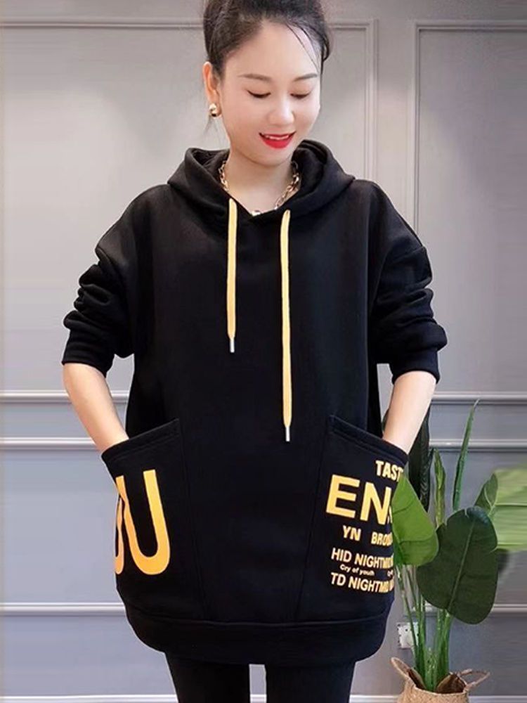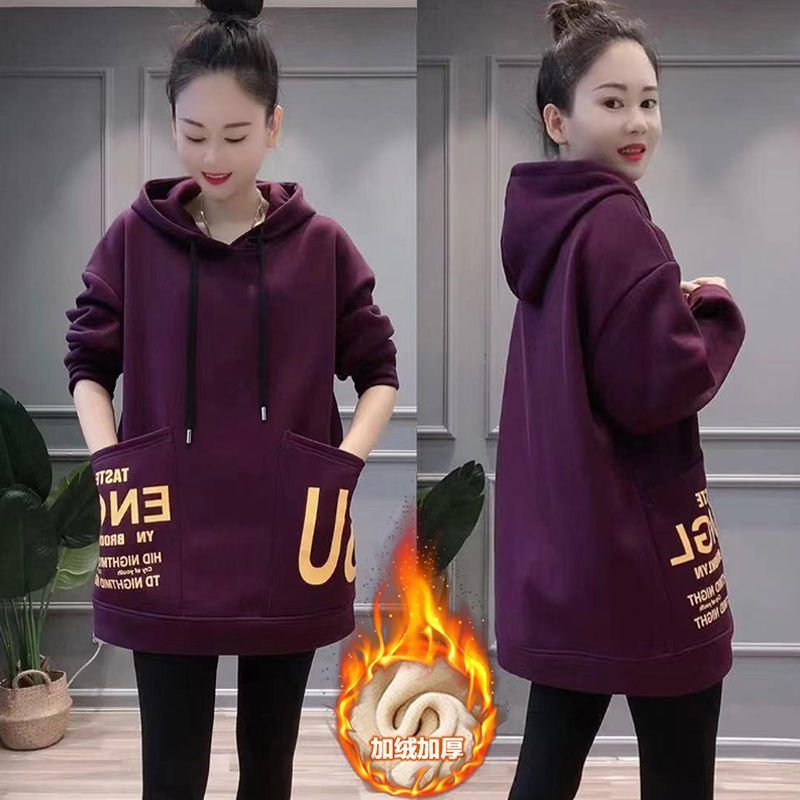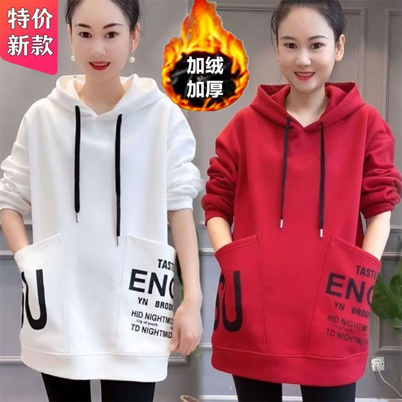 Женская толстовка средней длины на флисовой подкладке, новая зимняя модель с большими карманами, свободный крой в корейском стиле, универсальная повседневная одежда больших размеров для женщин.