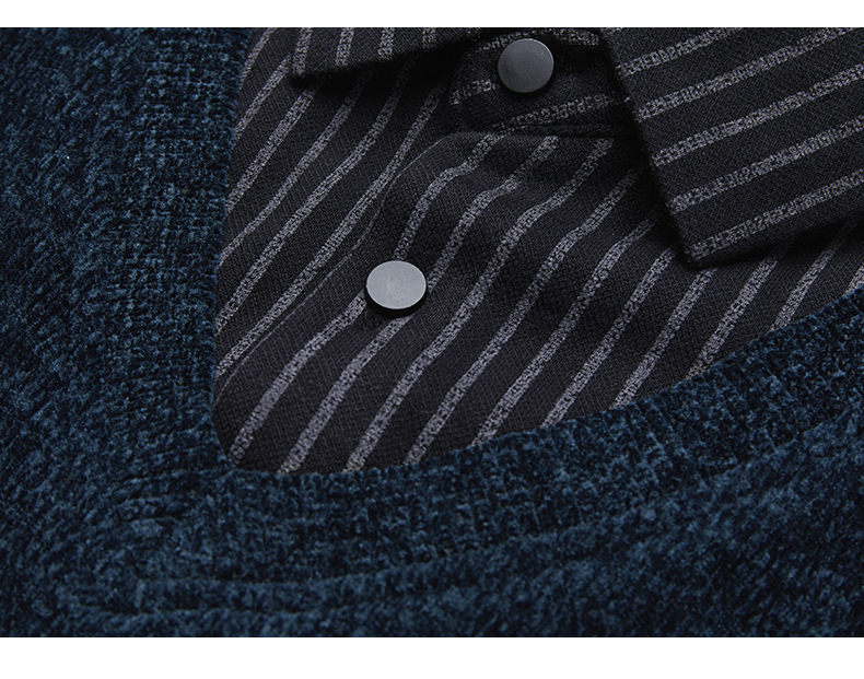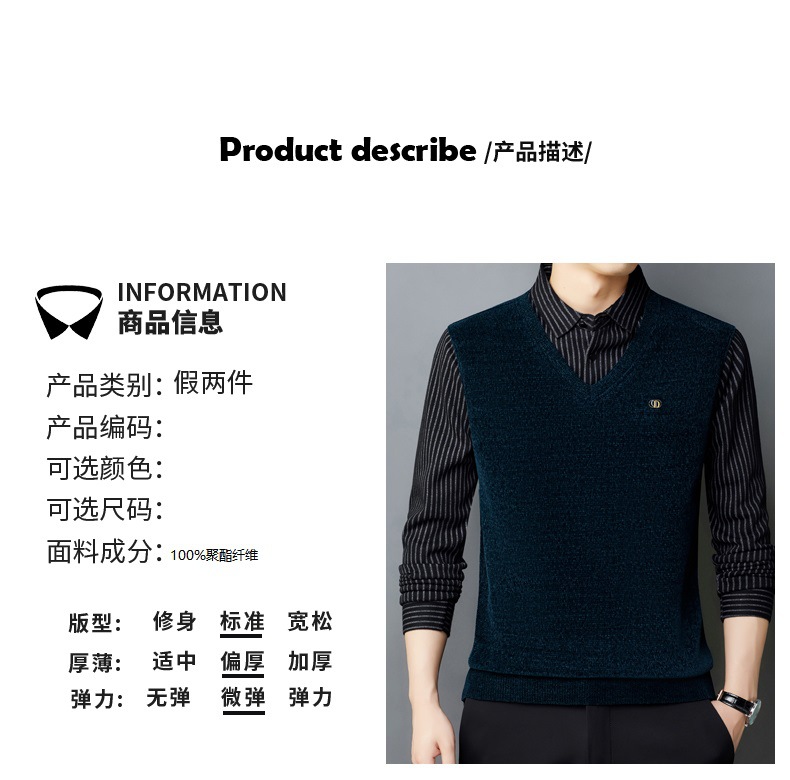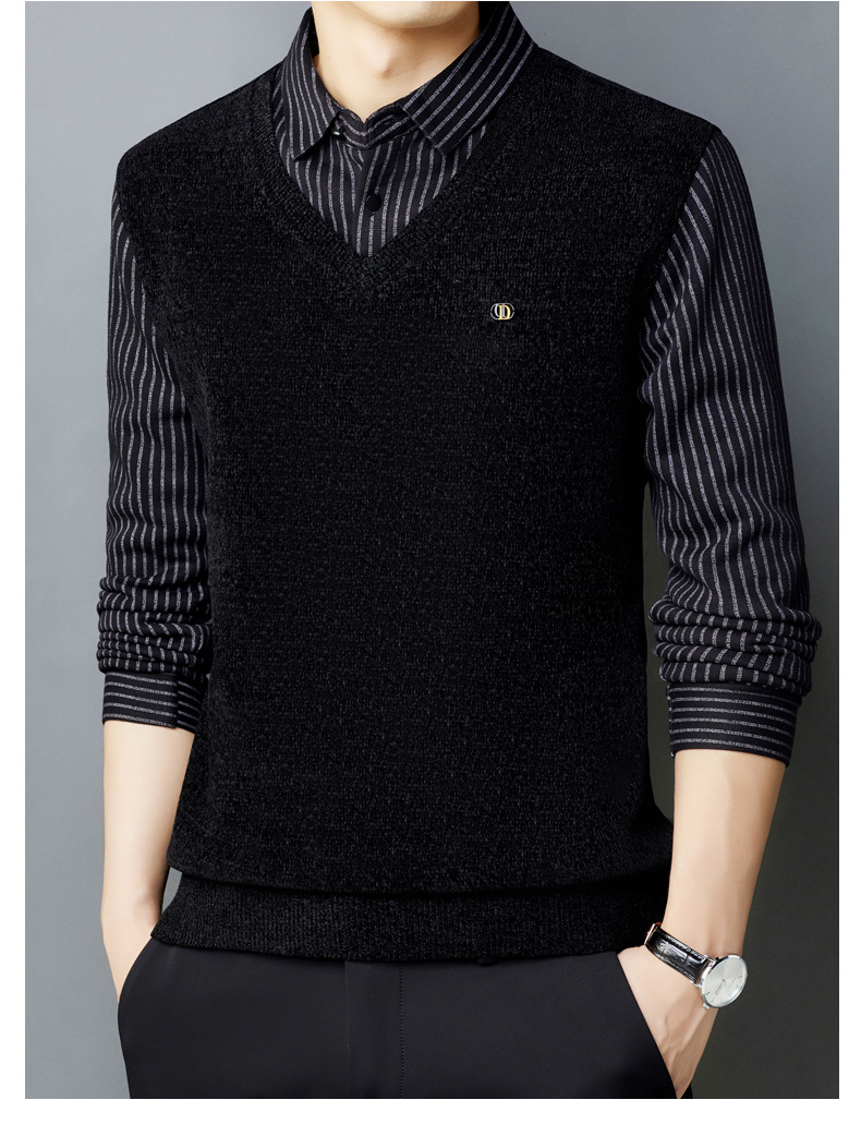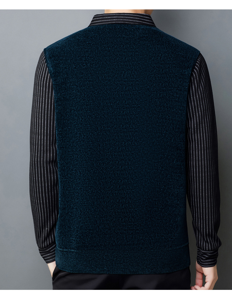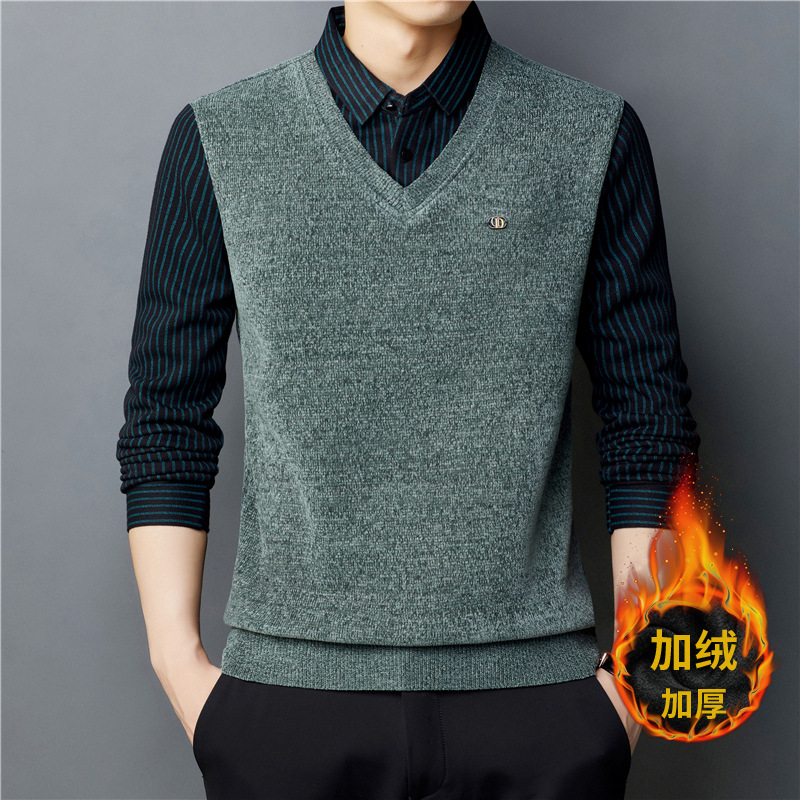 Мужской свитер в осенне-зимнем стиле, имитация двухсекционного трикотажа для людей среднего и пожилого возраста, с рубашечным воротником, на флисовой подкладке, утолщенный, теплый базовый слой.