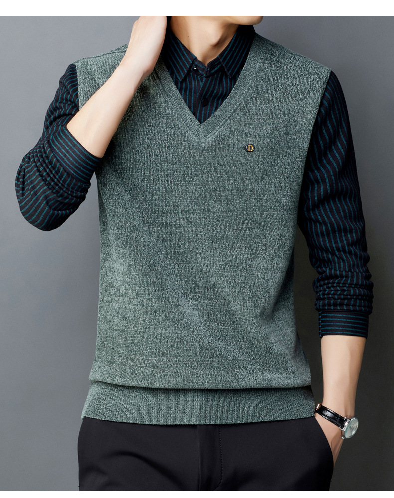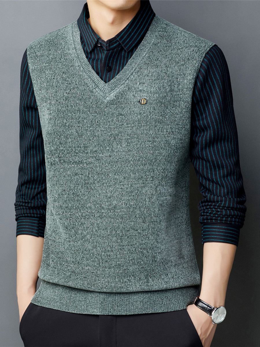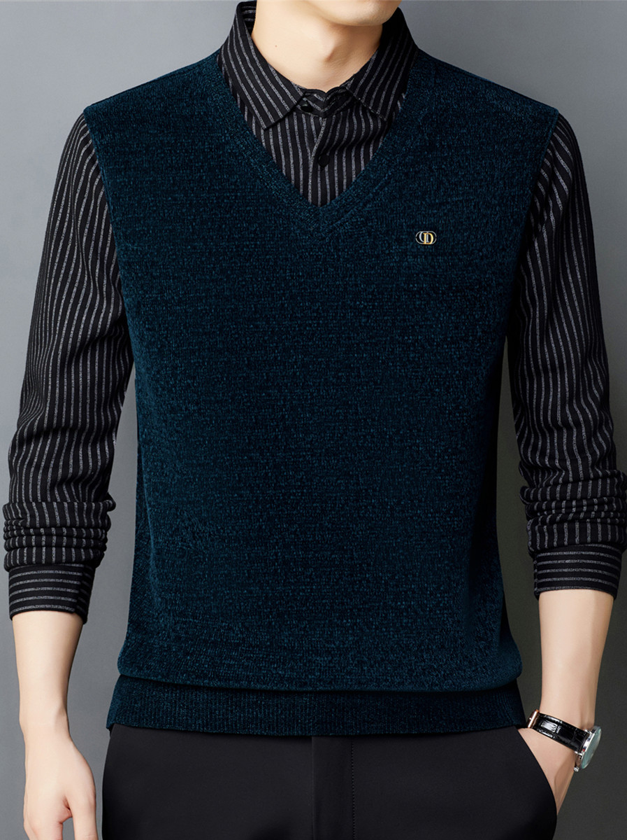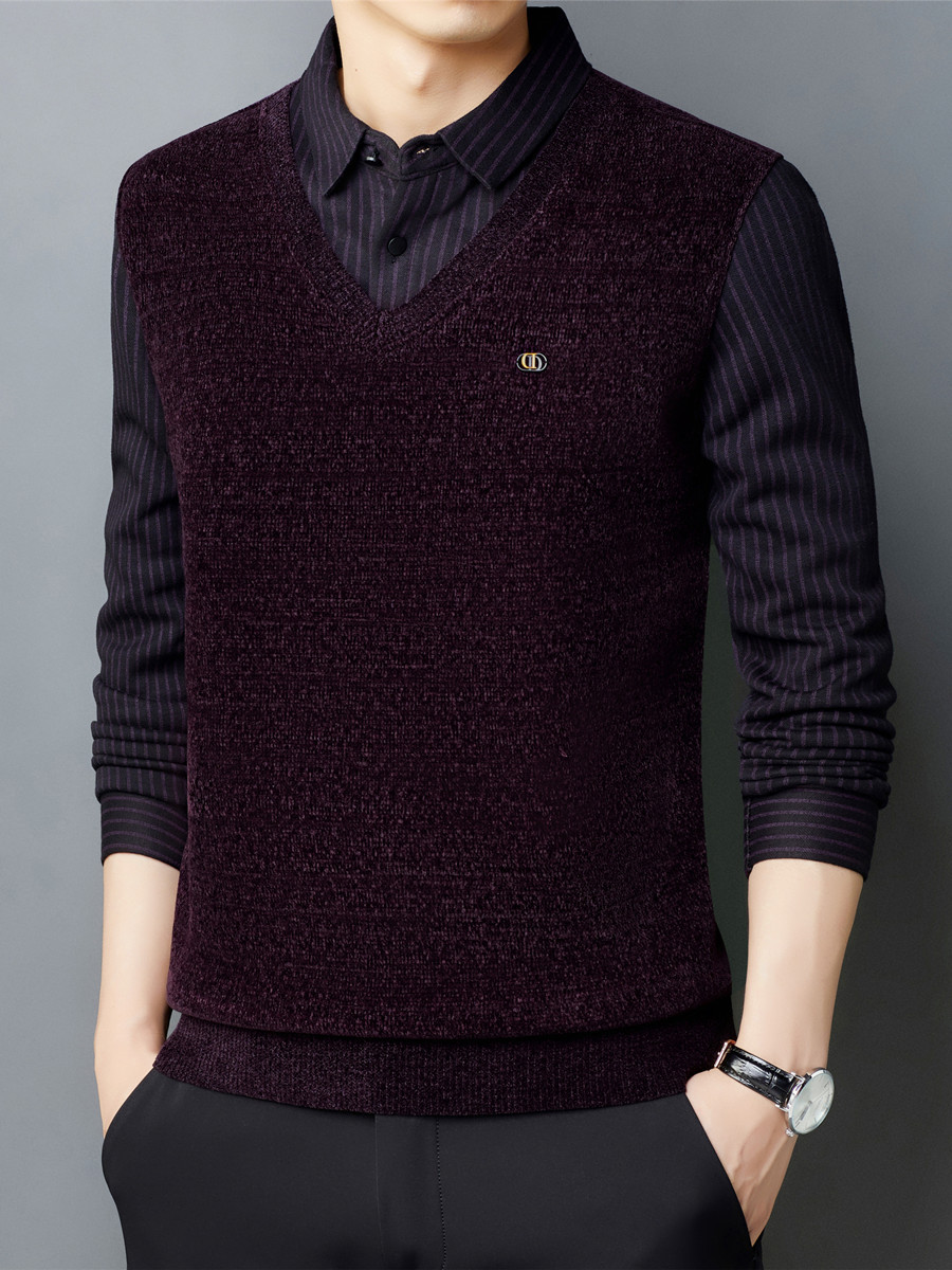 Мужской свитер в осенне-зимнем стиле, имитация двухсекционного трикотажа для людей среднего и пожилого возраста, с рубашечным воротником, на флисовой подкладке, утолщенный, теплый базовый слой.