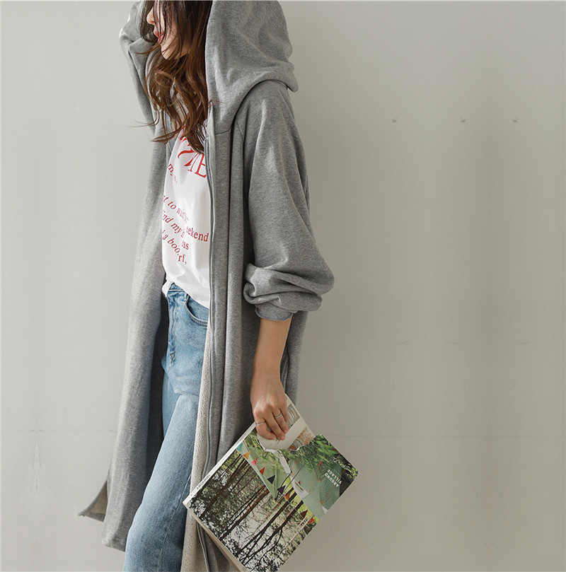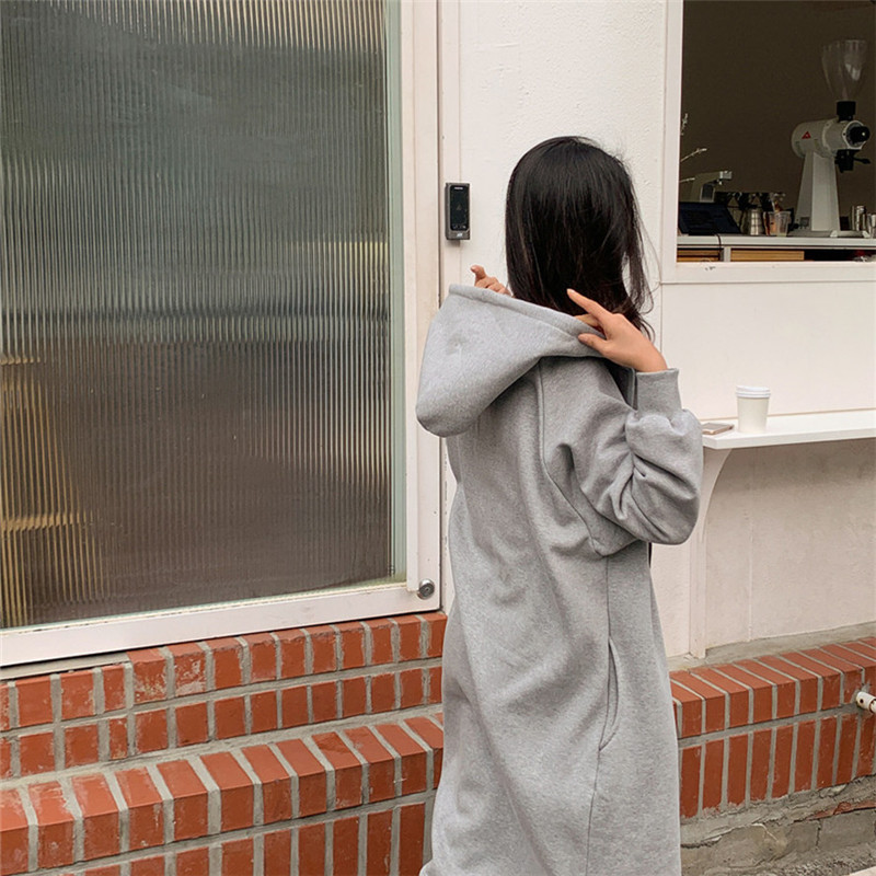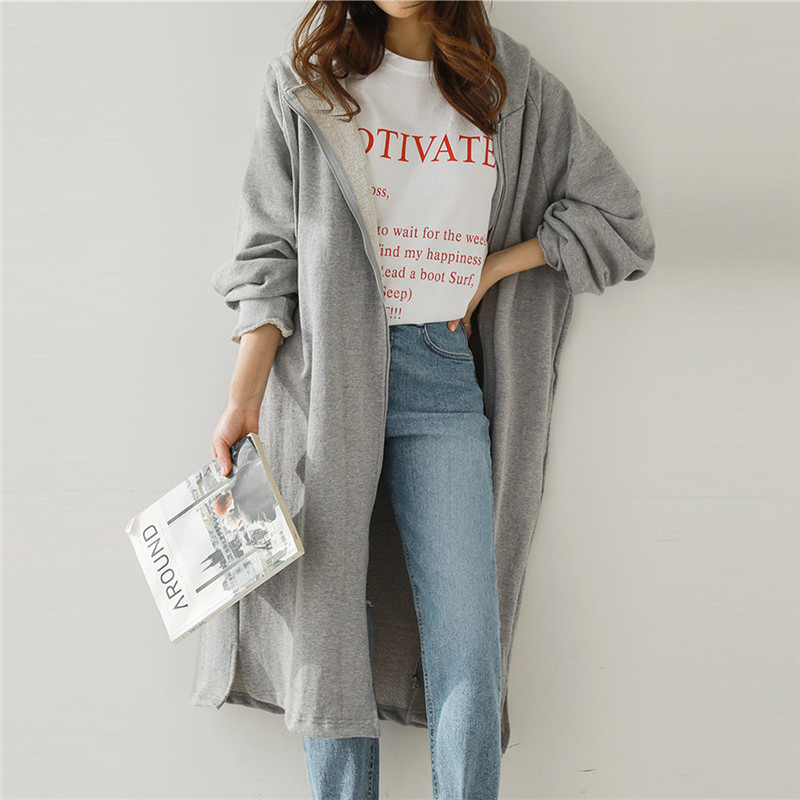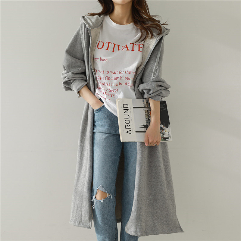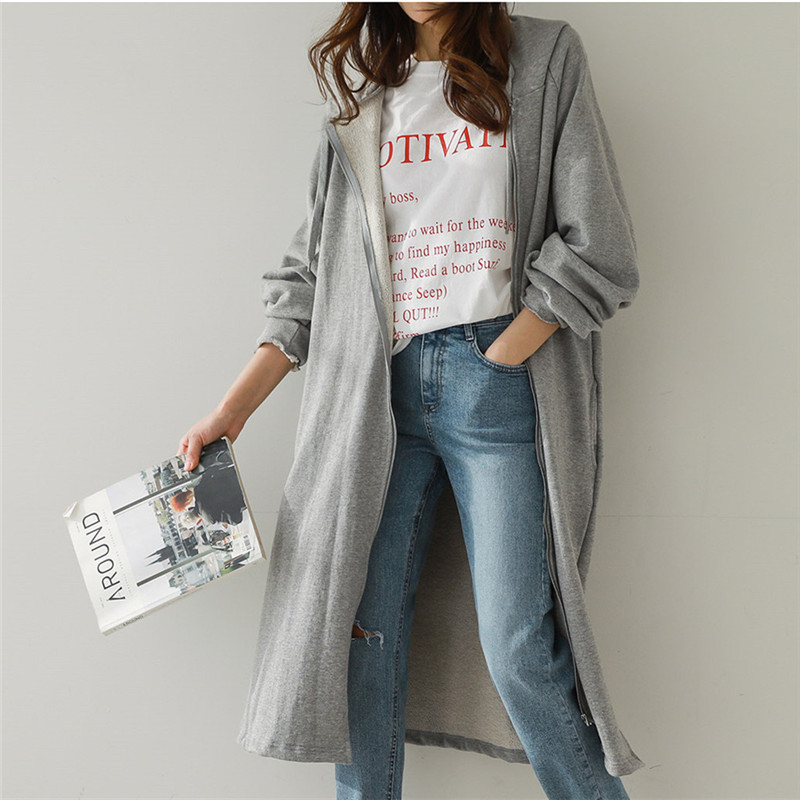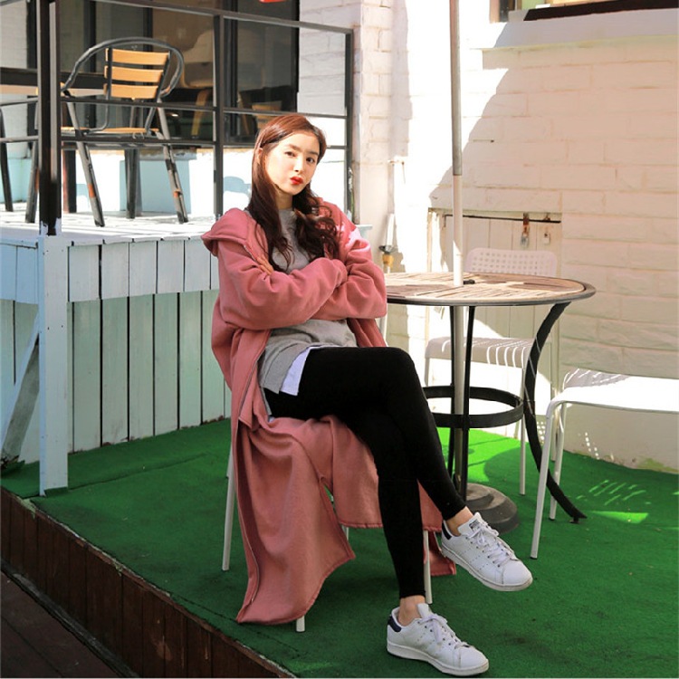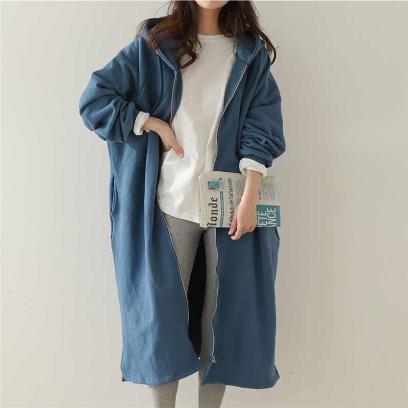 Хлопок с флисом утолщенные молнии с капюшоном длинный свитер женский 2024 свободный повседневный боковой плащ плащ большой размер