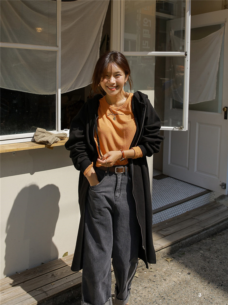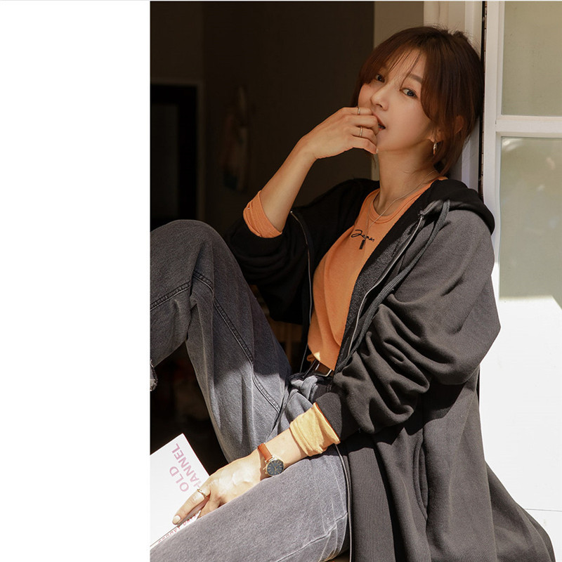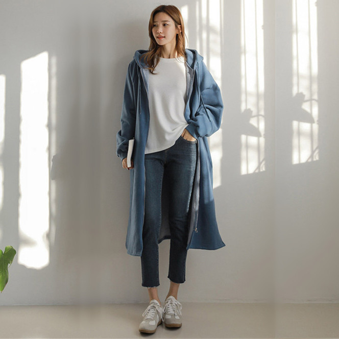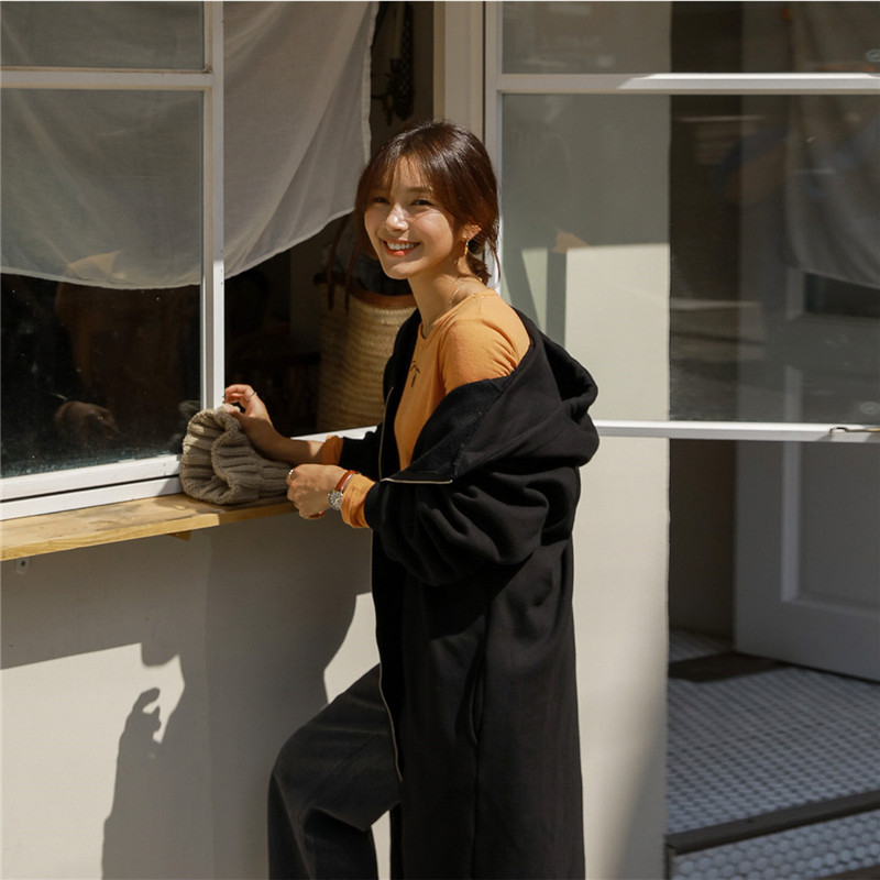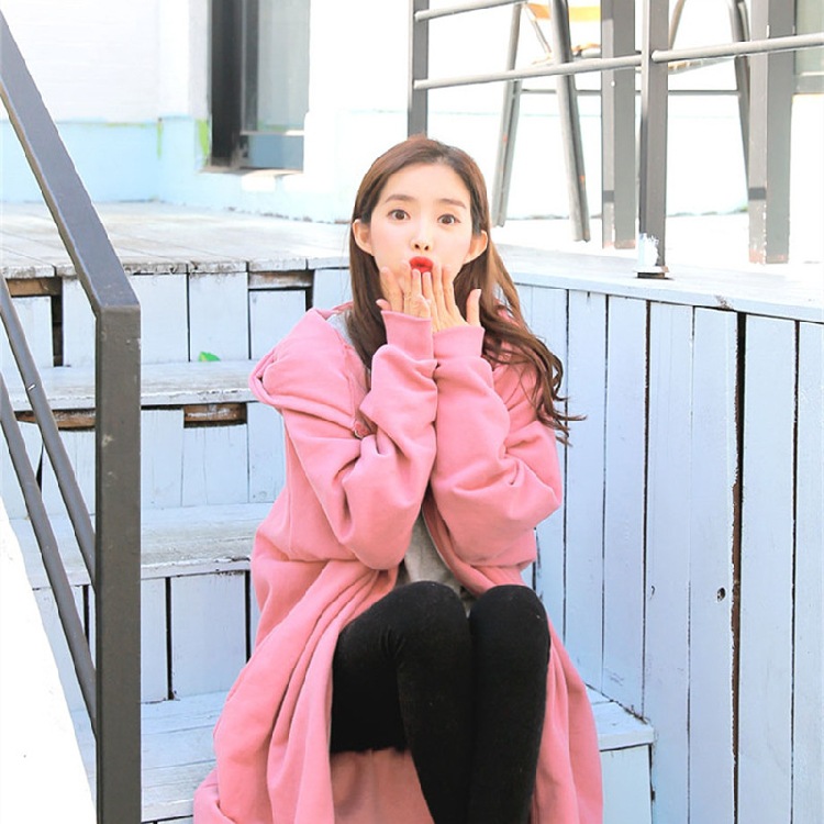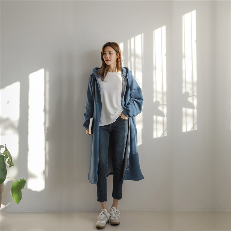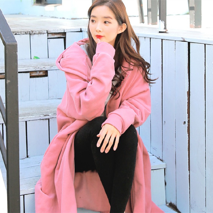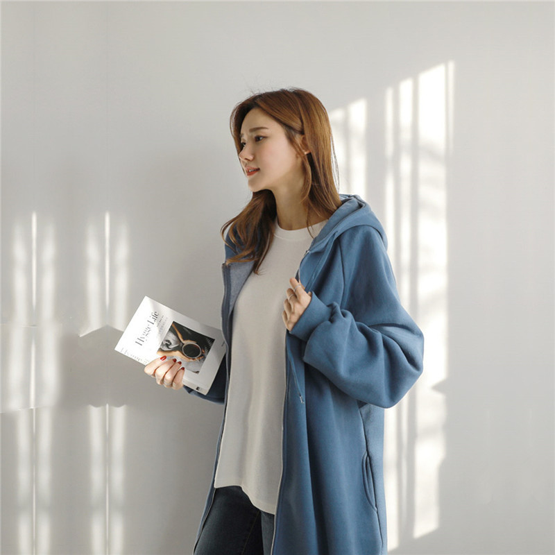 Хлопок с флисом утолщенные молнии с капюшоном длинный свитер женский 2024 свободный повседневный боковой плащ плащ большой размер
