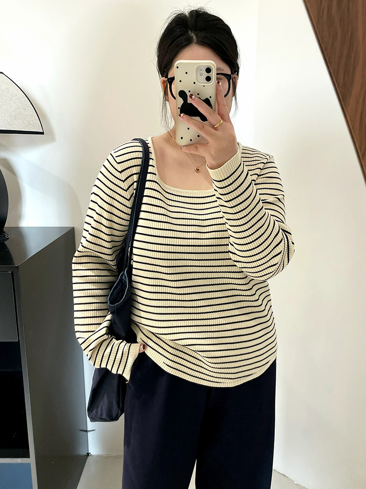 Женский топ больших размеров с квадратным воротником, женская тонкая полосатая рубашка, осень 2021, свободный трикотаж с толстым низом мм 2289