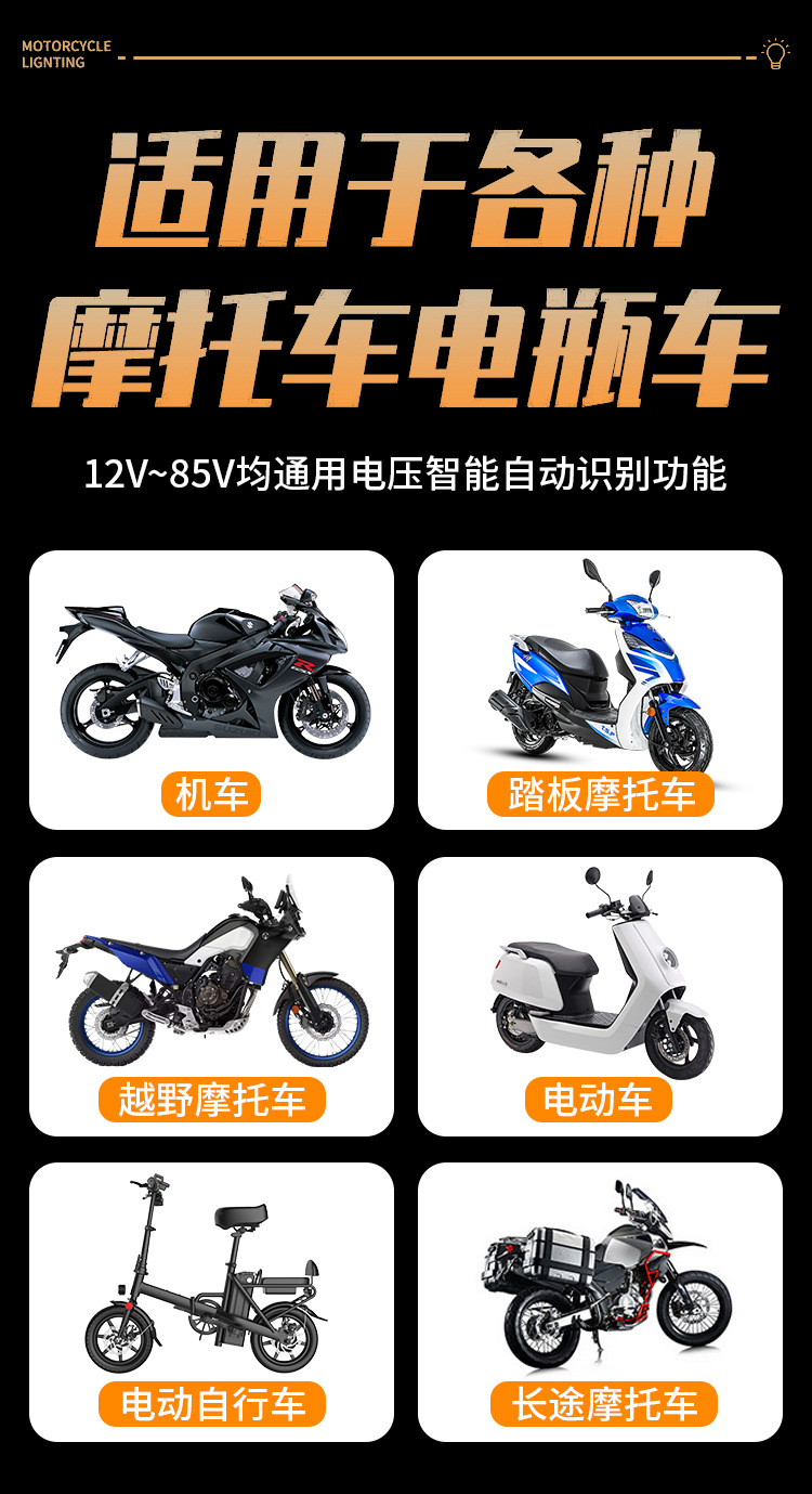 Ближний свет желтый + дальний свет белый (12 В); Ближний свет белый + дальний свет белый (12 В); Ближний свет желтый + дальний свет белый (12–80 В), широкое напряжение; Ближний свет белый + дальний свет белый (12–80 В), широкое напряжение