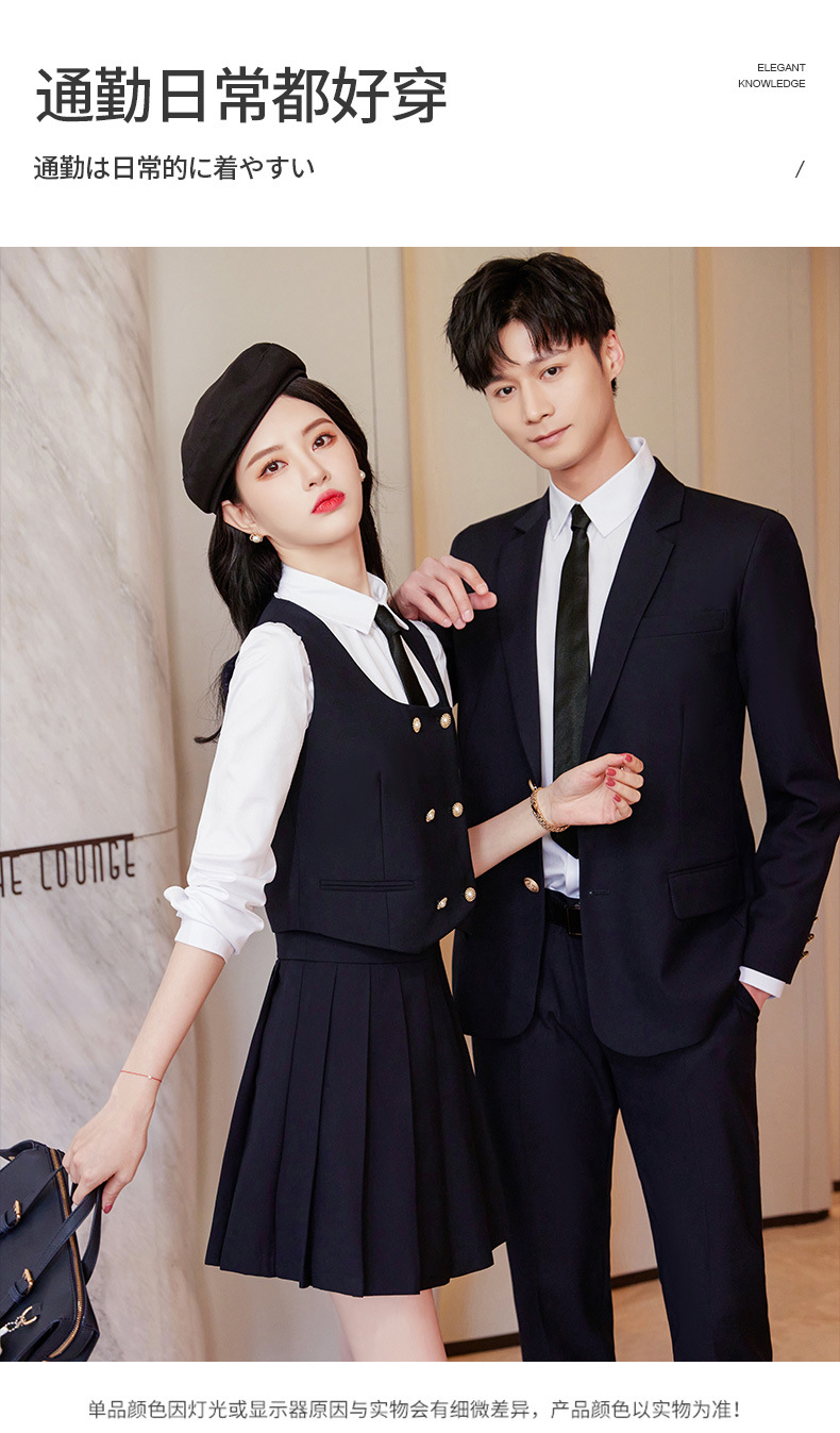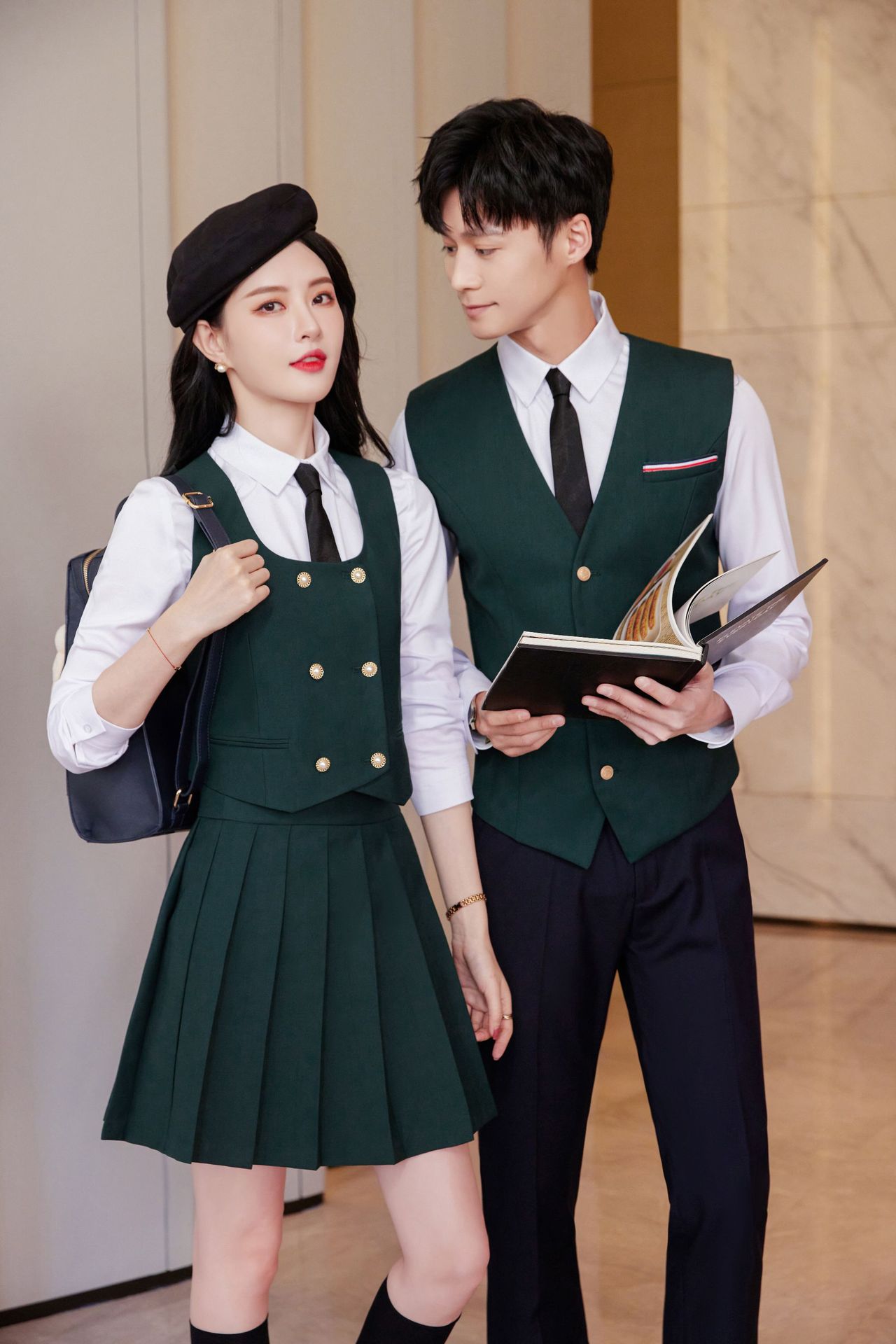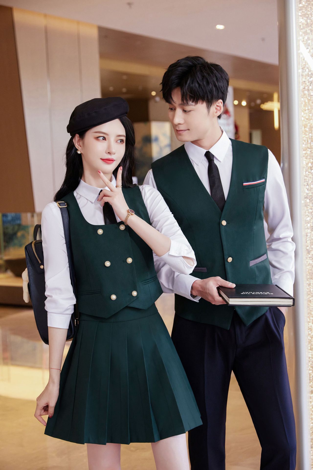 Женская белая рубашка (5290; Мужская белая рубашка (5291); Женская цельная юбка (цвет послания); Мужские цельные брюки (цвет сообщения); Женский черный жилет + юбка + белая рубашка; Женский темно-синий жилет + юбка + белая рубашка; Женский зеленый жилет + юбка + белая рубашка; Мужской черный жилет + брюки + белая рубашка; Мужской темно-синий жилет + брюки + белая рубашка; Мужской зеленый жилет + темно-синие брюки + белая рубашка
