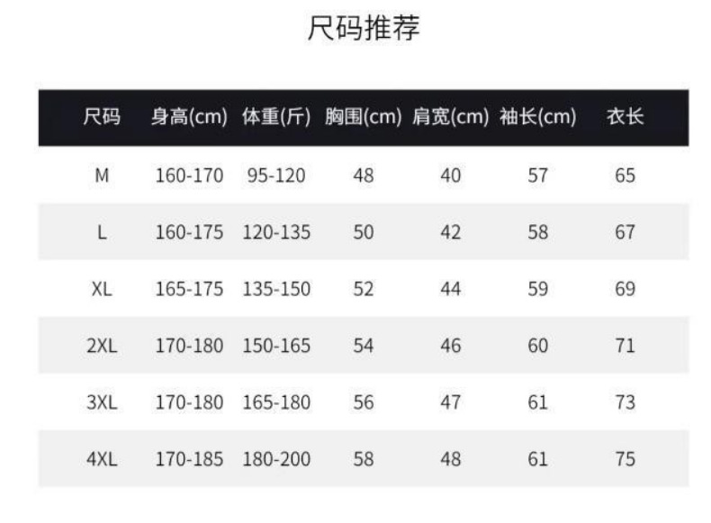 105/M/165; 110/L/170; 115/XL/175; 120/2XL/180; 125/3XL/185; 130/4XL/190