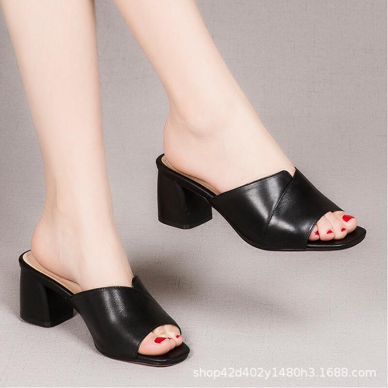 Женские босоножки на среднем каблуке с открытым носком, лето 2025, новая коллекция, мягкая кожа, европейский стиль, простые босоножки на толстом каблуке, женская обувь.