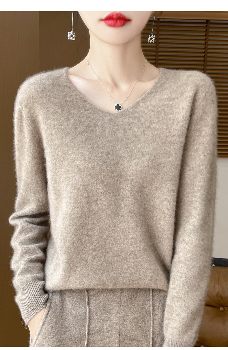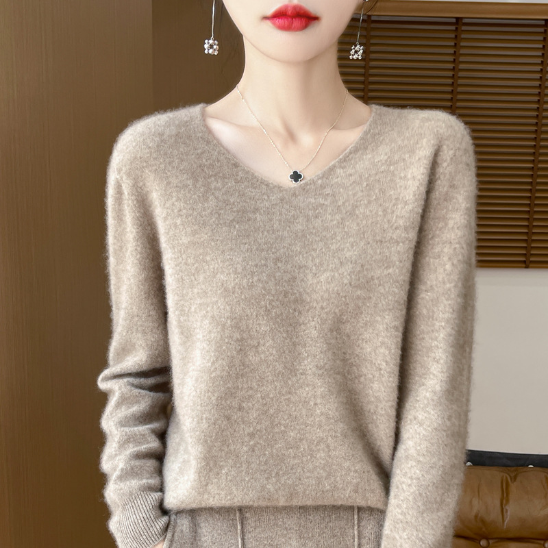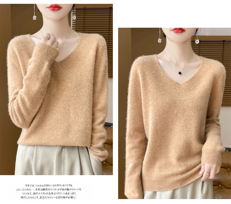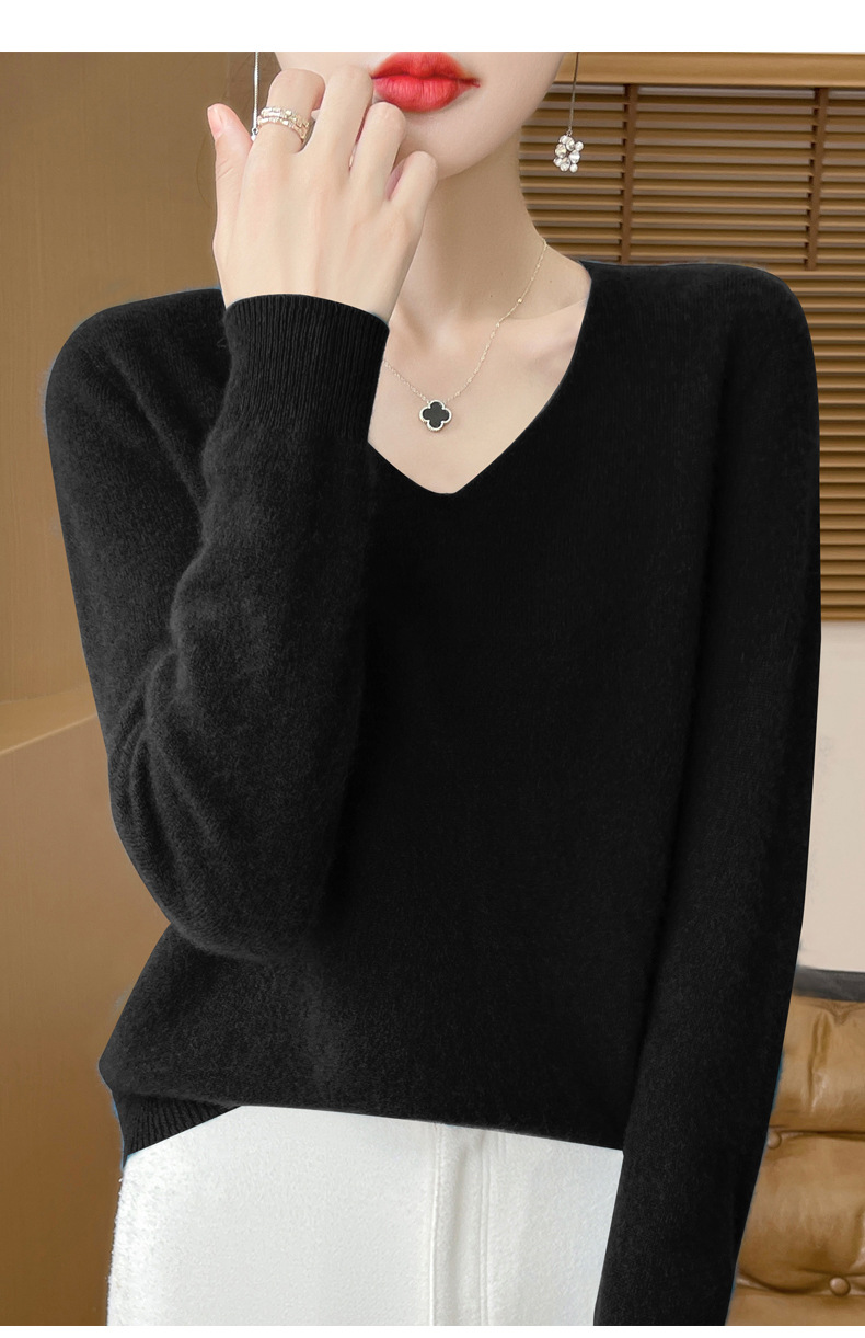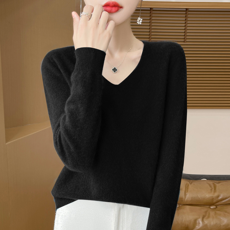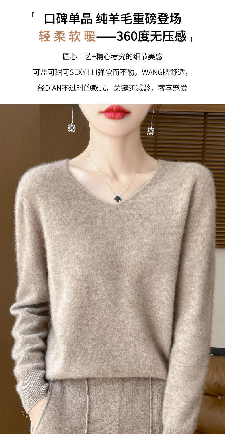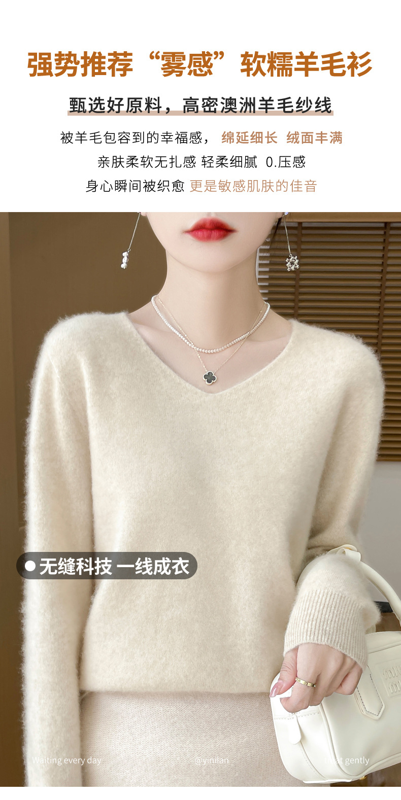 Бесшовный цельный свитер из 100 чистой шерсти, V-образный воротник, чистый цвет, с длинными рукавами, нормальный дизайн, 25, новый женский вязаный свитер