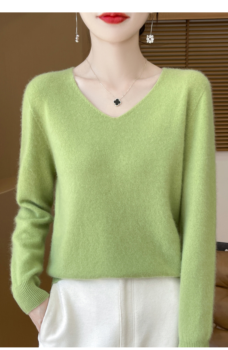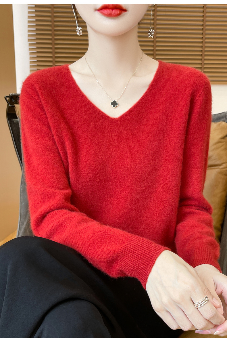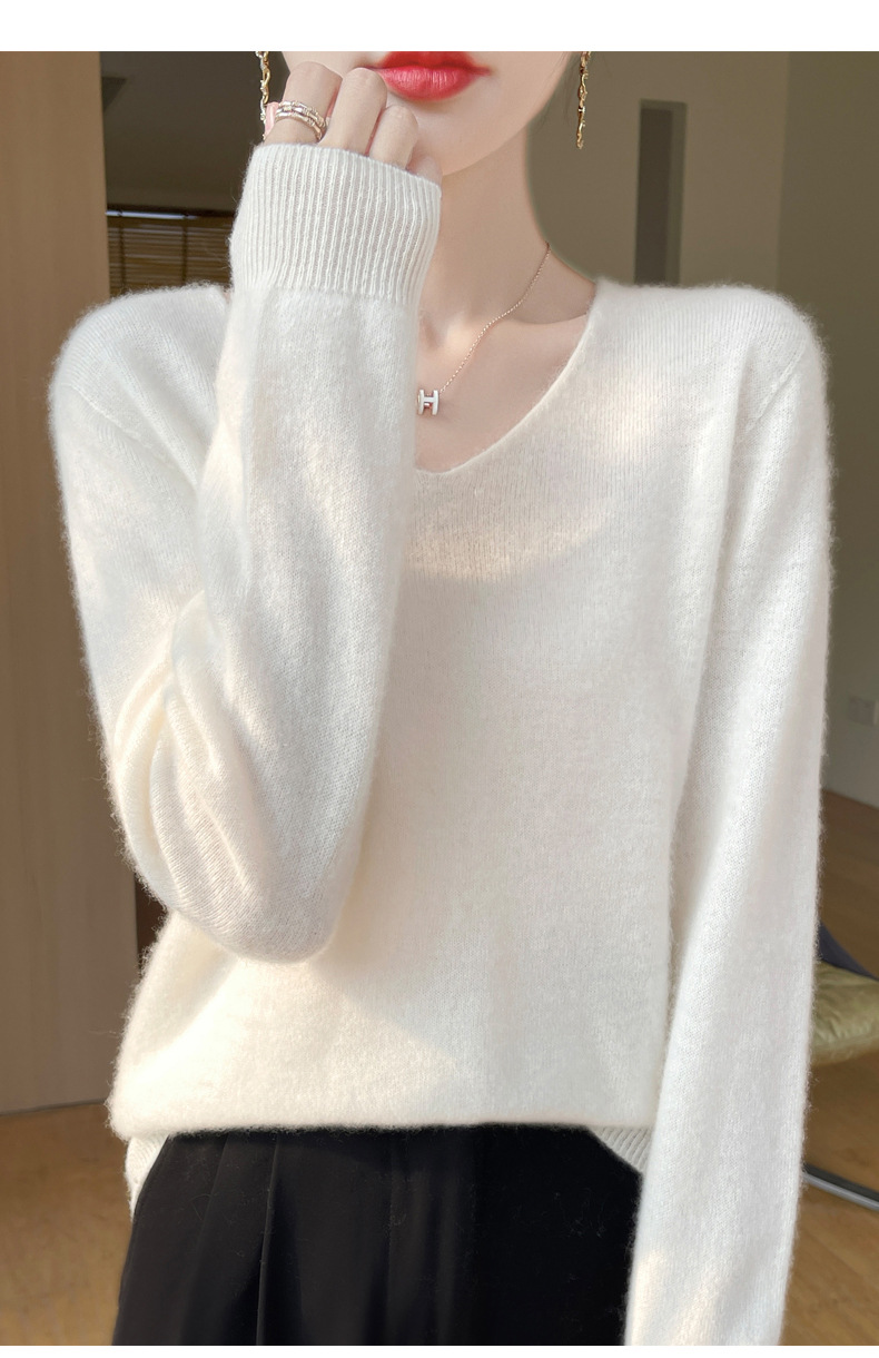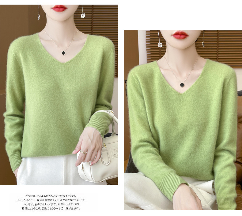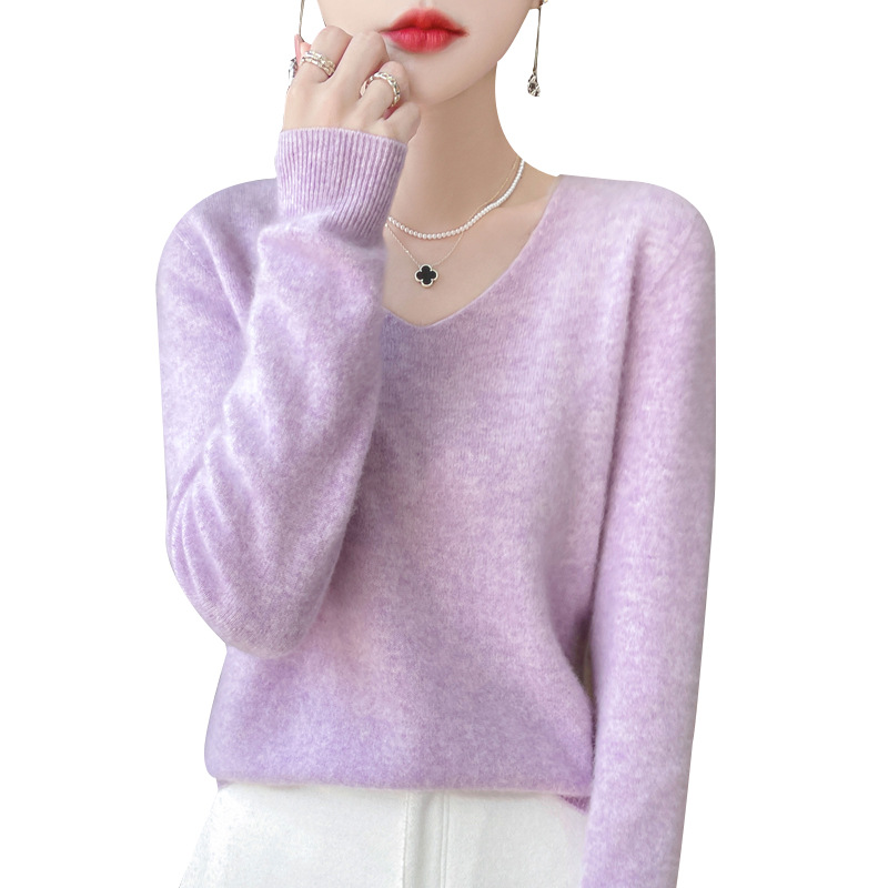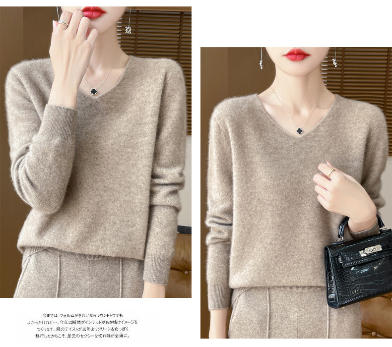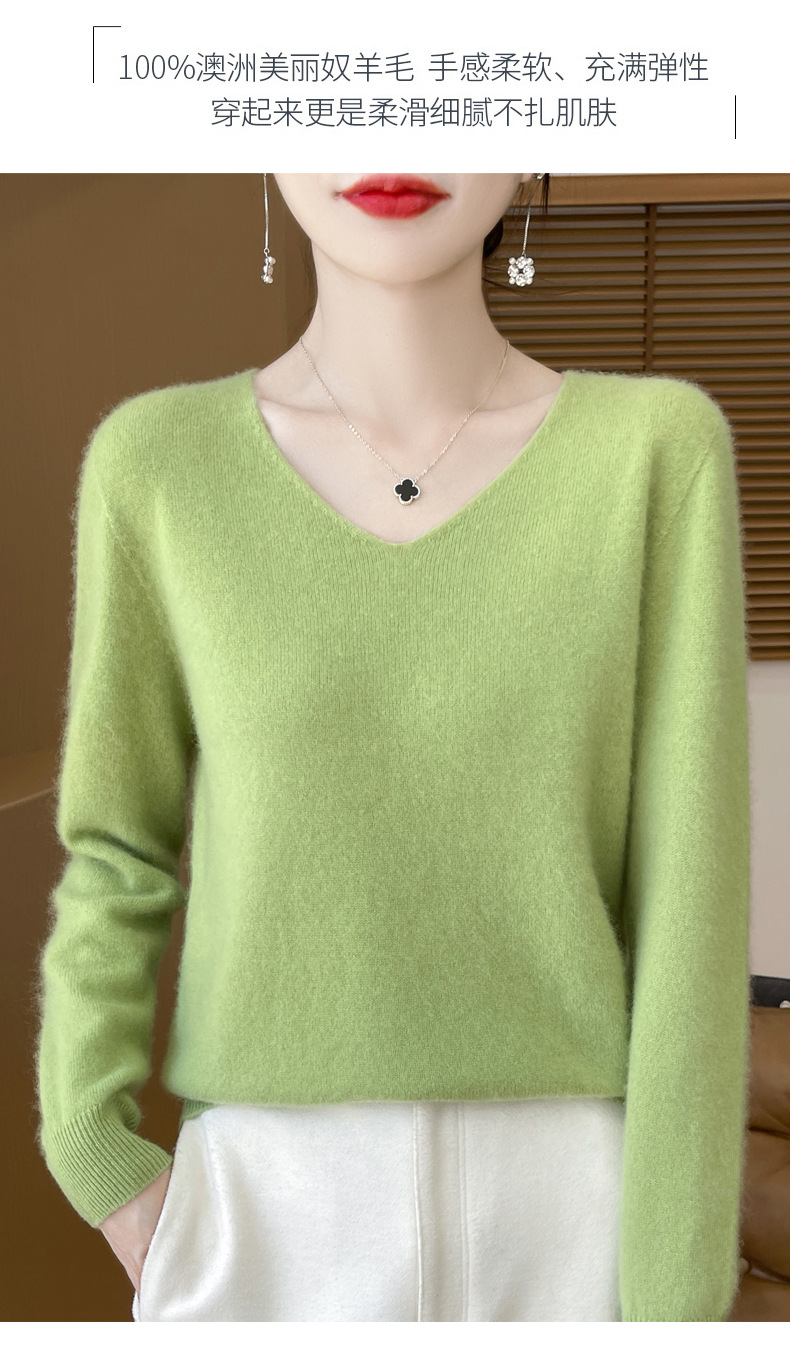 Бесшовный цельный свитер из 100 чистой шерсти, V-образный воротник, чистый цвет, с длинными рукавами, нормальный дизайн, 25, новый женский вязаный свитер