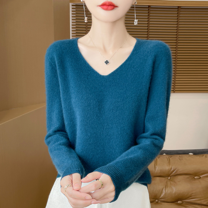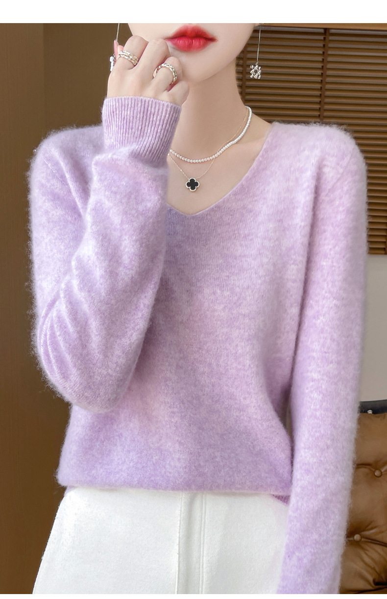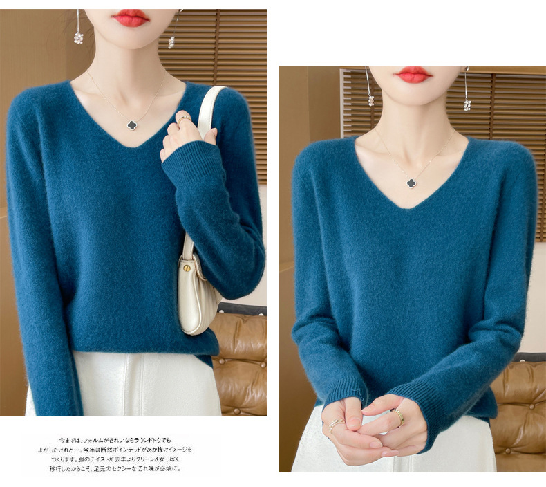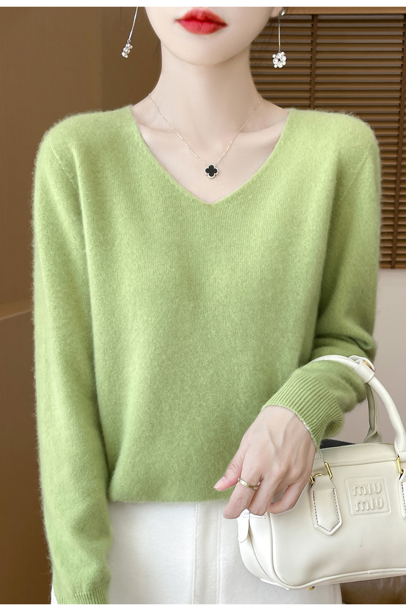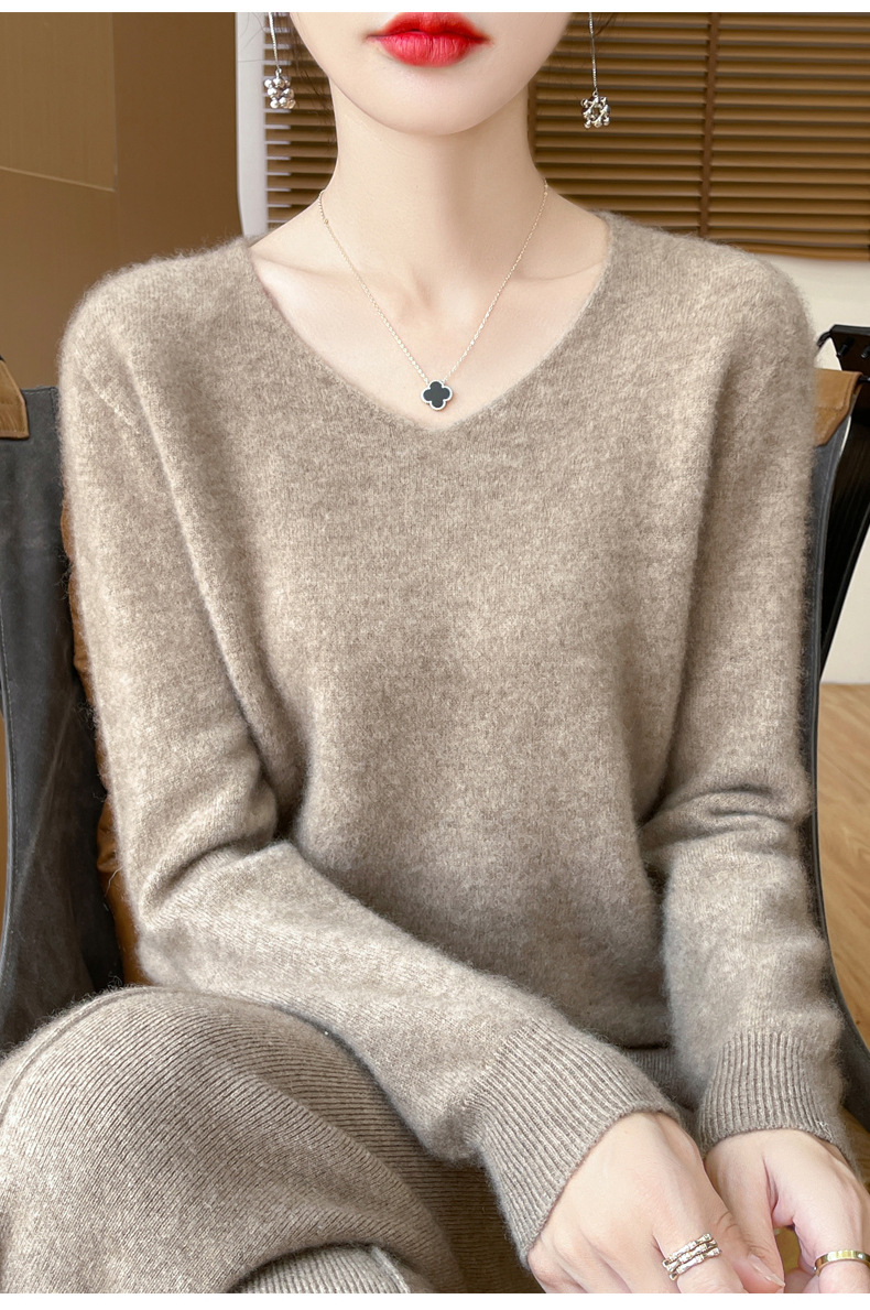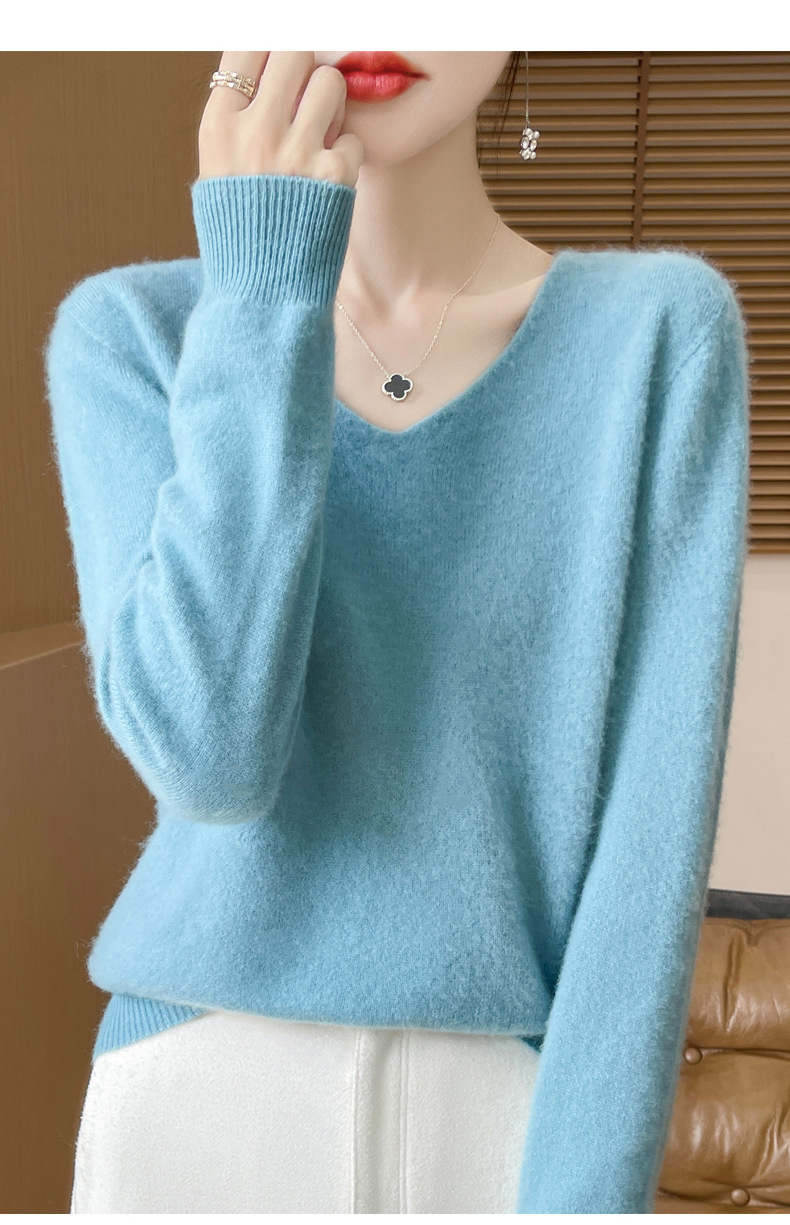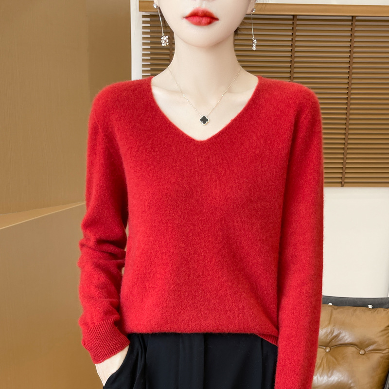 Бесшовный цельный свитер из 100 чистой шерсти, V-образный воротник, чистый цвет, с длинными рукавами, нормальный дизайн, 25, новый женский вязаный свитер
