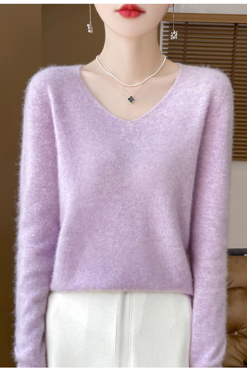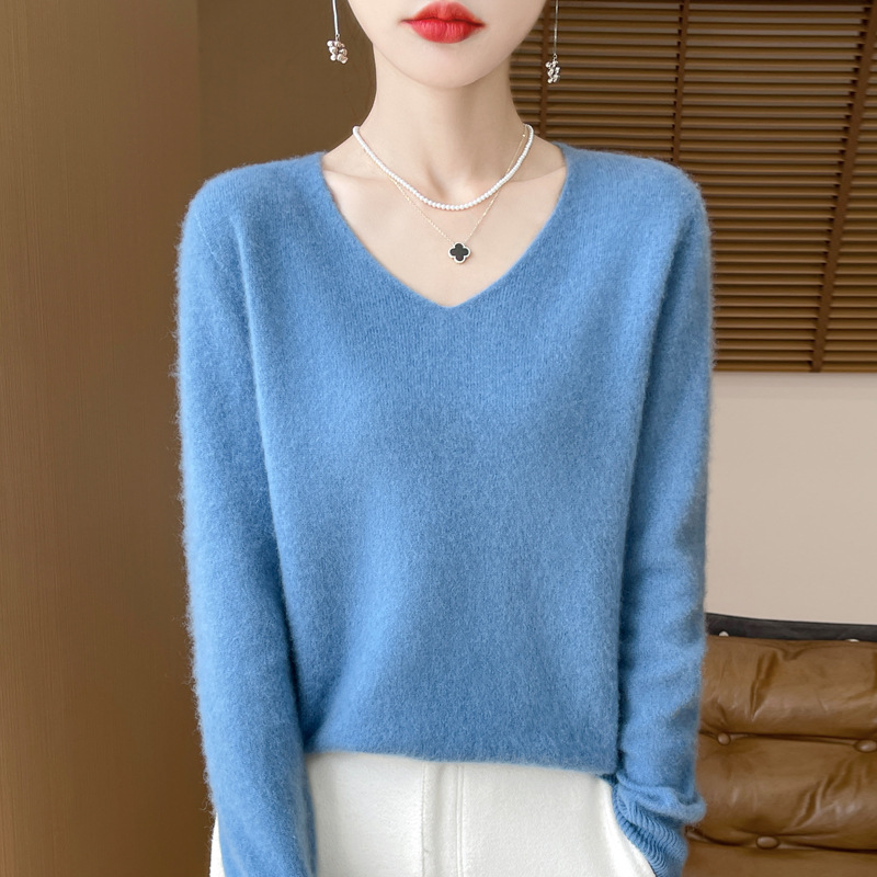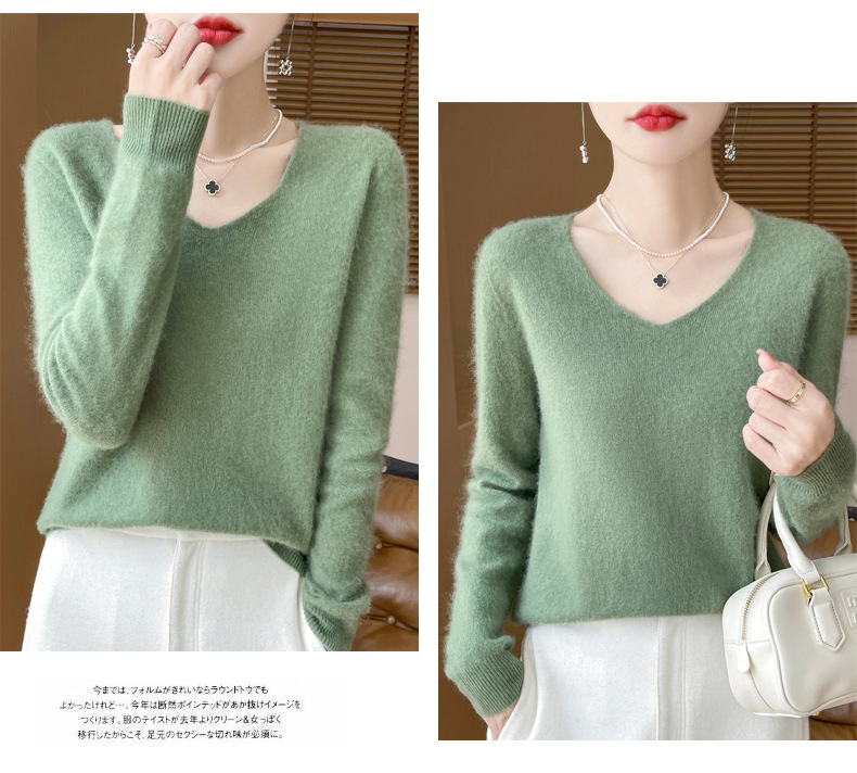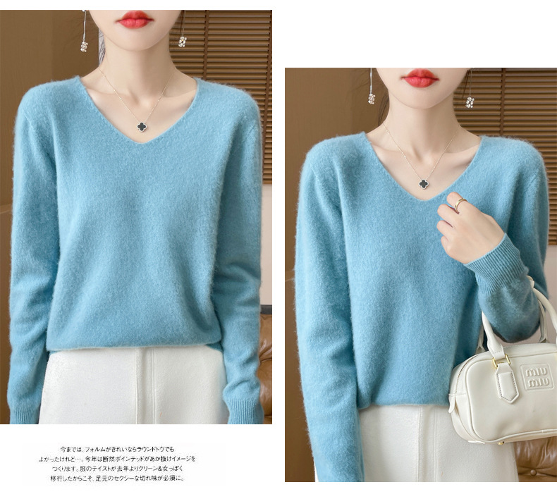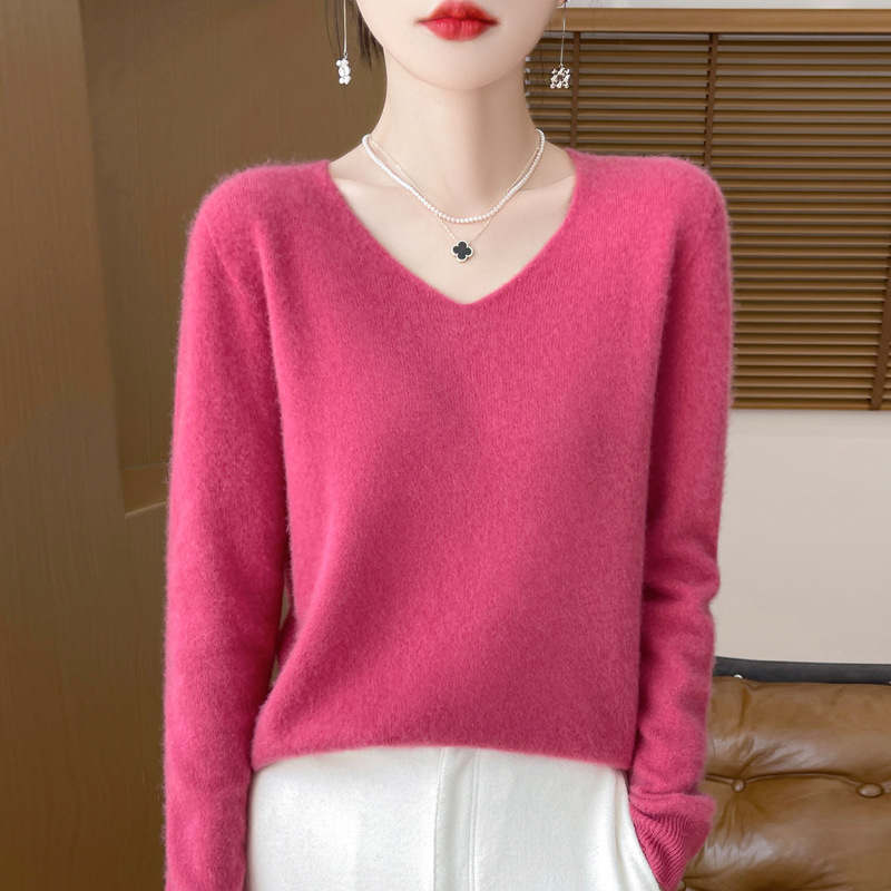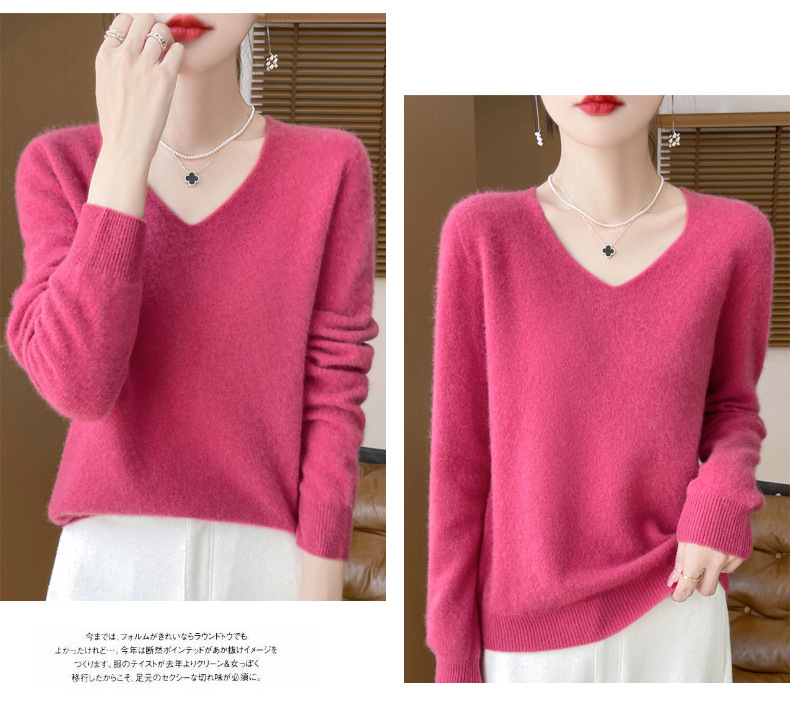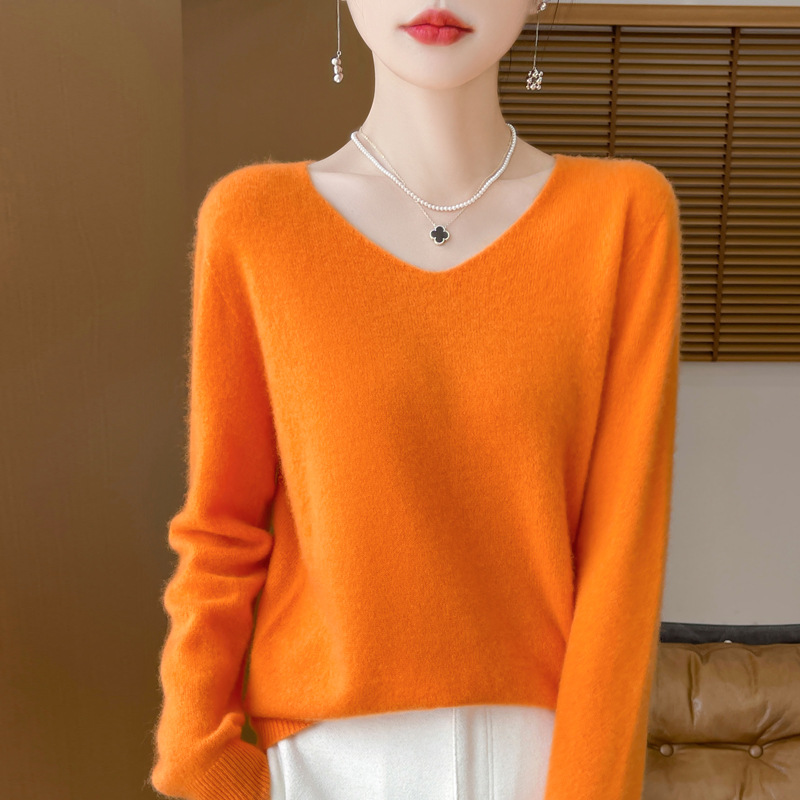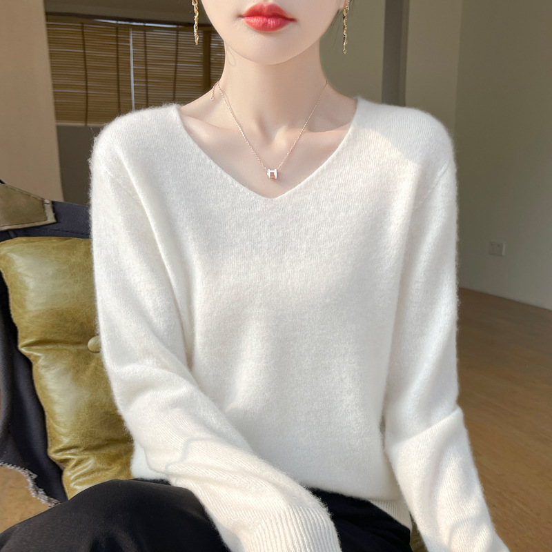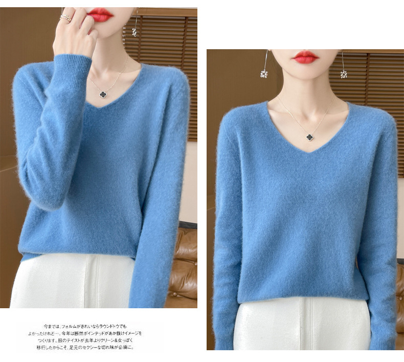 Бесшовный цельный свитер из 100 чистой шерсти, V-образный воротник, чистый цвет, с длинными рукавами, нормальный дизайн, 25, новый женский вязаный свитер