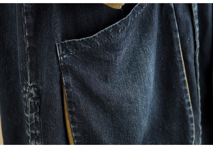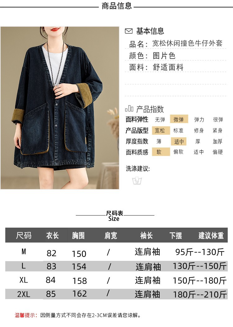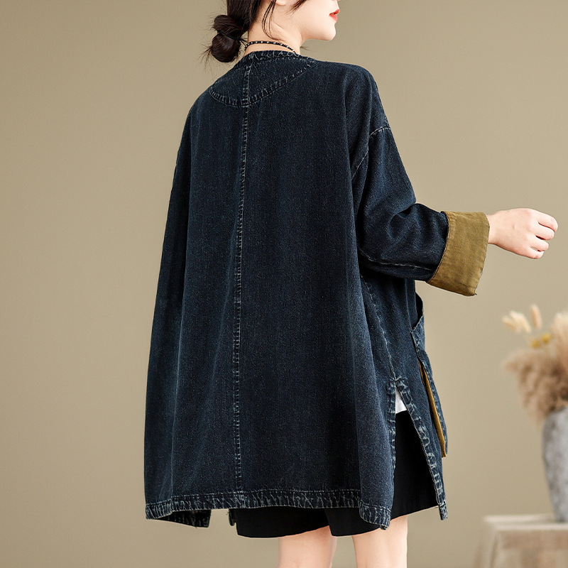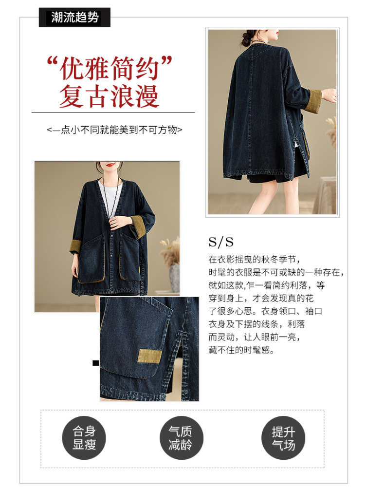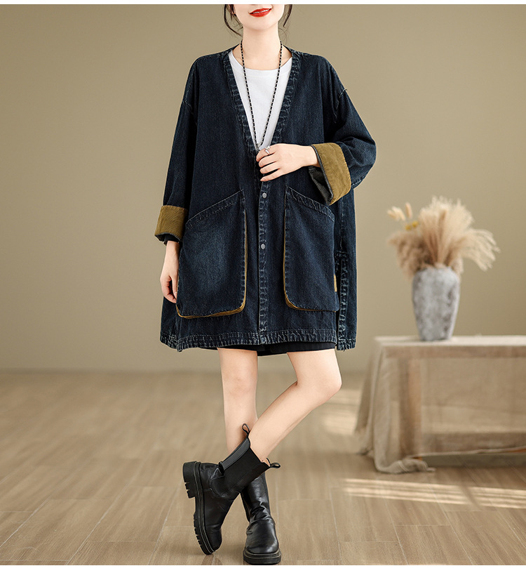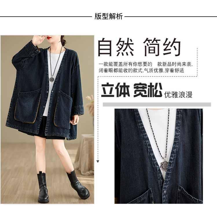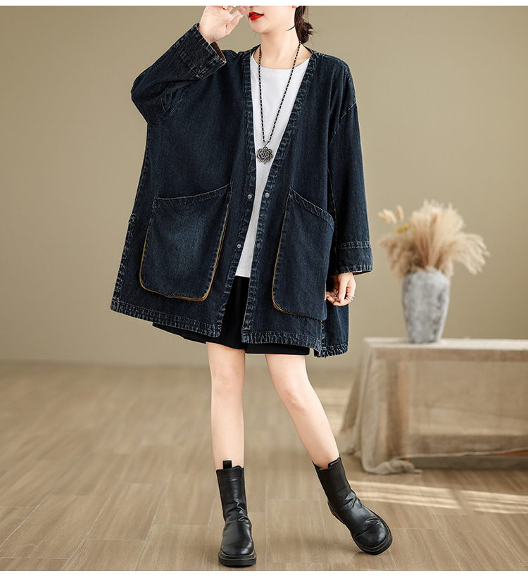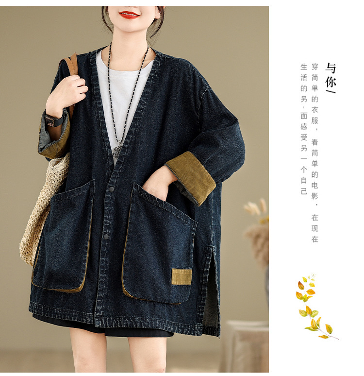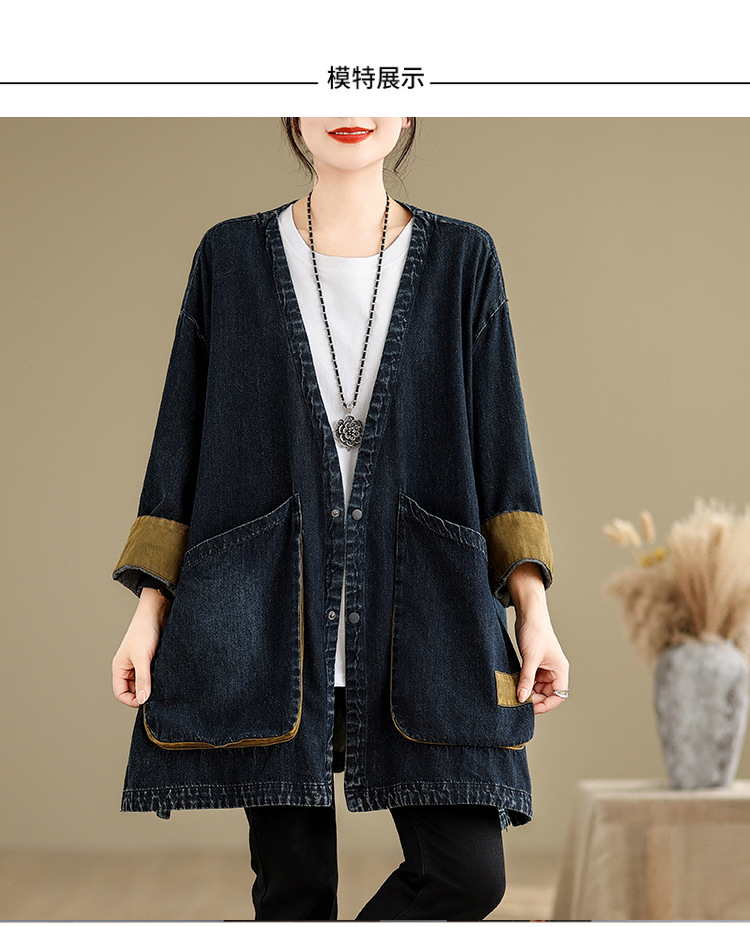 Осенняя куртка, ретро-дизайн с V-образным вырезом, джинсовая куртка с большими карманами, свободный оверсайз плащ средней длины.