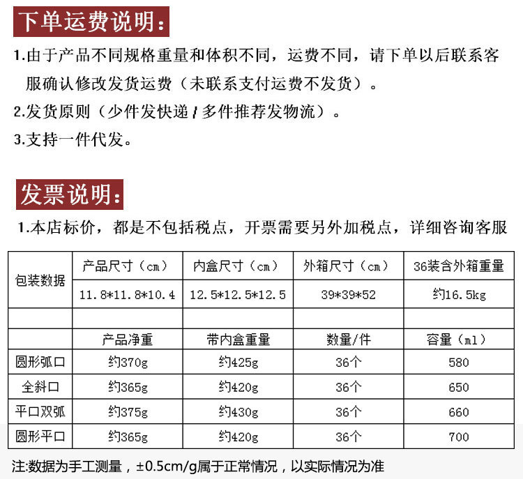 Круглая дуговая горловина (580 мл); Полностью наклонный рот (650 мл); Плоская горловина, двойная дуга (660 мл); Круглый плоский рот (700 мл); Большой круглый плоский рот (1600 мл)