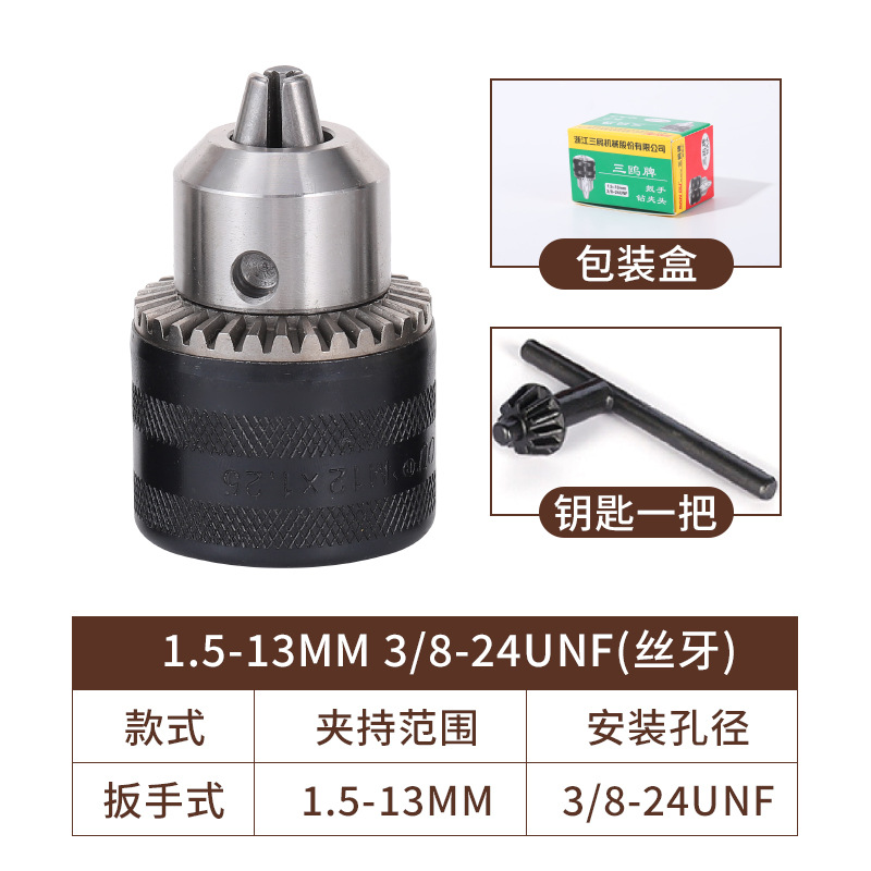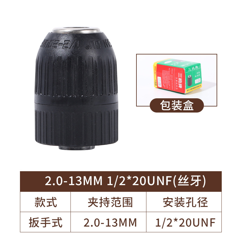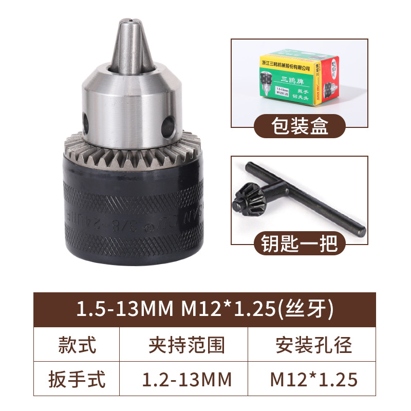 Ручной сверлильный патрон с пластиковым покрытием 0,8-10 мм.; Патрон с пластиковым покрытием 13мм-1/2*20UNF; Металлический ручной сверлильный патрон 0,8-10 мм.; Металлический сверлильный патрон с храповым механизмом 2,0-13 мм.; Патрон для дрели с гаечным ключом 10 мм-3/8-24UNF; Патрон для дрели с гаечным ключом 13 мм-3/8-24UNF; Патрон для дрели с гаечным ключом 13 мм-1/2-20UNF; Специальный сверлильный патрон угловой шлифовальной машины M10*1,5; Патрон сверлильный тип ключа 13мм-М12*1,25; Ручной сверлильный патрон + соединение с пластиковым покрытием; Металлический ручной сверлильный патрон + шарнир; Патрон для ключа 10 мм + соединитель; Патрон для сверления ключей 13 мм + соединитель; Патрон с храповым механизмом 13 мм + шарнир; Модель с пластиковым покрытием + конверсионная головка; Металл 10мм + переходник; Металл 13мм + адаптер; Тип ключа 10 мм + конверсионная головка; Тип ключа 13 мм + конверсионная головка