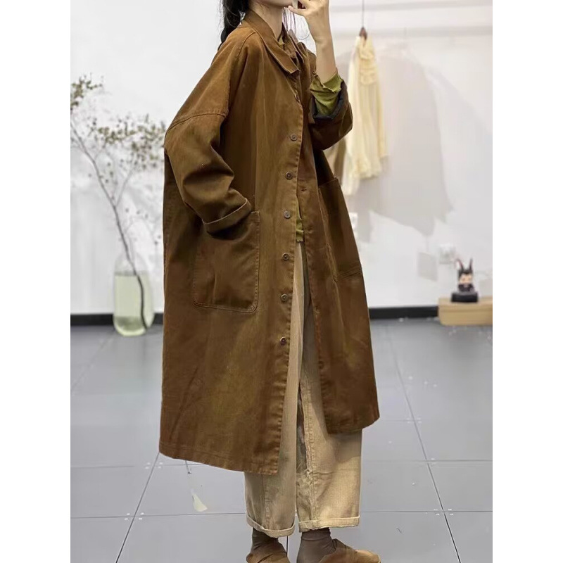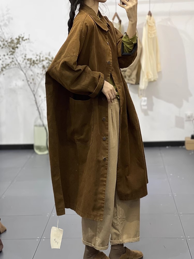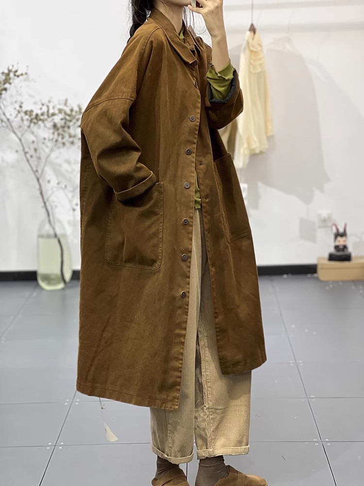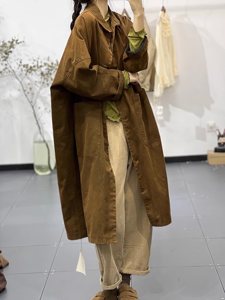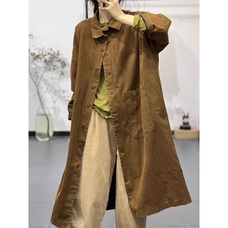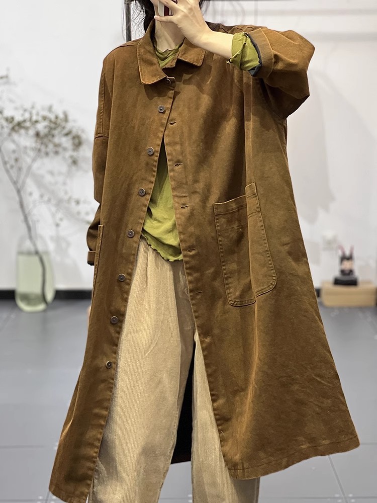Осенние новые лацканы сплошные простые простые дикие ретро-художественные длинные повседневные тонкие пальто ветровки женские