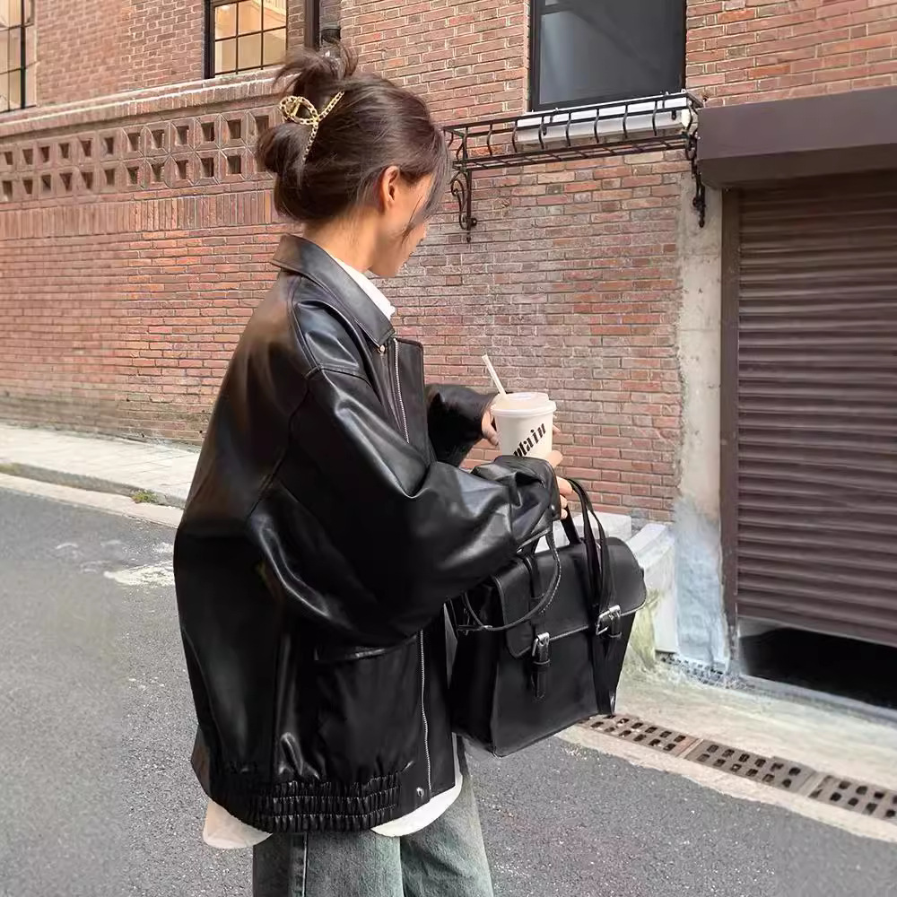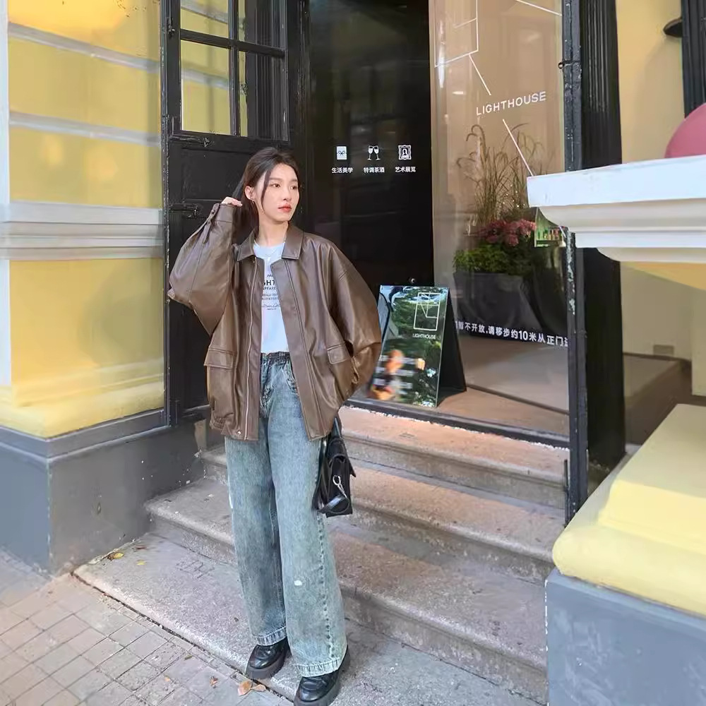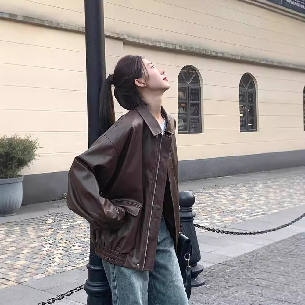 Ретро коричневый кожаный женский короткий 2024 в осеннюю маленькую корейскую свободную кожаную куртку красивый мотоциклист