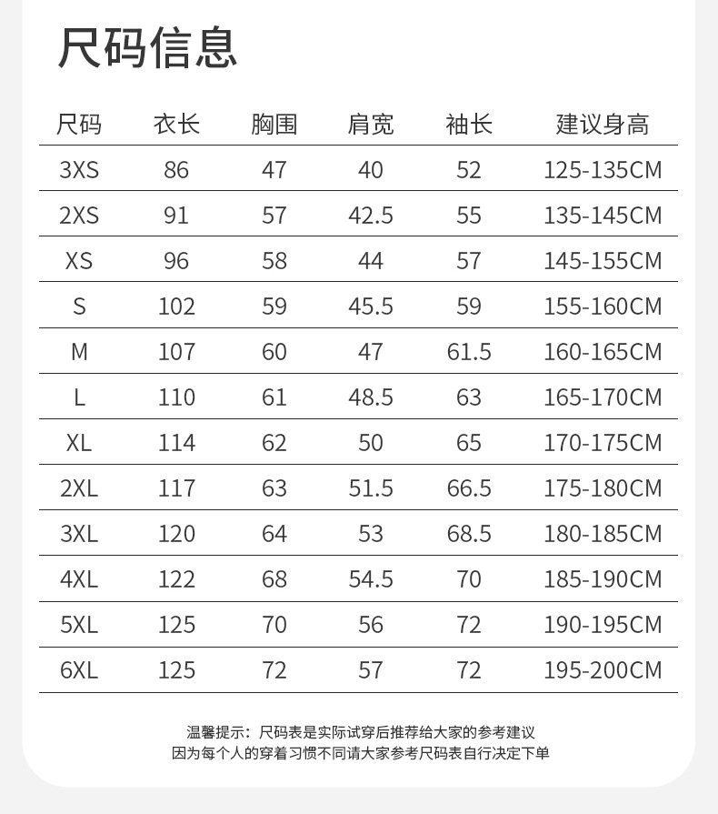 3XS; 2XS; XS; S; M; L; XL; 2XL; 3XL; 4XL; 5XL; 6XL