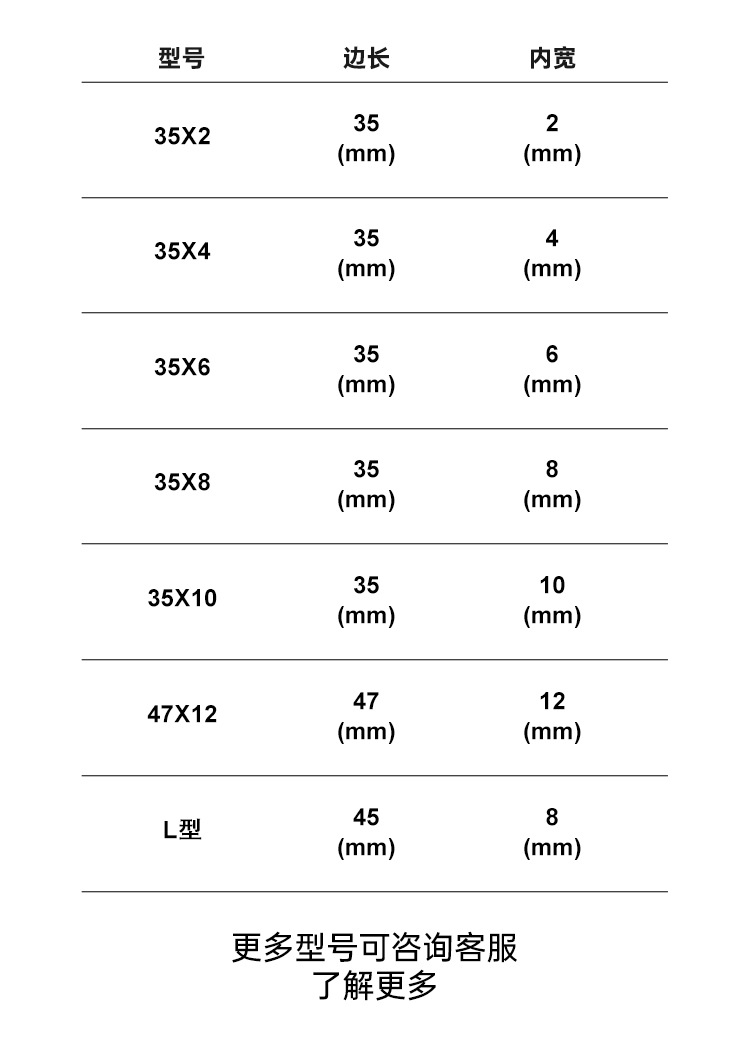 Внутренняя ширина 2 мм, 3 мм, 4 мм, 5 мм, 6 мм, 8 мм, 9 мм, 10 мм, 11 мм, 12 мм, 16 мм