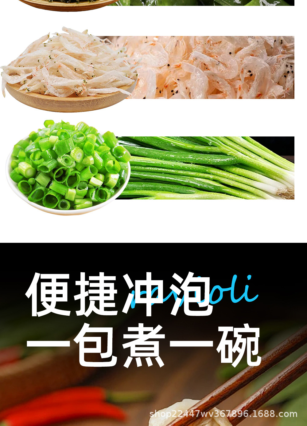 Морские водоросли, листья зеленого лука, соль, сахар, куриная эссенция.