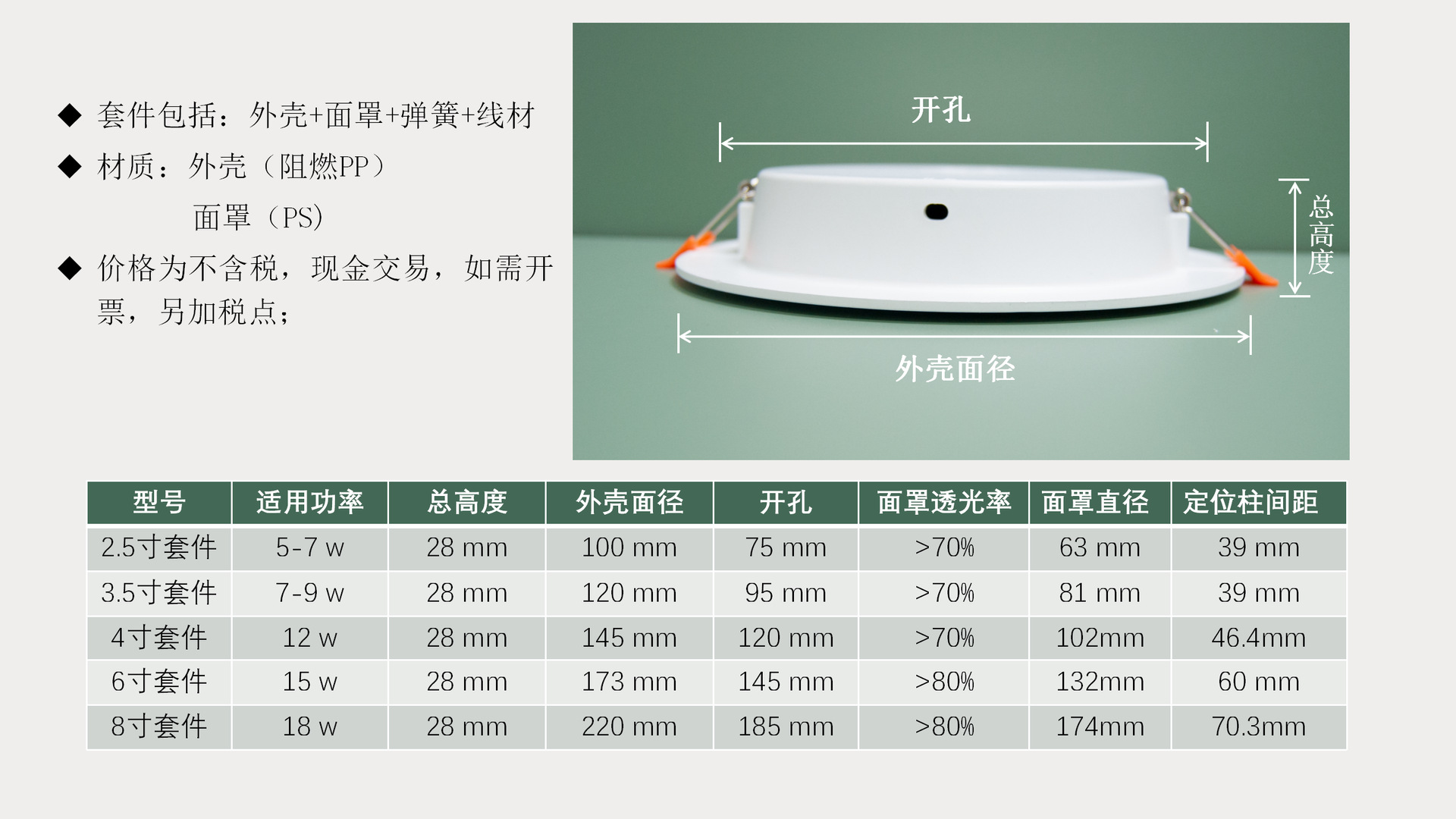 2.5inch комплект без источника света; 3.5inch комплект без источника света; 4inch комплект без источника света; 6inch комплект без источника света; 8inch комплект без источника света; Источники света можно настраивать массово; 4inch Готовая лампа белого света DOB 15W
