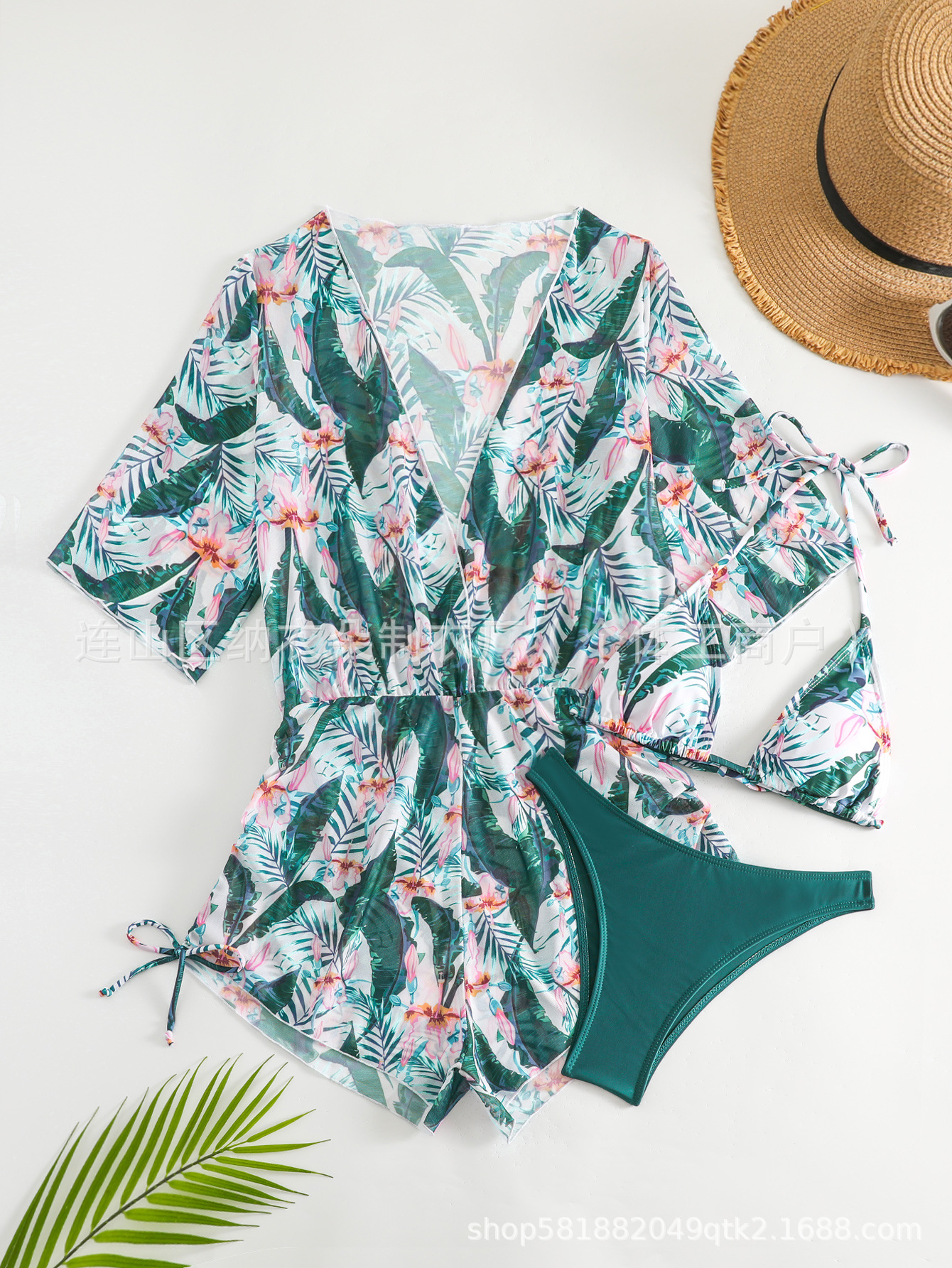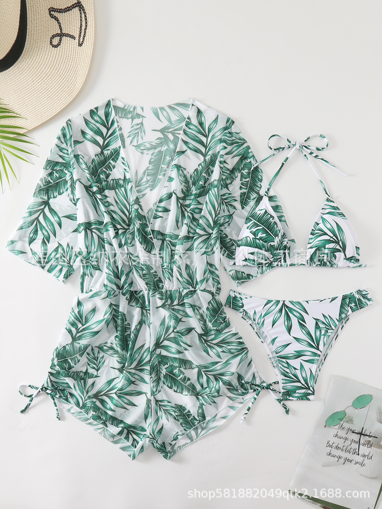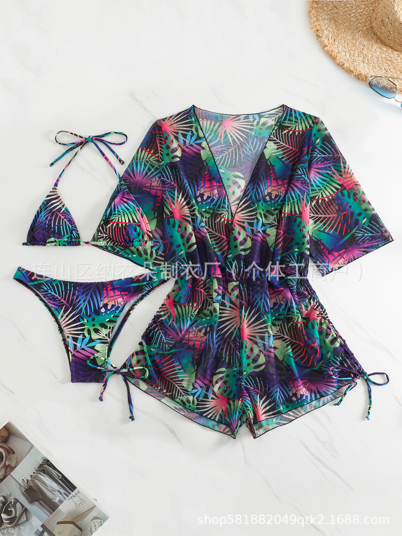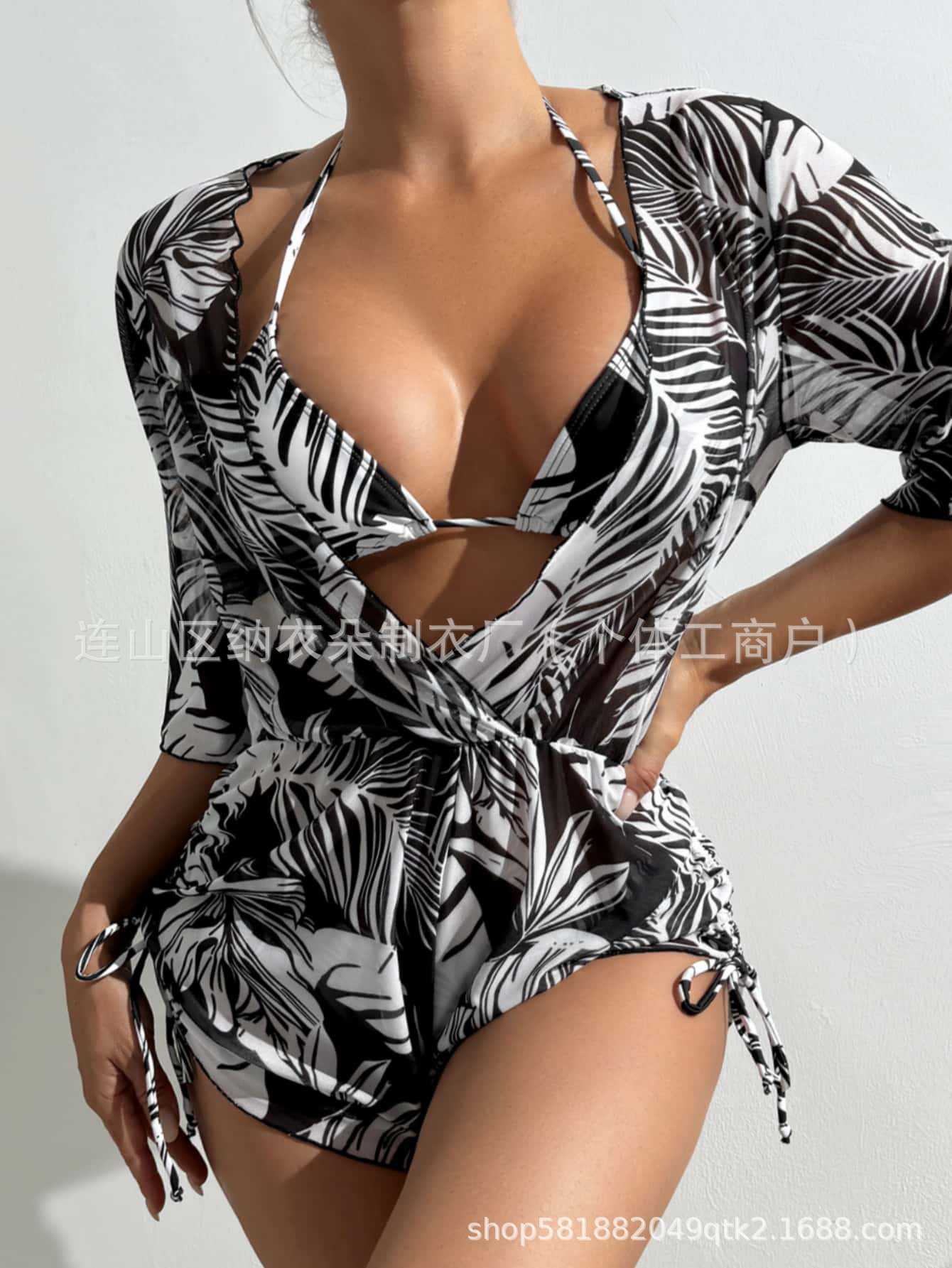 Купальник Пляжный солнцезащитный крем Тропический растительный принт блузка купальник женский европейский и американский трансграничный набор бикини из трех частей