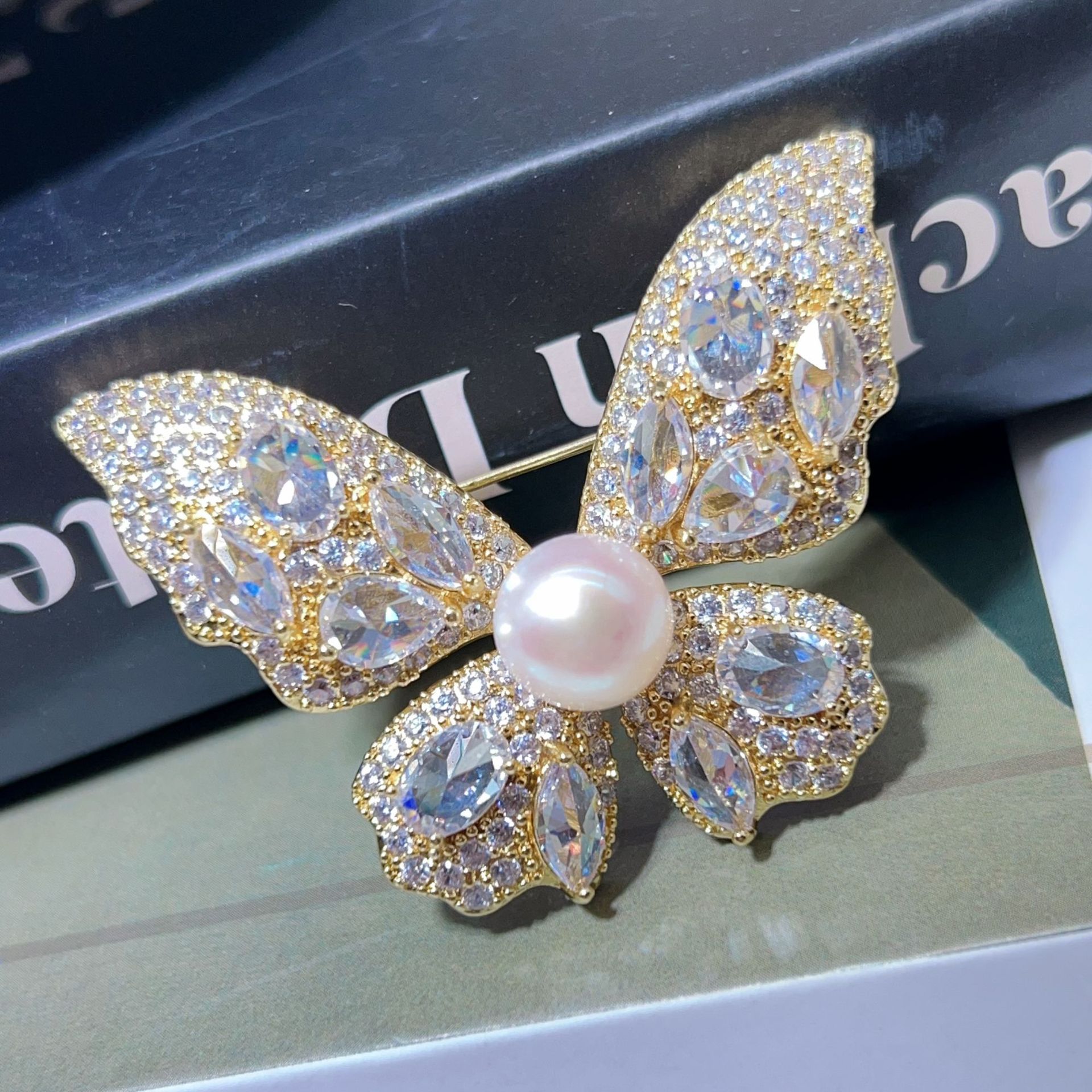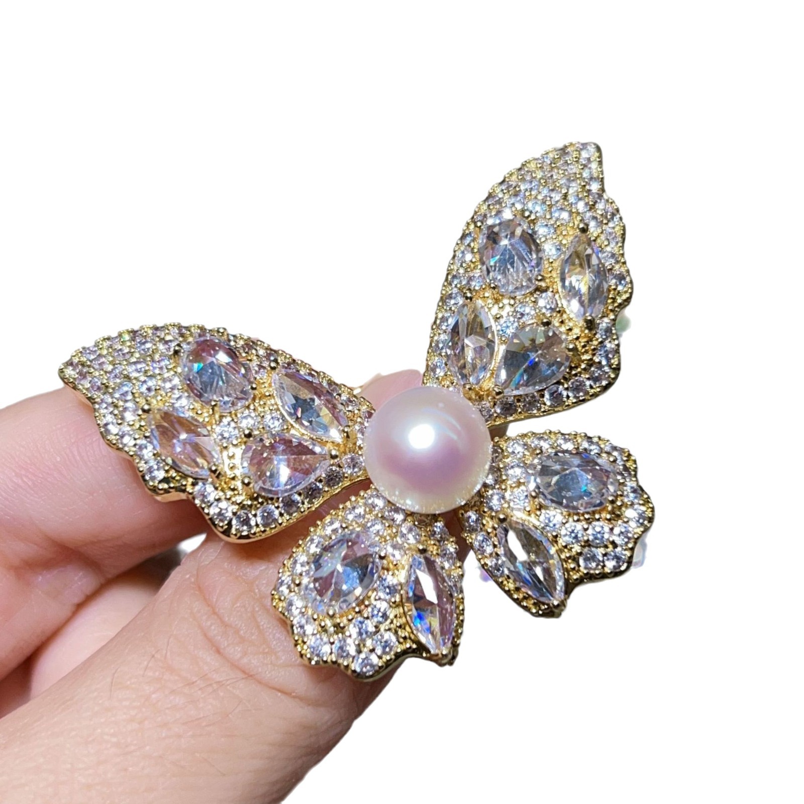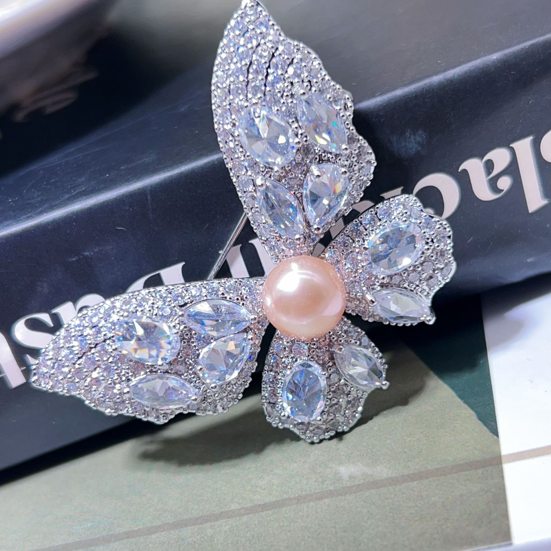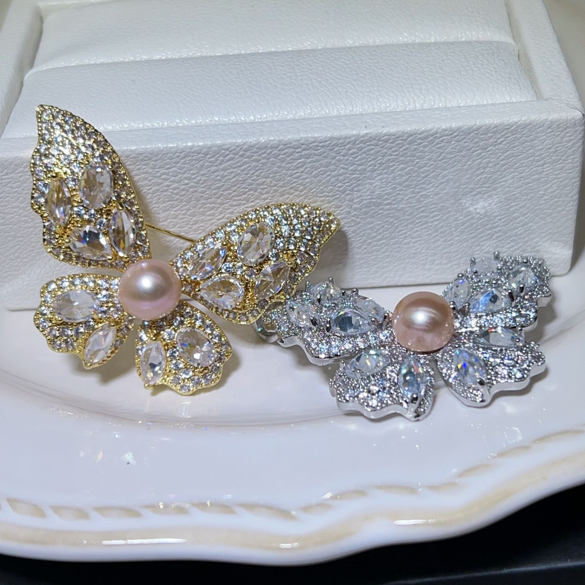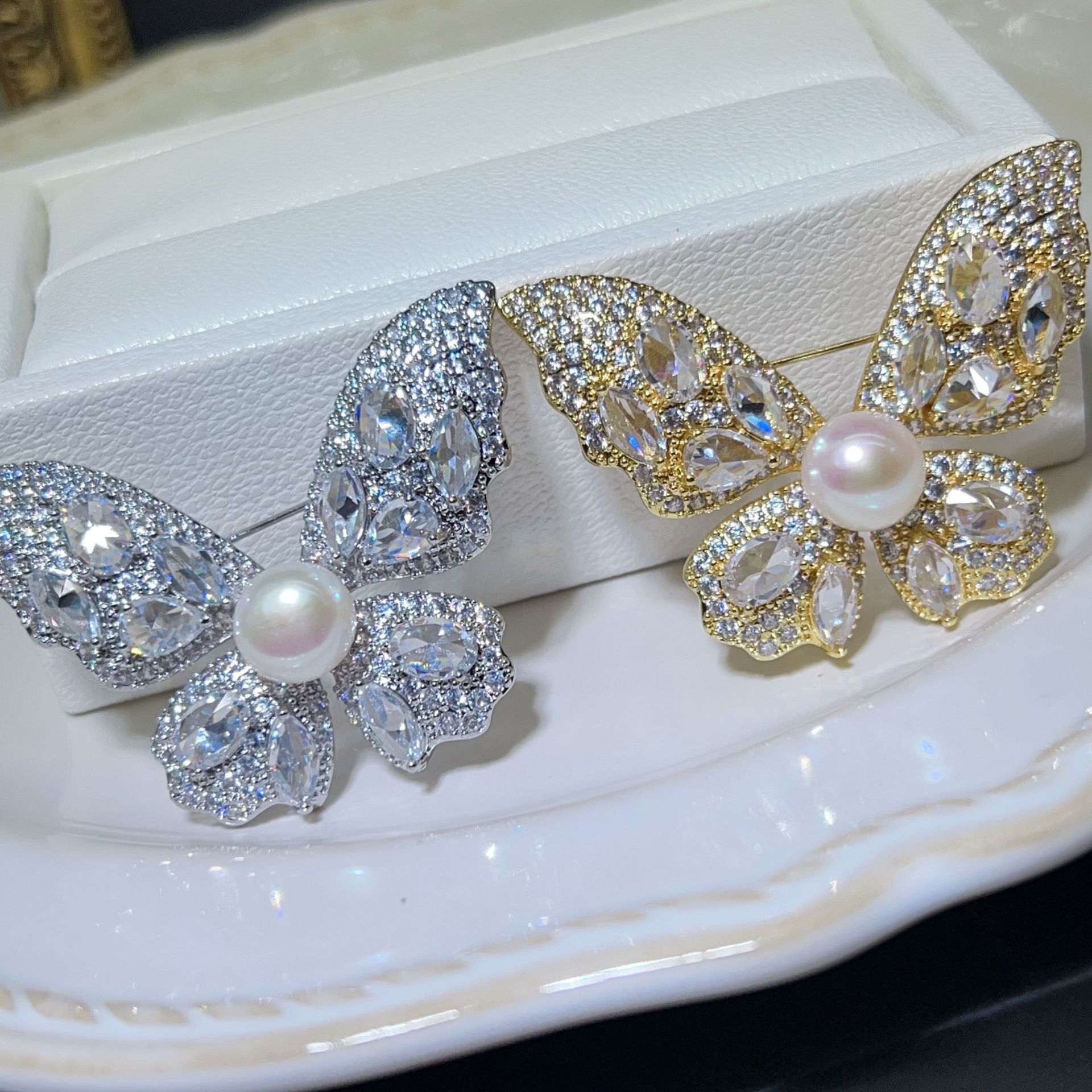 Брошь с жемчугом, оптовая продажа, циркон, роскошный стиль, жемчужная брошь в стиле бабочки, 8-9 мм, брошь с пресноводным жемчугом и костюмом