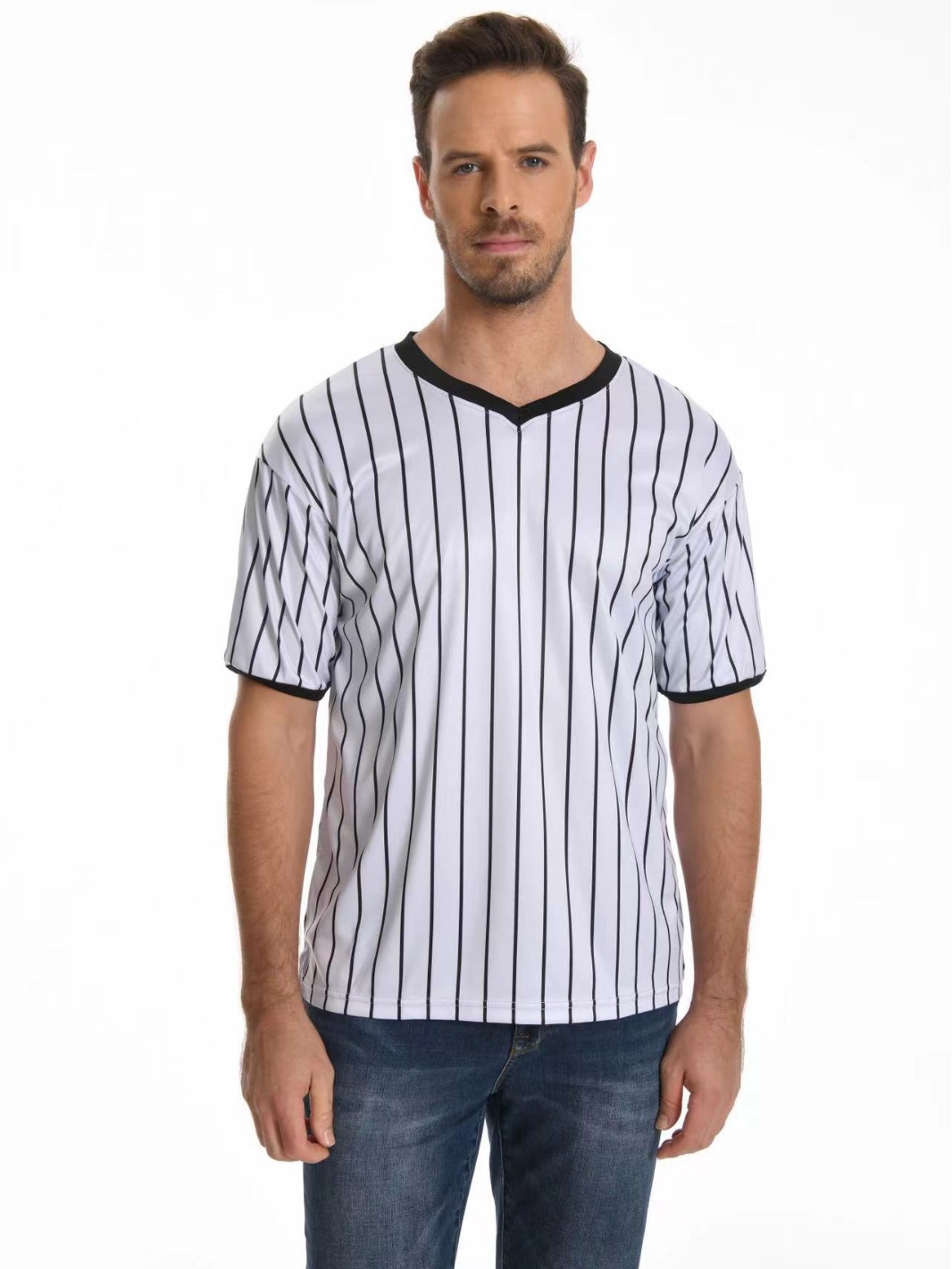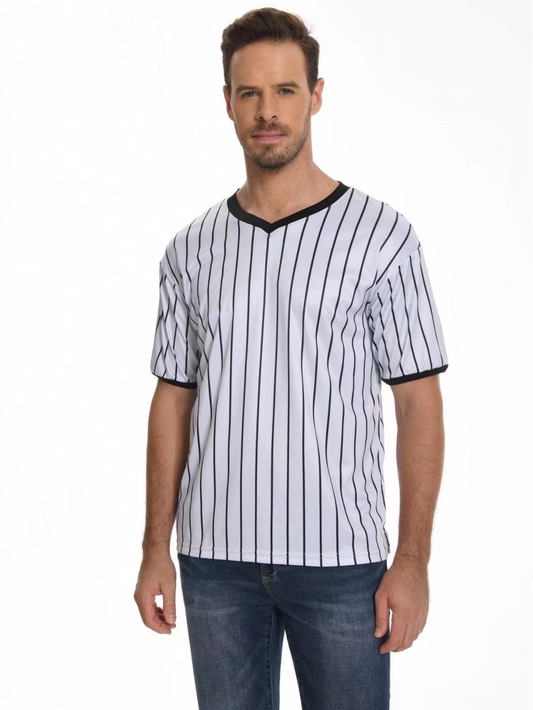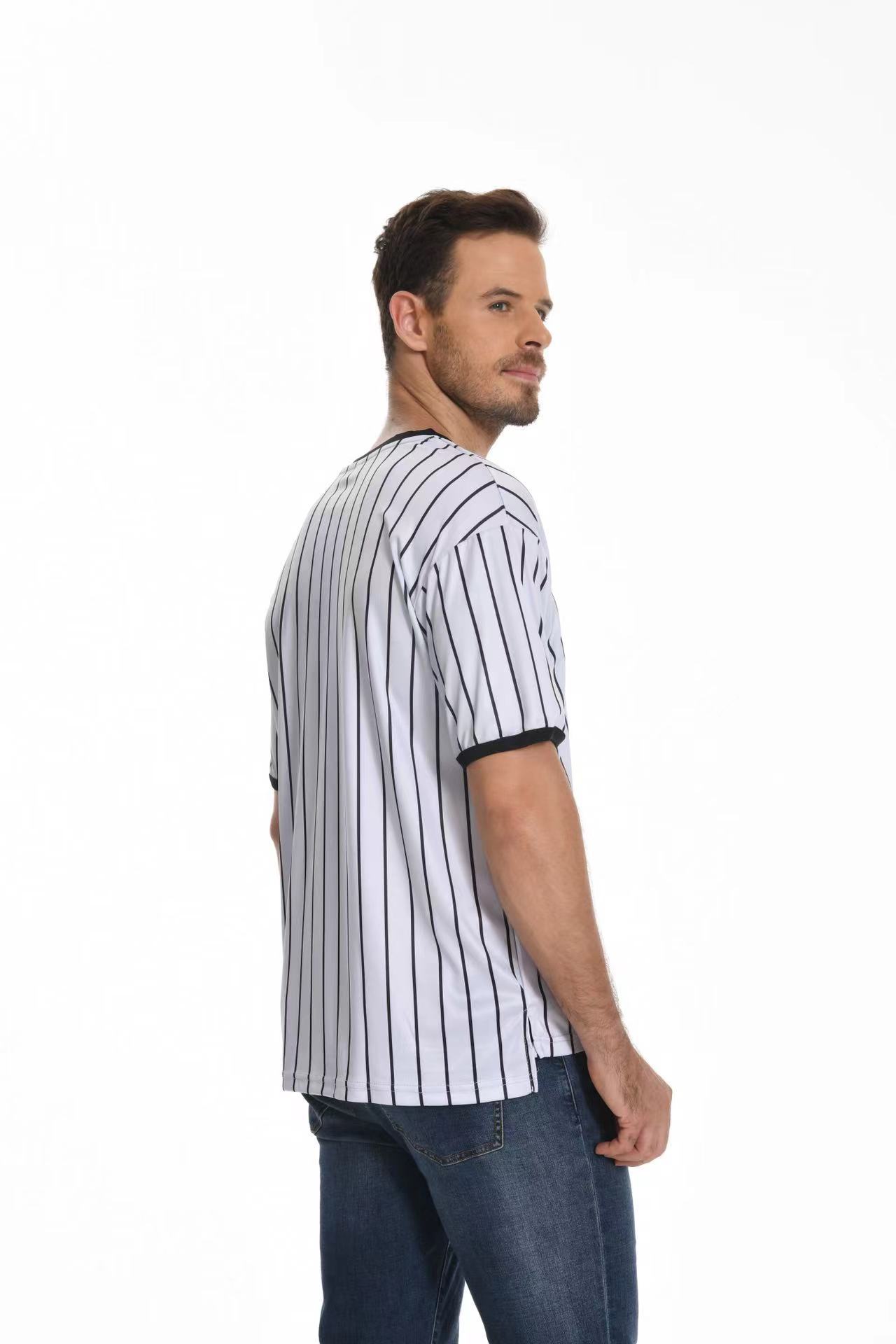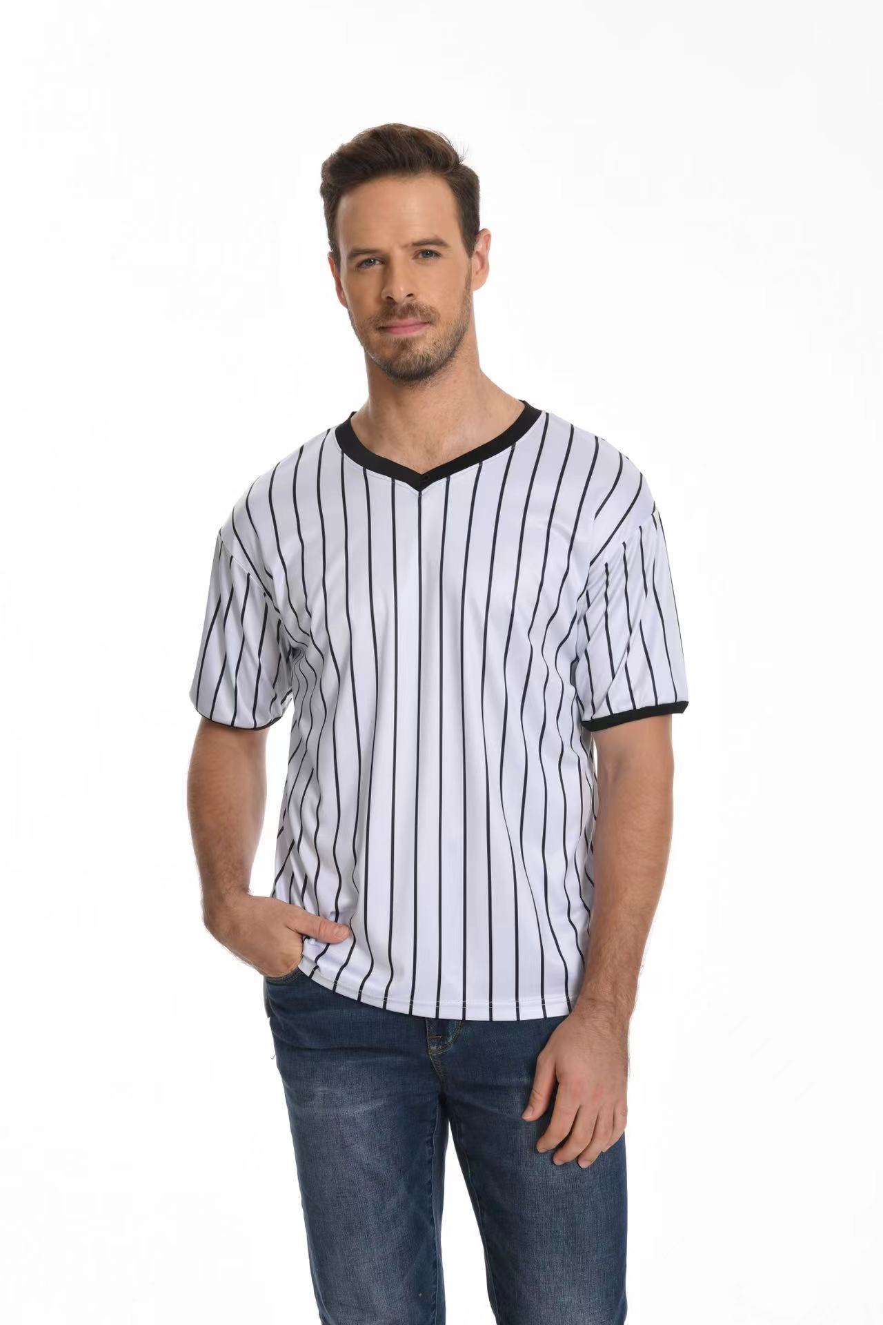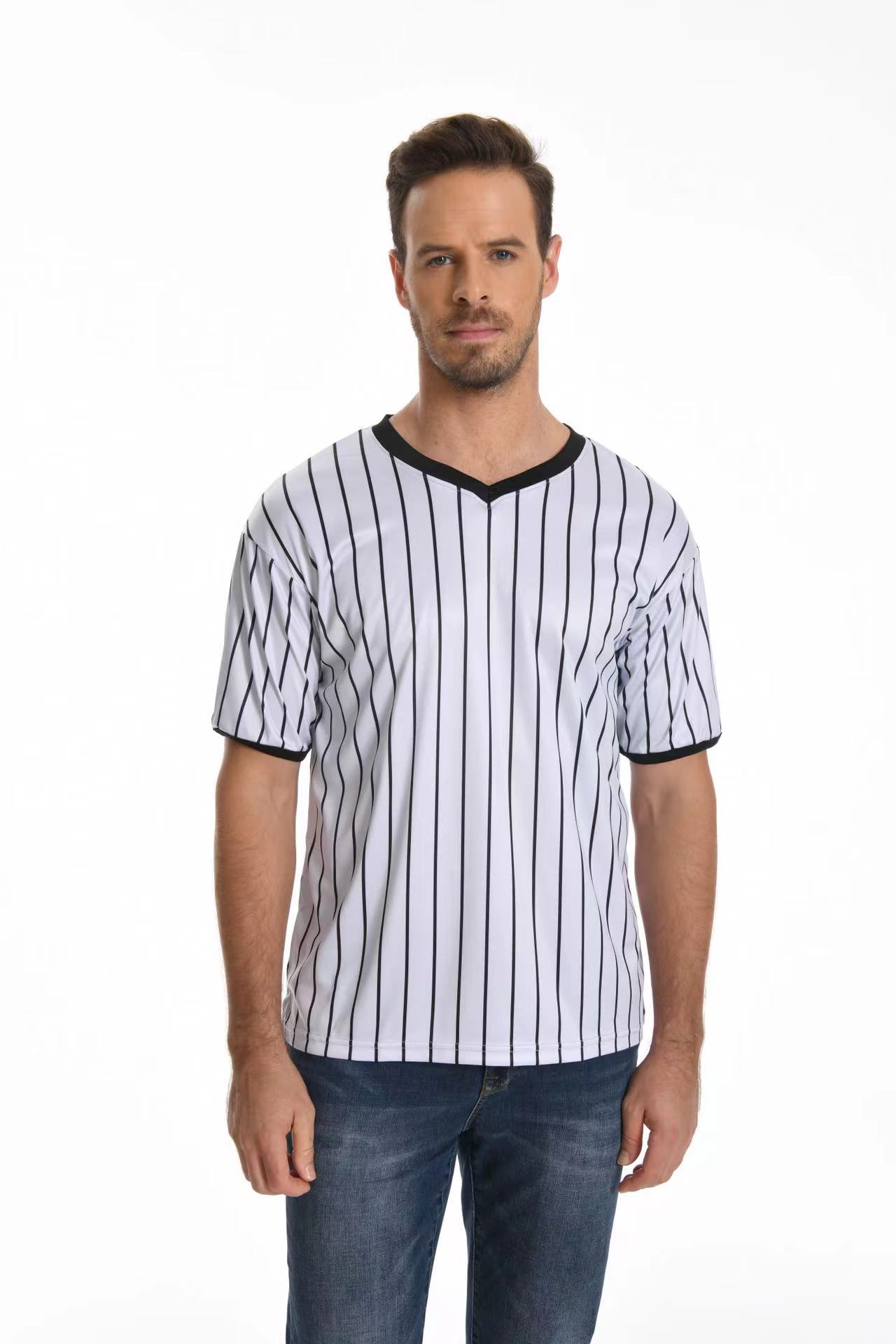 V-образный воротник производительность футболка в полоску рубашка влагопоглощающая пот с коротким рукавом баскетбольный футбольный рефери футболка в тонкую полоску