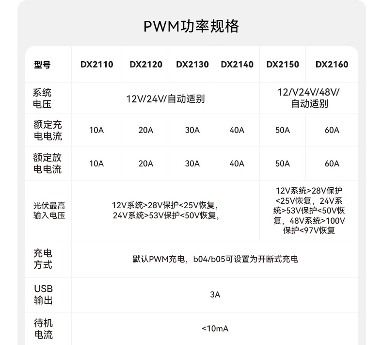 DX-10A 12V/24V; DX-20A 12V/24V; DX-30A 12V/24V; DX-40A 12V/24V; DX-50A 12V/24V/48V; DX-60A 12V/24V/48V