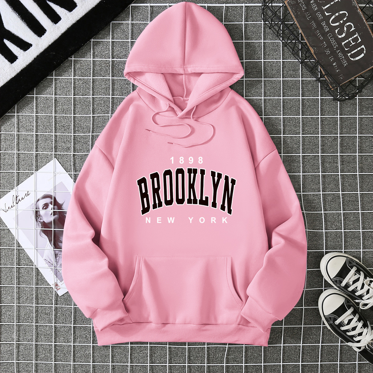 Осенняя и зимняя флисовая свободная женская толстовка с капюшоном трансграничная горячая продажа бруклинский принт пара пуловер толстовка