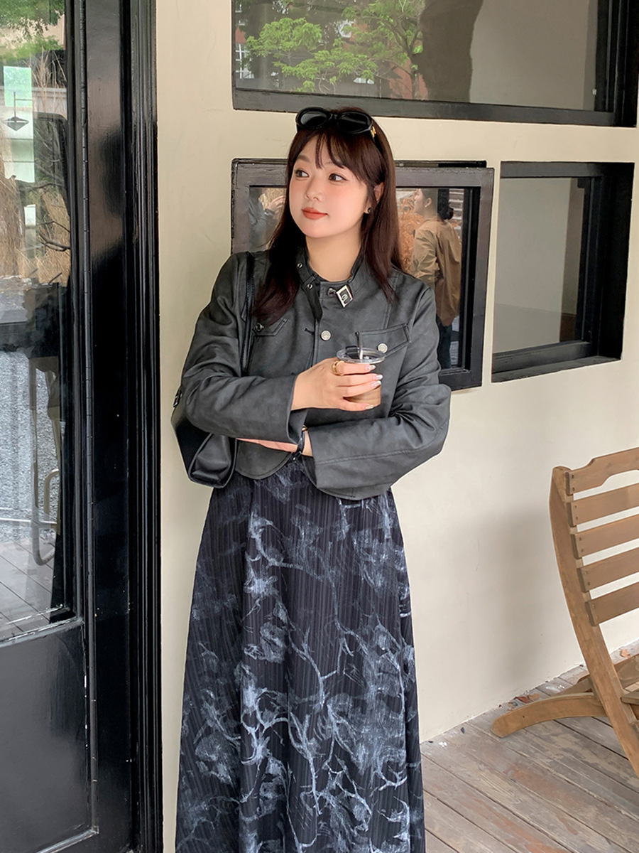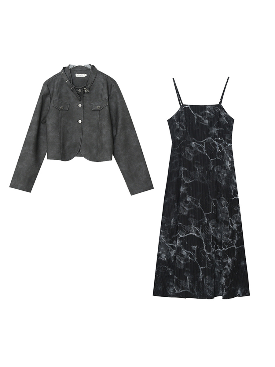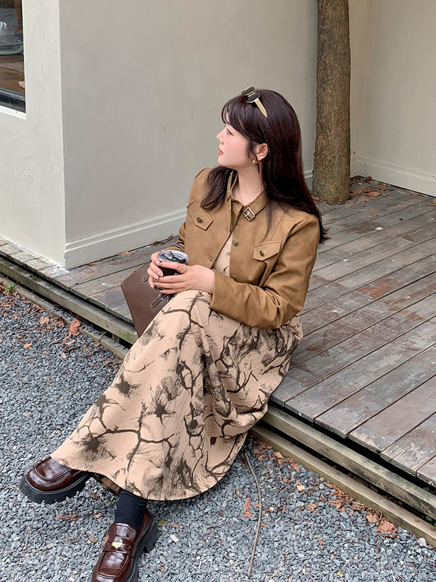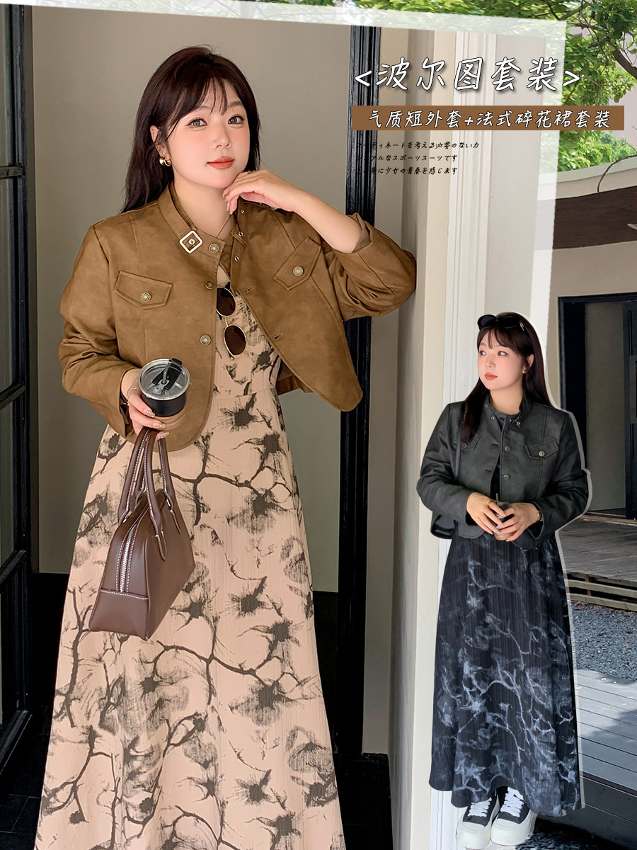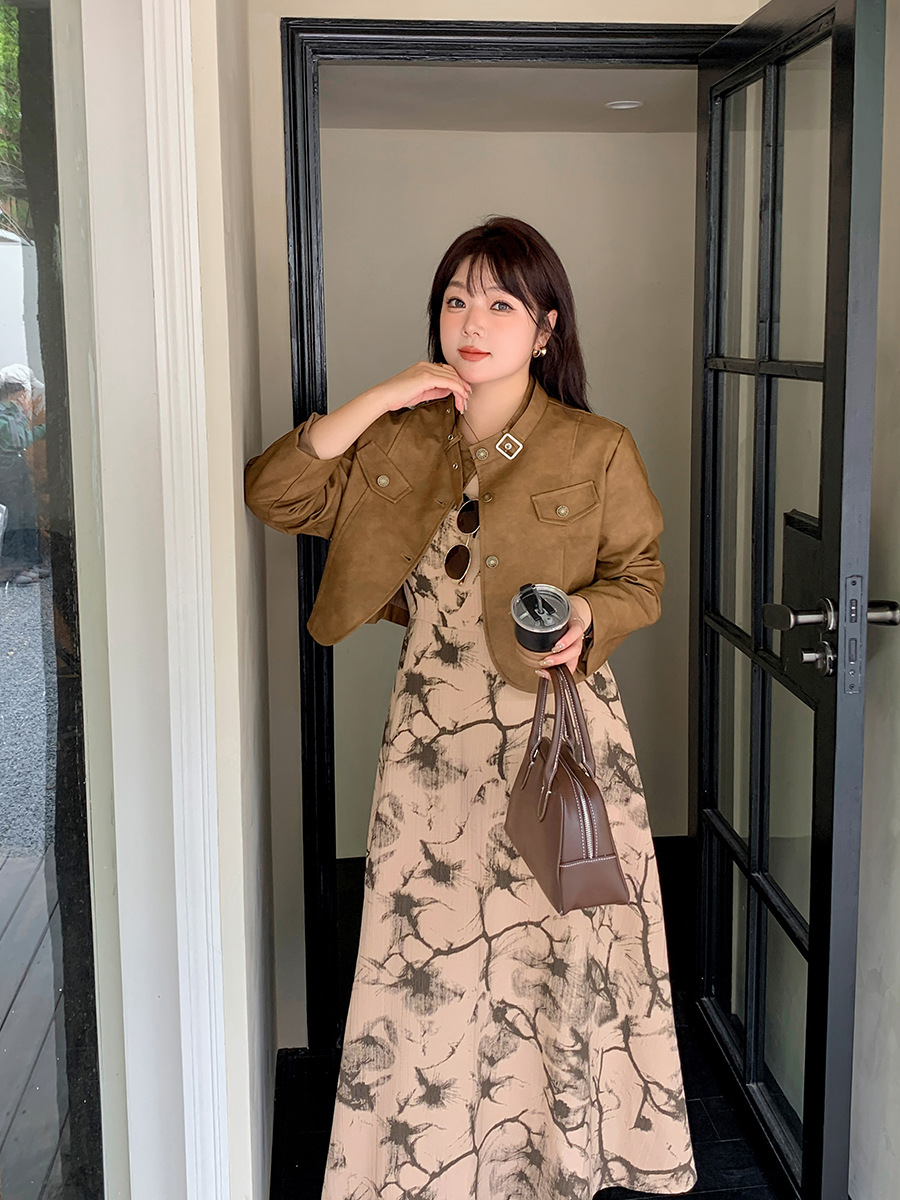 7923 Xuanchen слегка толстый ретро-модный набор из двух частей осенний новый большой размер PU куртка цветочный костюм подтяжка
