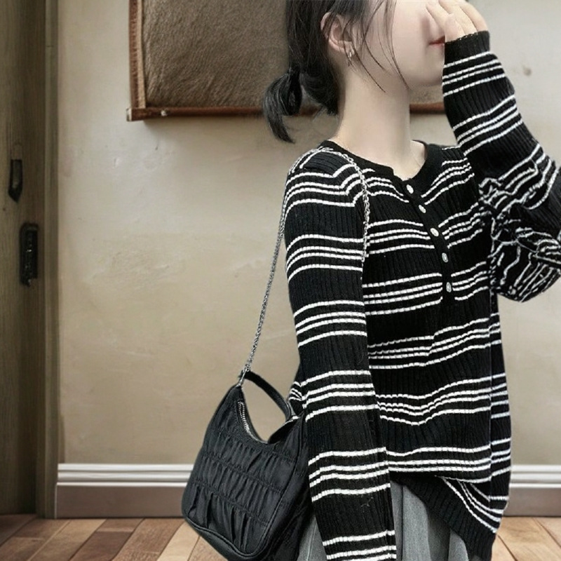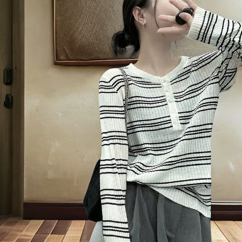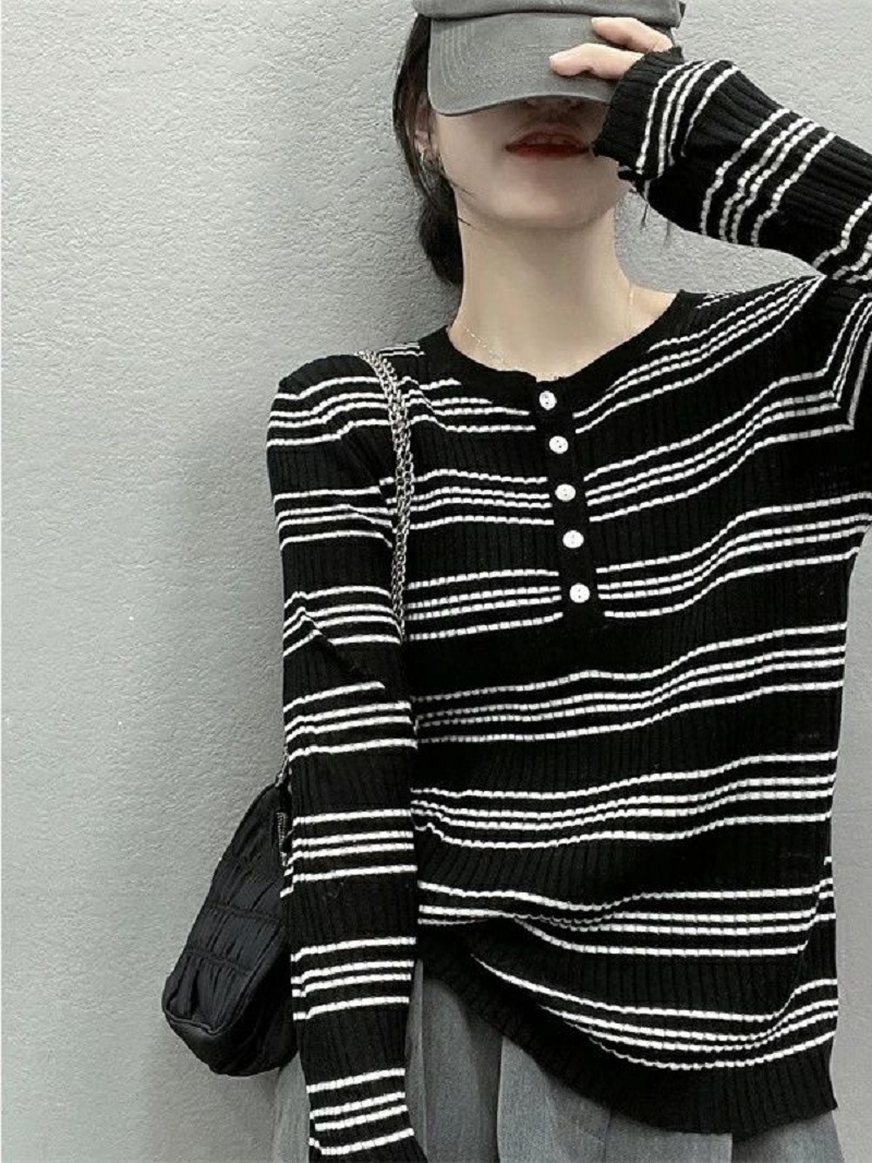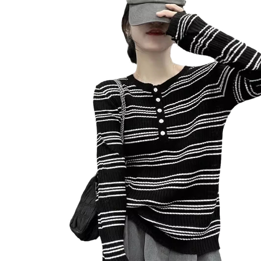 200 фунтов большой размер женский полосатый трикотаж топ осень новая мода иностранная корейская версия дикие свободные длинные рукава