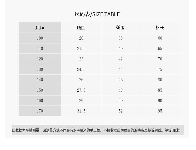 100cm; 110cm; 120cm; 130cm; 140cm; 150cm; 160cm; 170cm