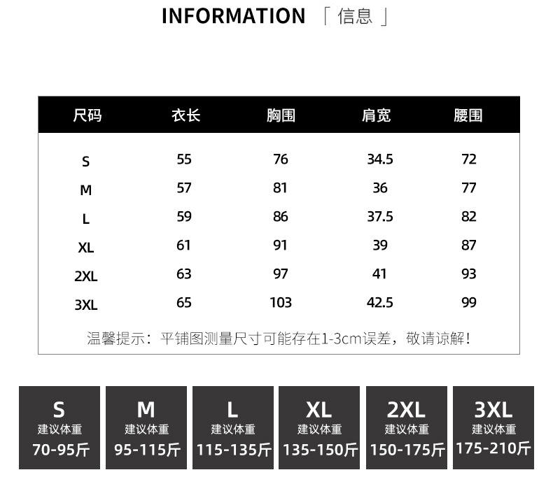 S (подходит 35-47.5kg одежда); М (подходит 47.5-57.5kg одежда); L (подходит 57.5-67.5kg одежда); XL (подходит для 67.5-75kg одежды); 2XL (подходит для 75-87.5kg одежды); 3XL (подходит для 87.5-100kg одежды)