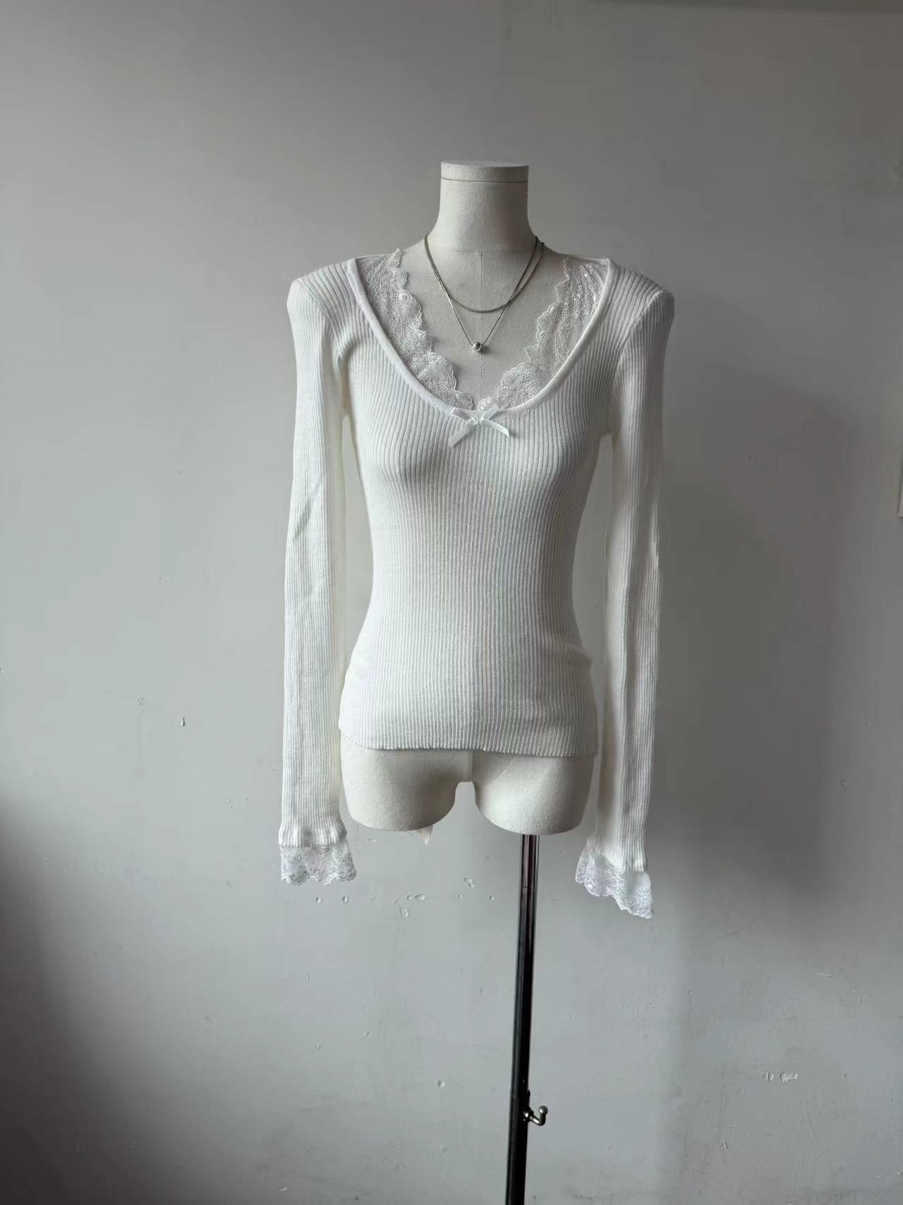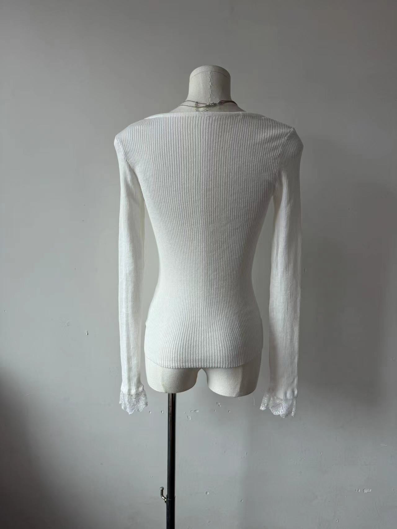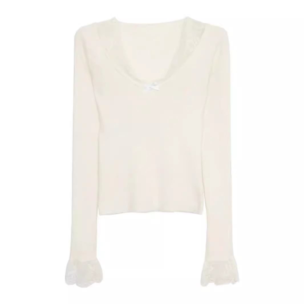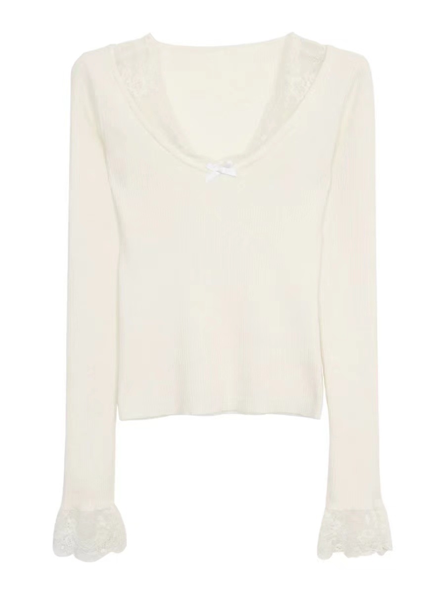 Kumikumi чисто сексуальный кружевной шитье свитер с длинными рукавами