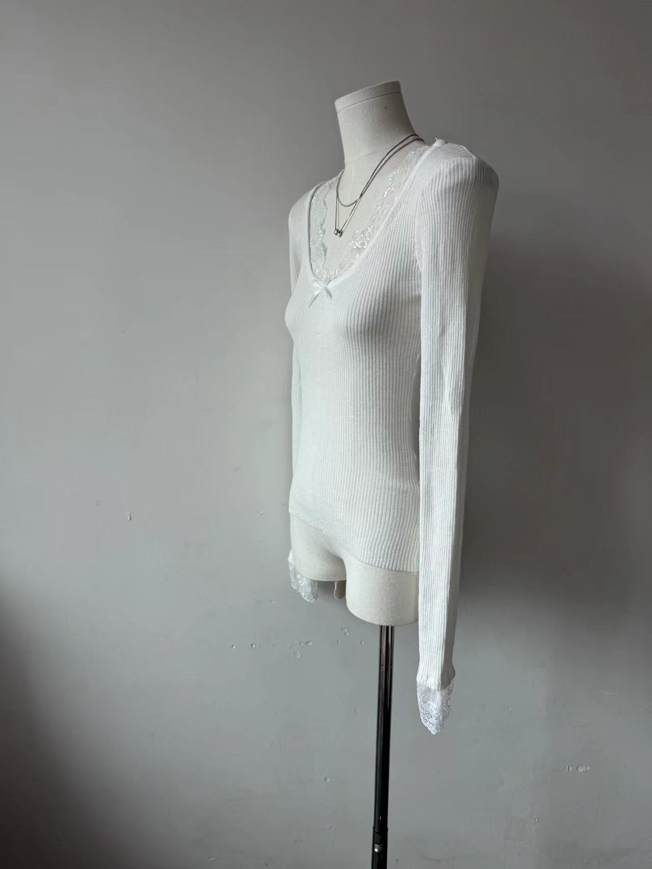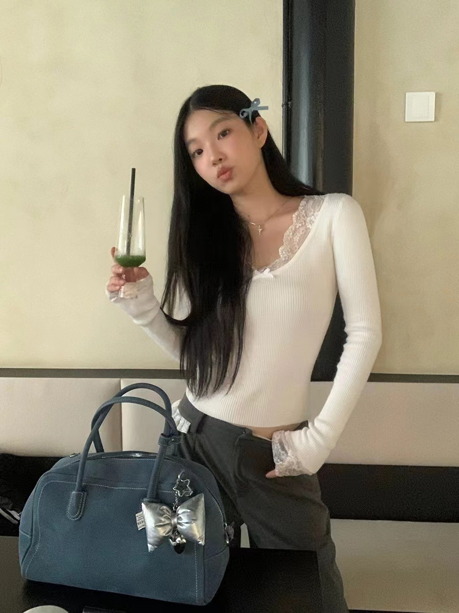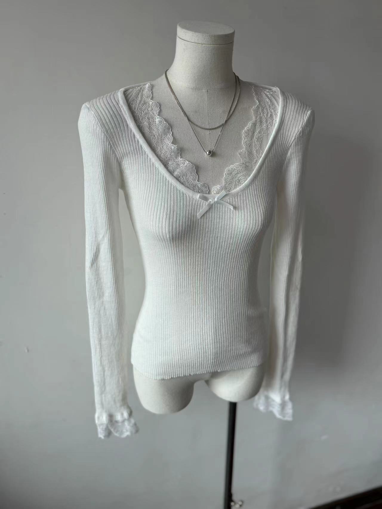 Kumikumi чисто сексуальный кружевной шитье свитер с длинными рукавами