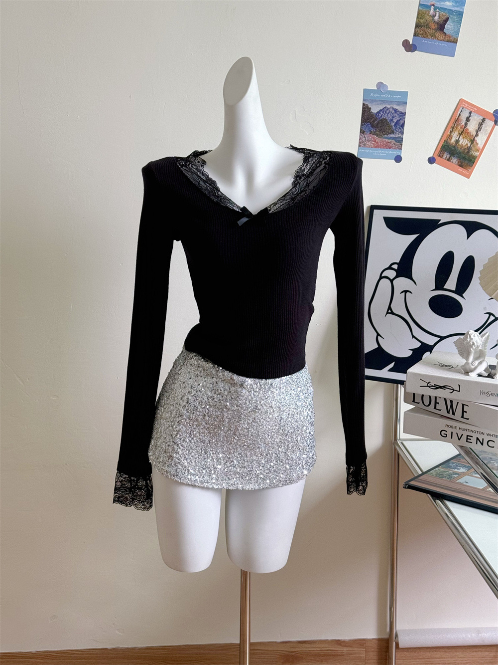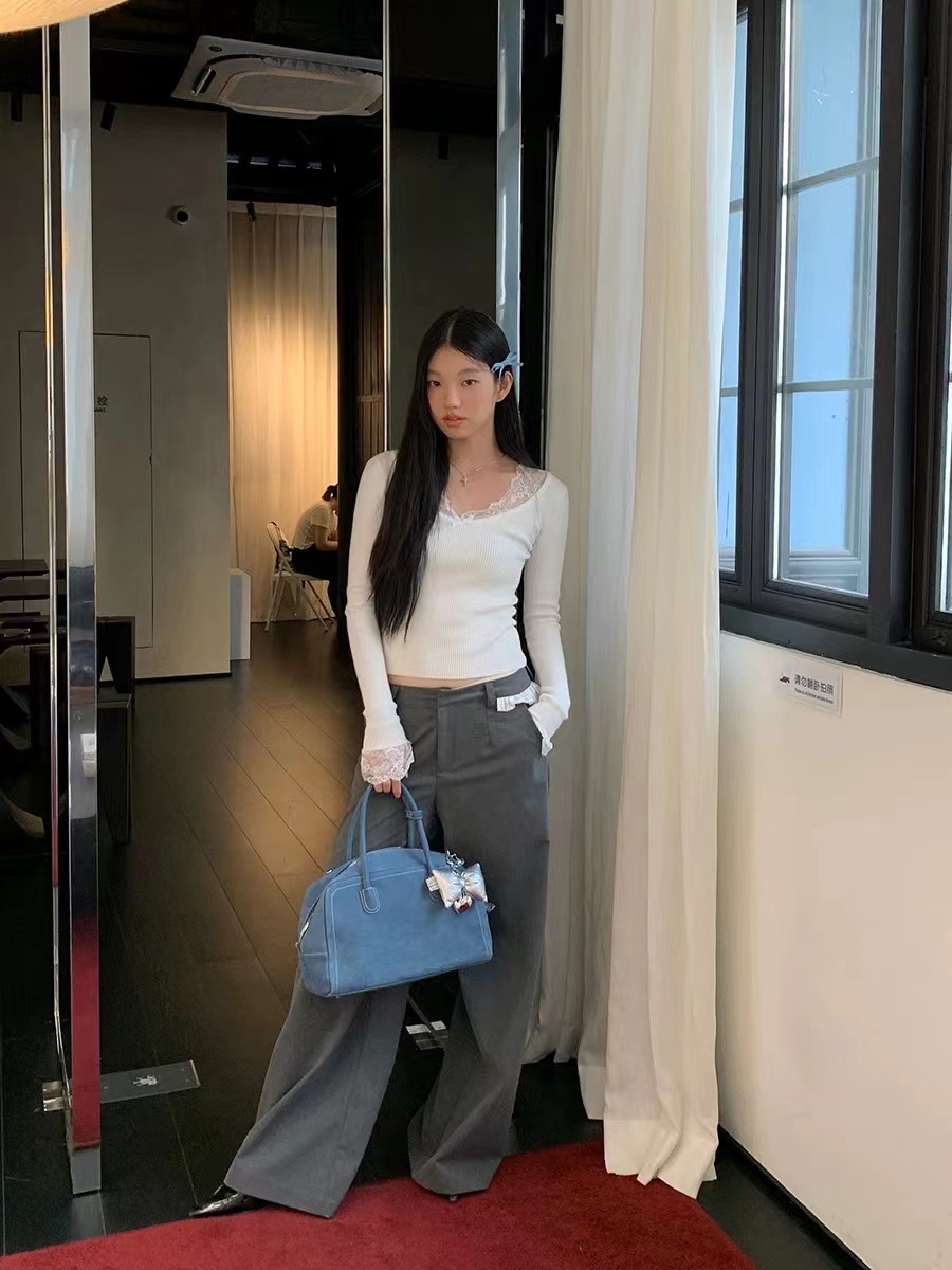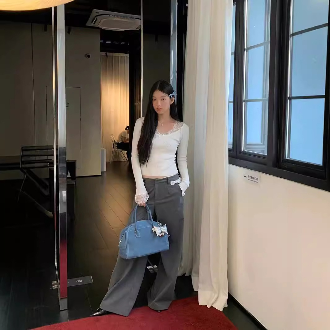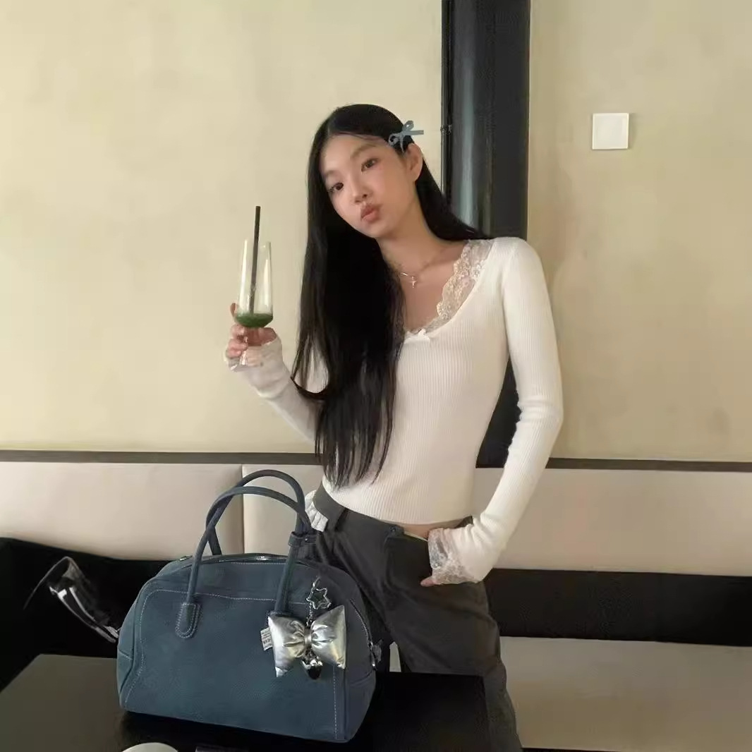 Kumikumi чисто сексуальный кружевной шитье свитер с длинными рукавами
