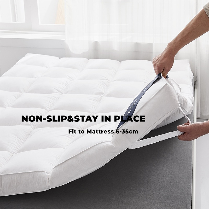 Featuring breathable down alternative gel-fiber filling and skin-friendly soft brushed polyester fabric, this mattress topper is a great solution for people who are sensitive to feather-down mattress toppers or suffering from the odors or the heat retaining of a memory foam mattress topper. No more sweaty night with a memory foam mattress topper.