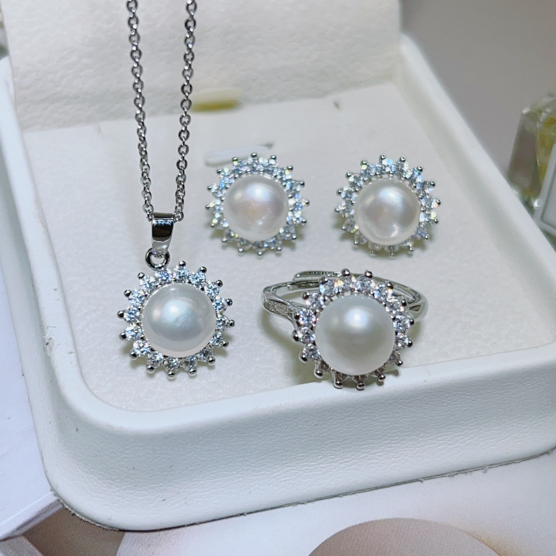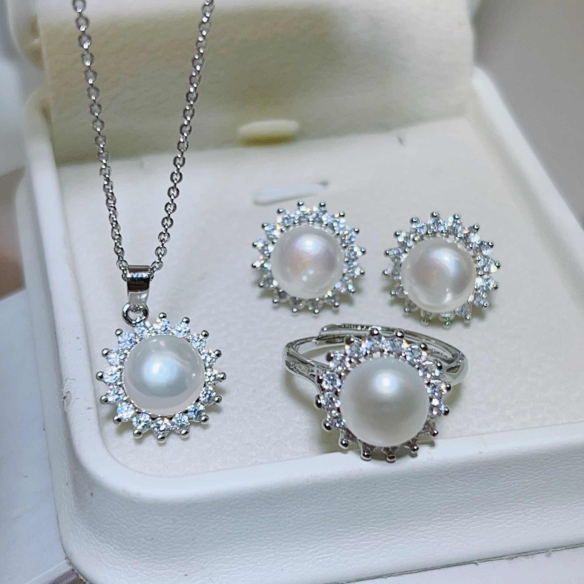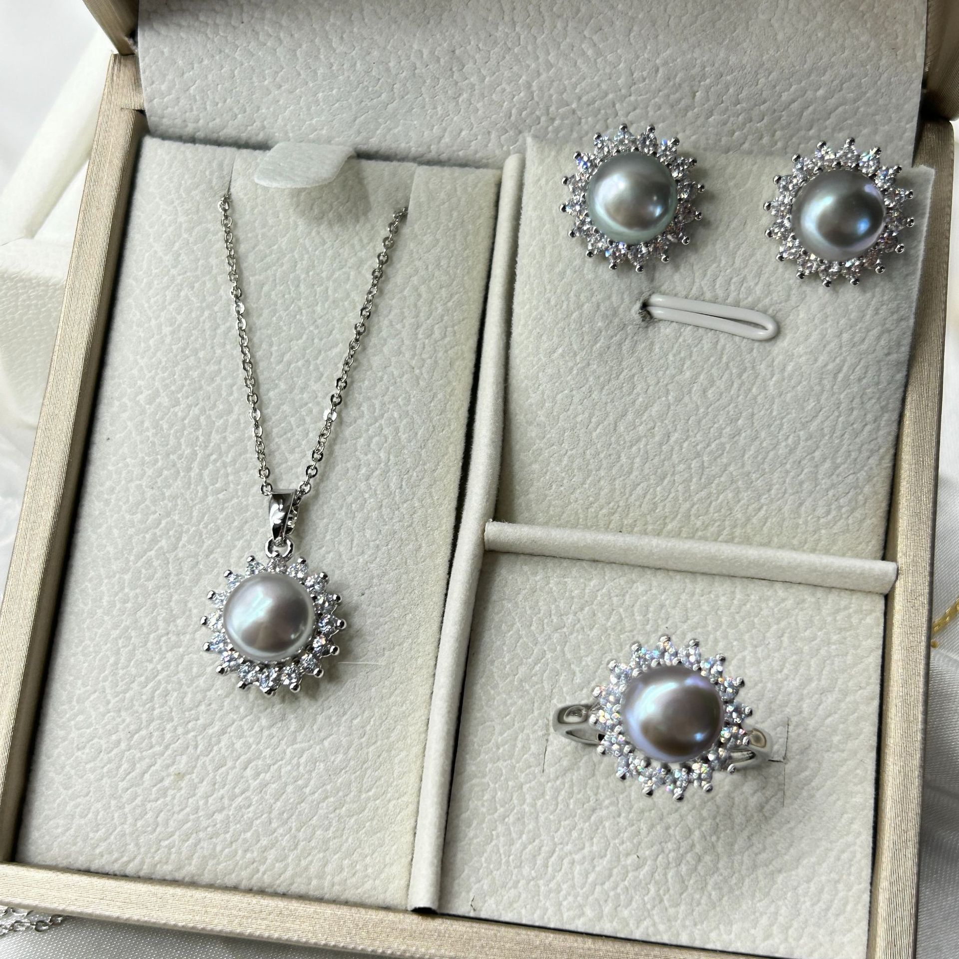 серьги с белым жемчугом; серьги с розовым жемчугом; серые жемчужные серьги; кольцо с белым жемчугом; кольцо с розовым жемчугом; серые жемчужное кольцо; ожерелье из белого жемчуга; ожерелье с розовым жемчугом; ожерелье из серого жемчуга
