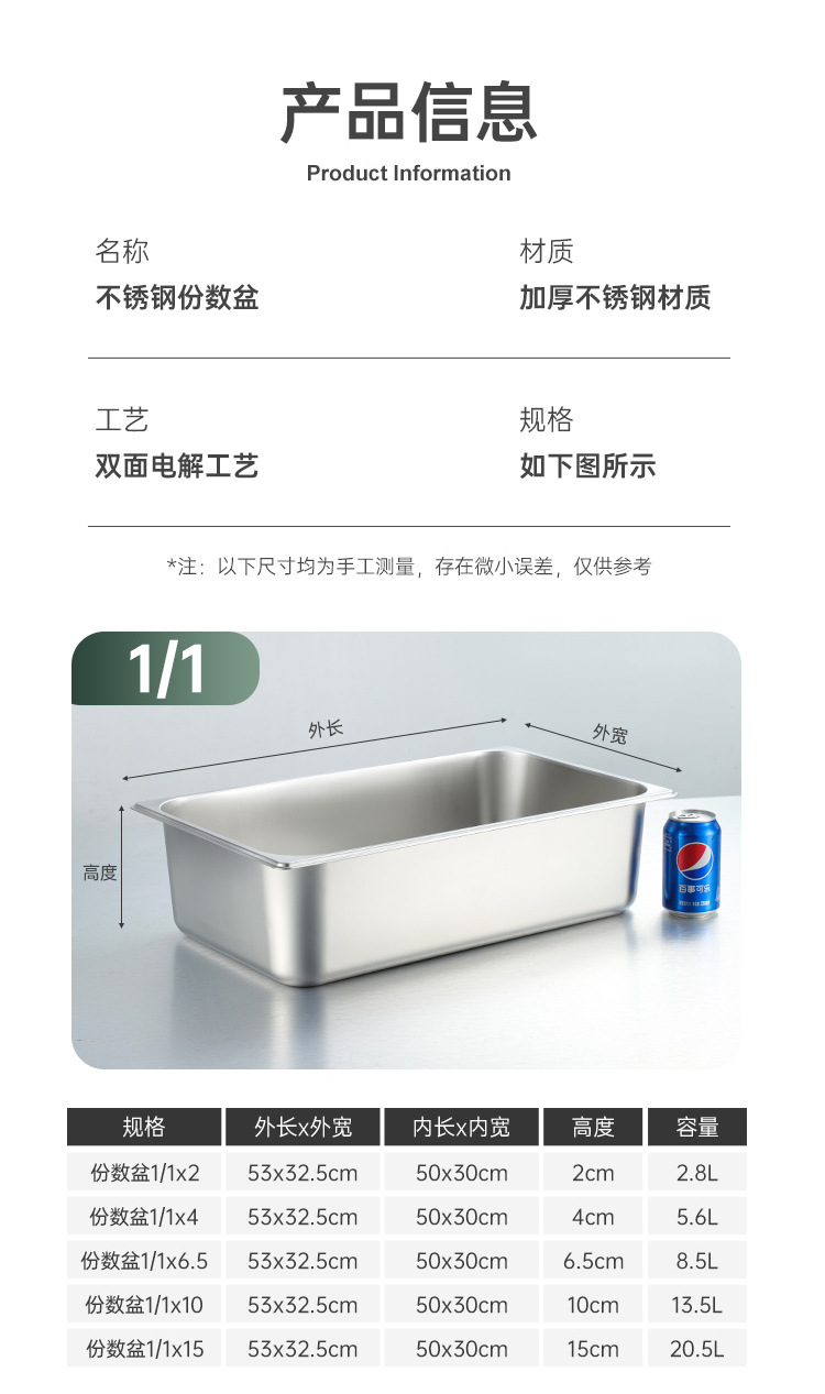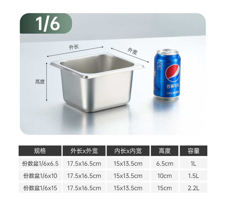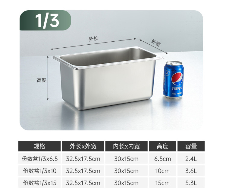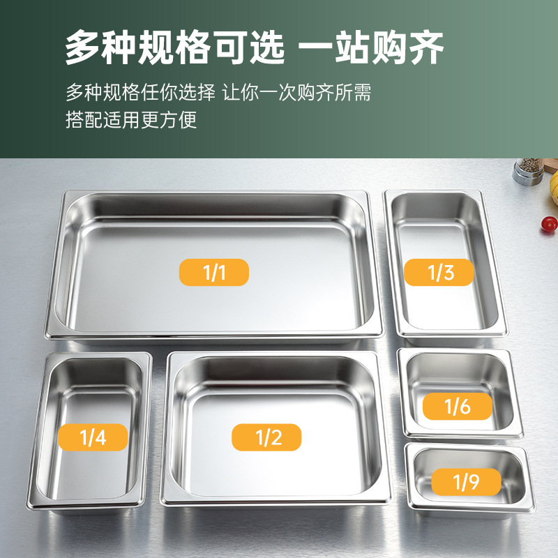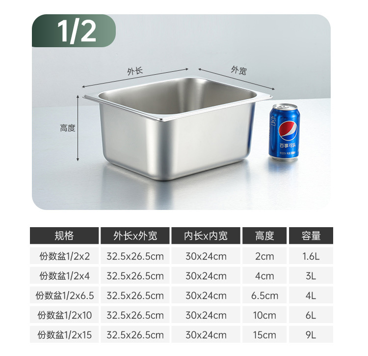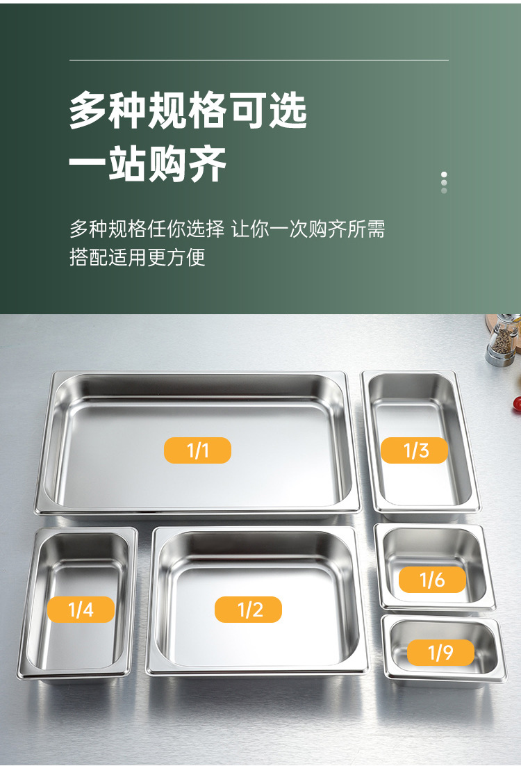 1/1【530*325*15CM】; 1/1【530*325*10CM】; 1/1【530*325*6.5CM】; 1/1【530*325*4CM】; 1/1【530*325*2.5CM】; 1/1 [загнутая крышка]; 1/2【325*265*15CM】; 1/2【325*265*10CM】; 1/2【325*265*6.5CM】; 1/2【325*265*4CM】; 1/2【325*265*2.5CM】; 1/2【закатаная крышка】; 1/3【325*175*15CM】; 1/3【325*175*10CM】; 1/3【325*175*6.5CM】; 1/3 [закатаная крышка]; 1/4【265*162*15CM】; 1/4【265*162*10CM】; 1/4【265*162*6.5CM】; 1/4 [закатаная крышка]; 1/6【176*162*15CM】; 1/6【176*162*10CM】; 1/6【176*162*6.5CM】; 1/6 [завитая крышка]; 1/9【176*108*15CM】; 1/9【176*108*10CM】; 1/9【176*108*6.5CM】; 1/9 [закатаная крышка]