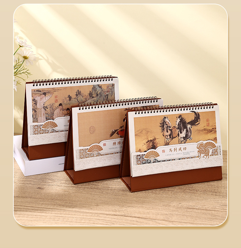 Настольный календарь-органайзер 2026 в китайском стиле «Тысячи рек и гор» с печатью логотипа и золотым тиснением, на спиральном переплете